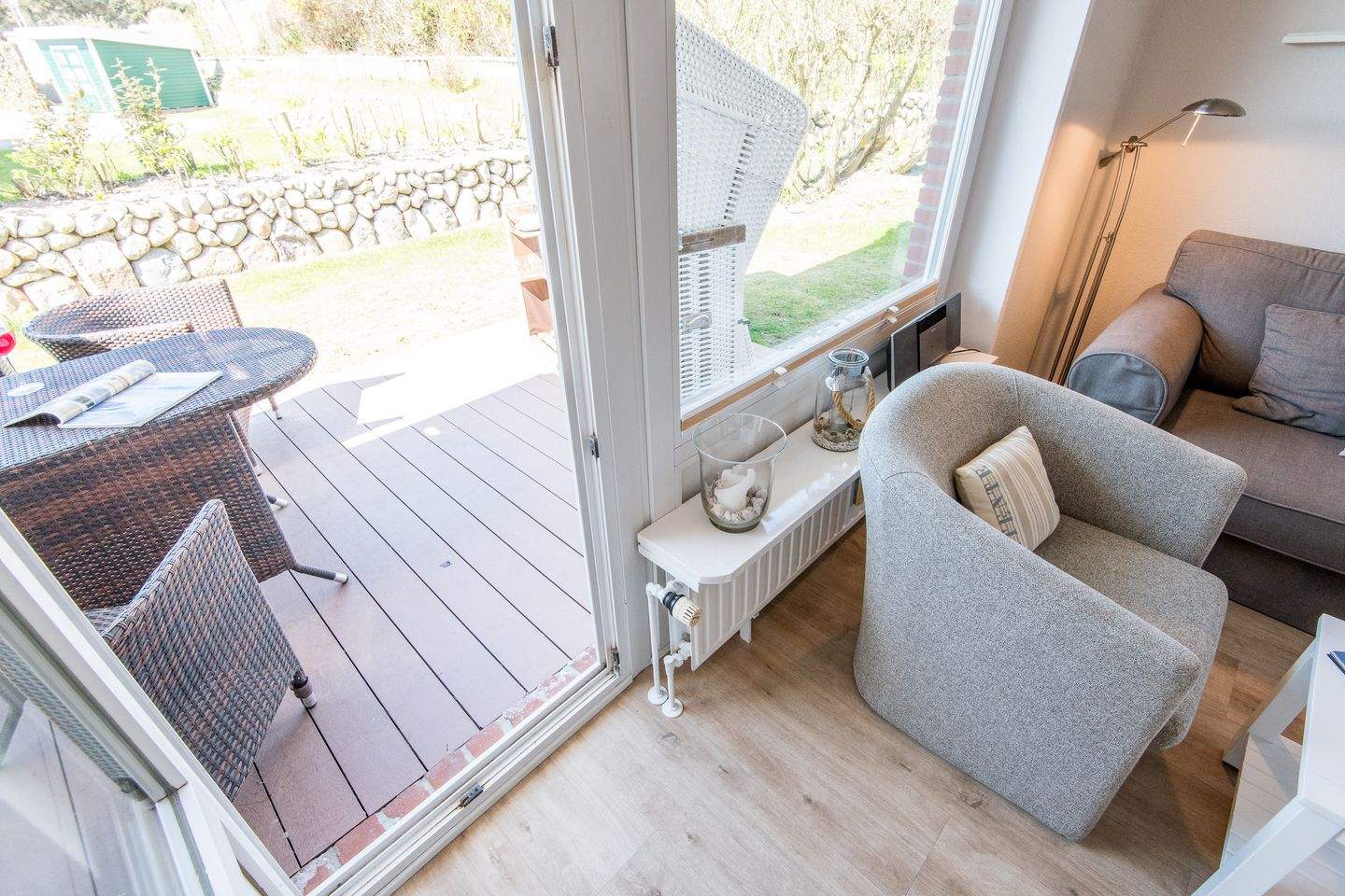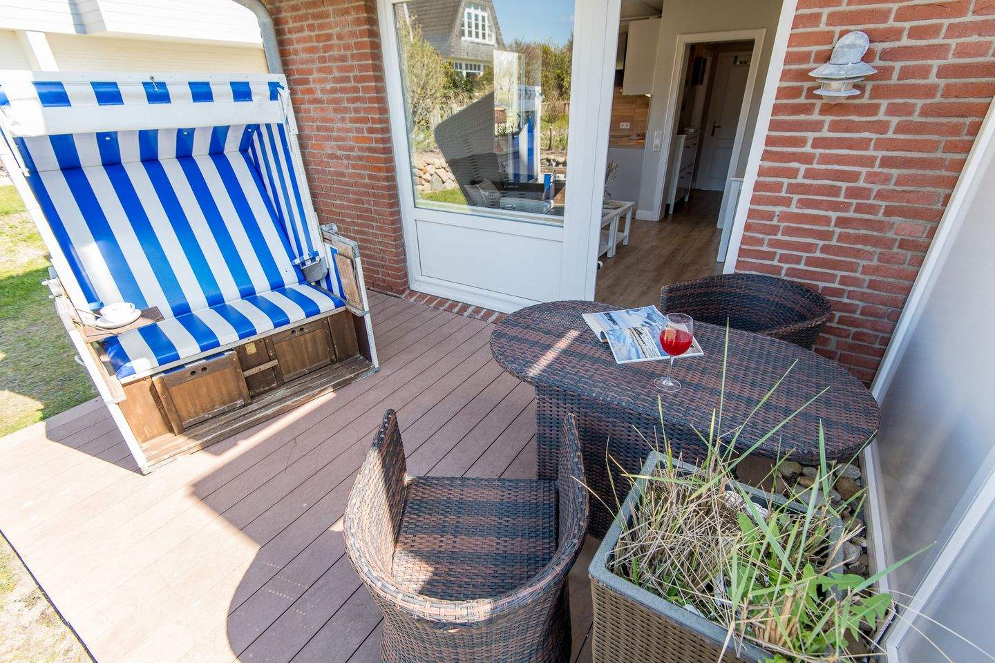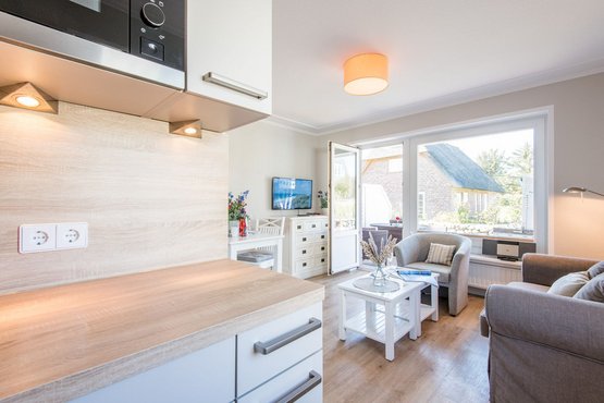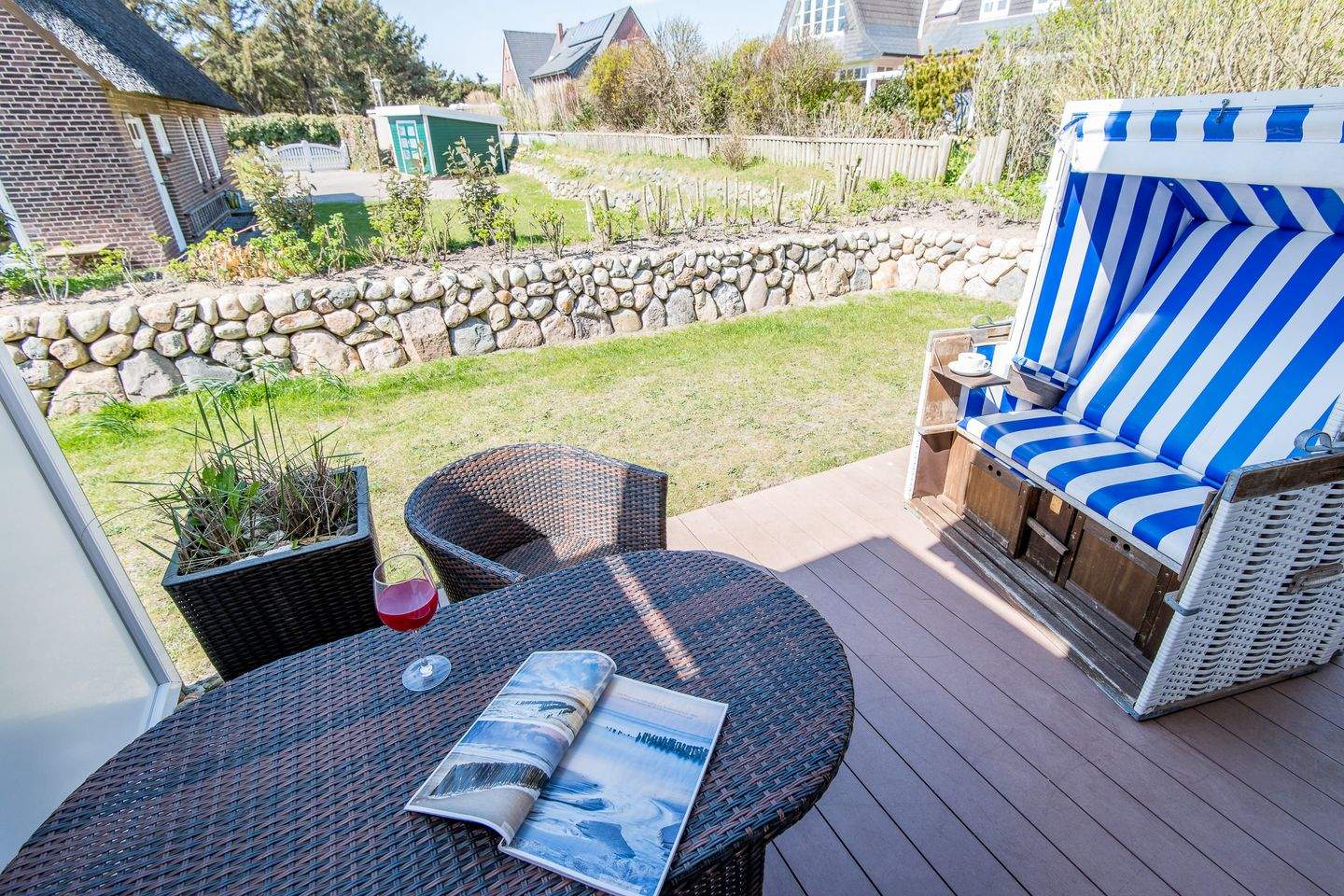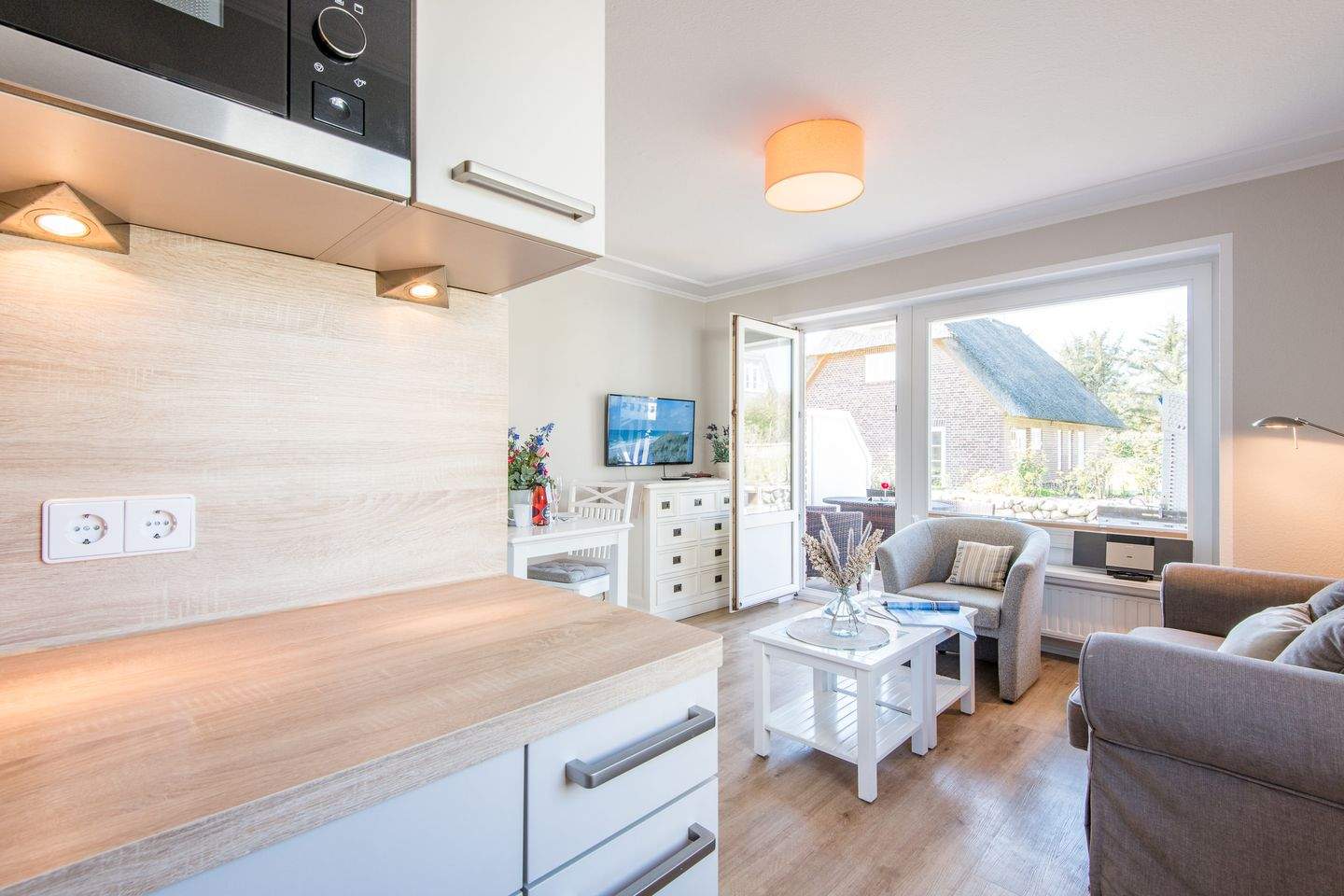 Direkt hinter den Dünen in Westerland auf Sylt, inklusive Meeresrauschen. Nichtraucherwohnung. Hunde willkommen (Hunde dürfen auf dem gesamten Grundstück nur noch an der Leine geführt werden, auch auf den Terrassen). Wohnzimmer mit Sofa, Korbsessel, TV und direktem Zugang zur Terrasse nach Westen mit Saison-Strandkorb (ca. April-September). Essecke mit Tisch und zwei Stühlen. Offene Einbauküche mit Cerankochfeld, Mikrowelle, Geschirrspüler, Filterkaffeemaschine und dem üblichen Komfort.