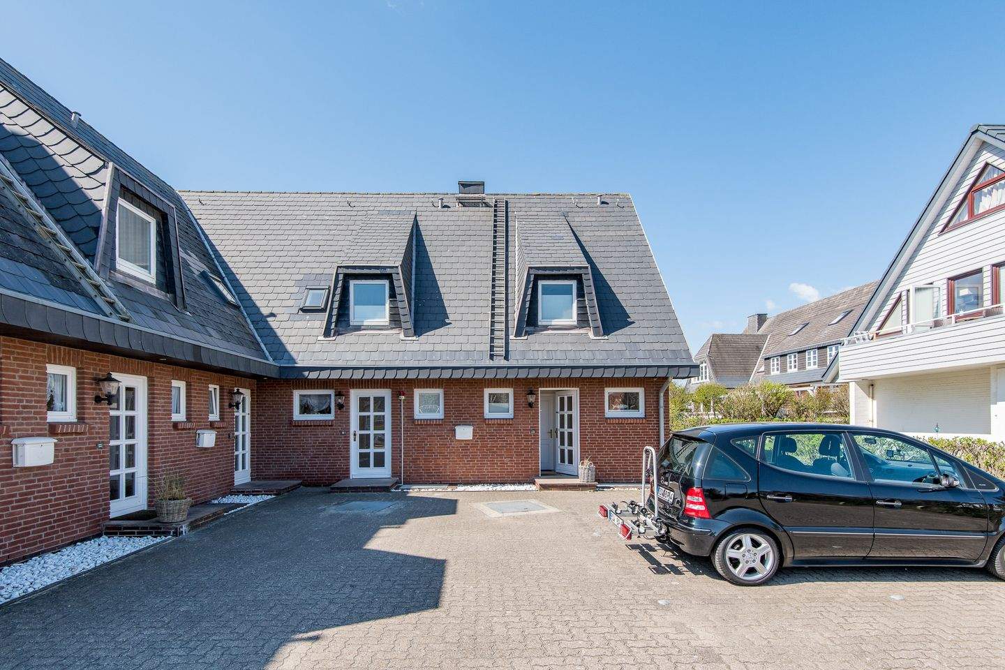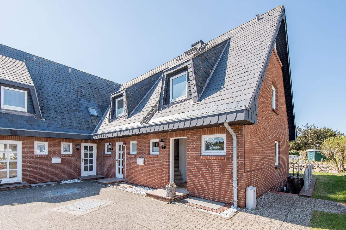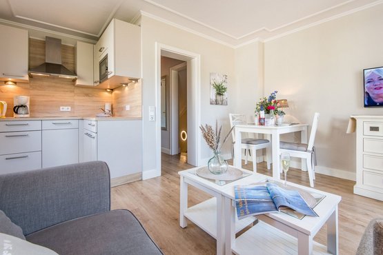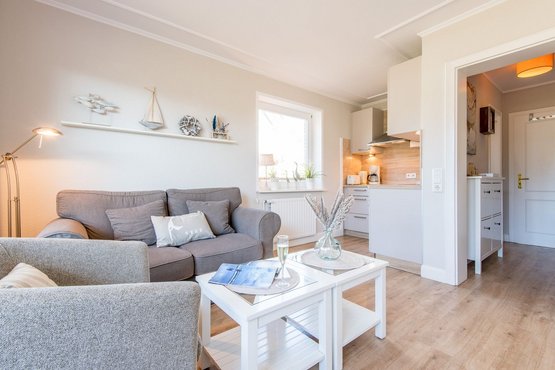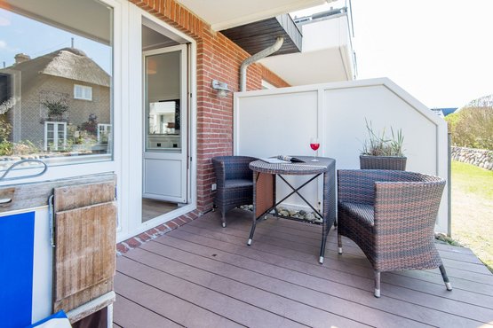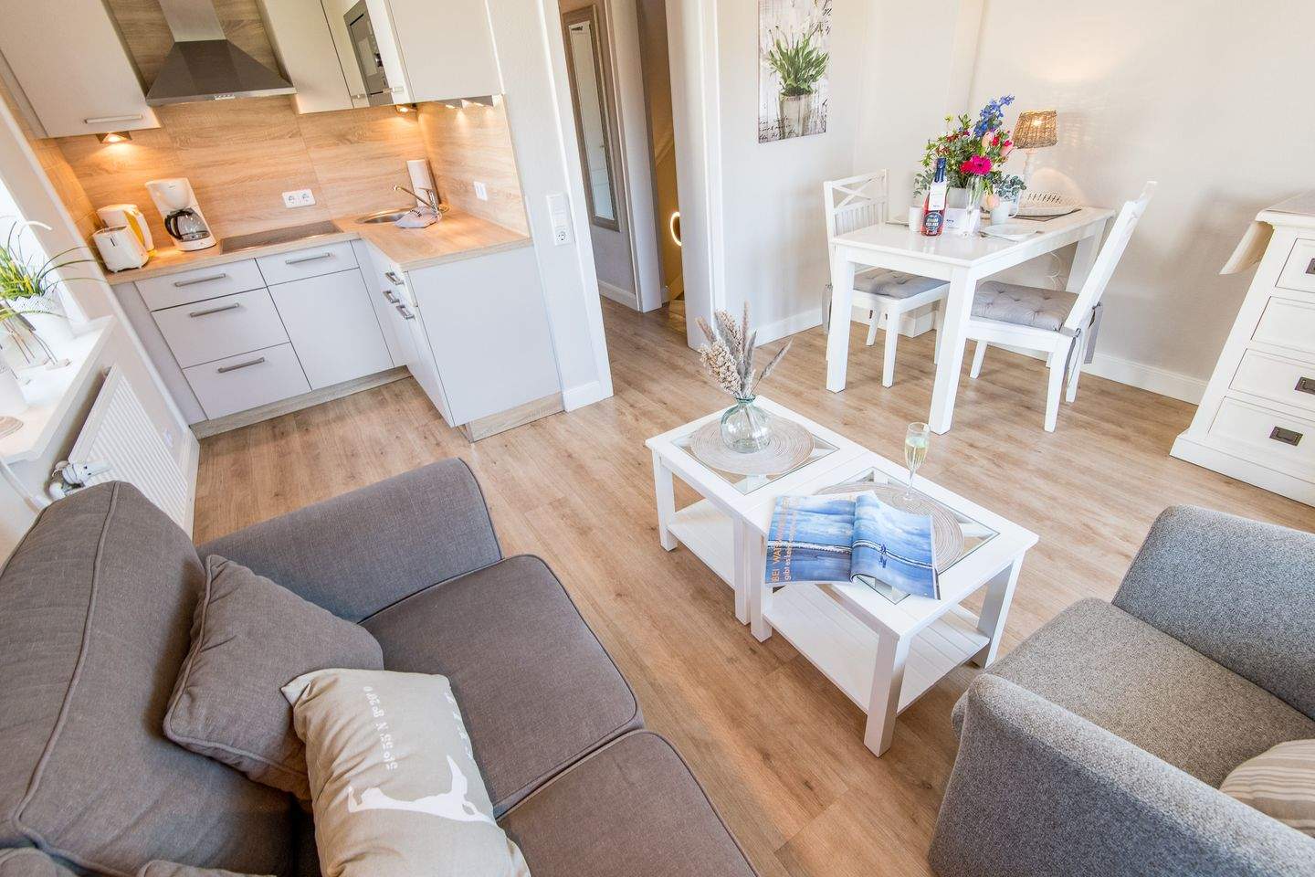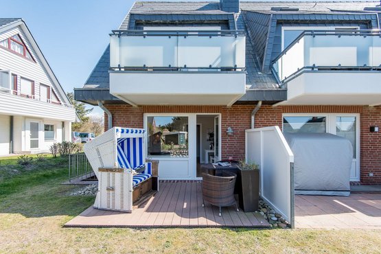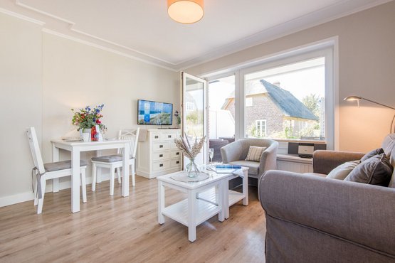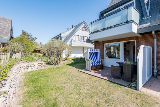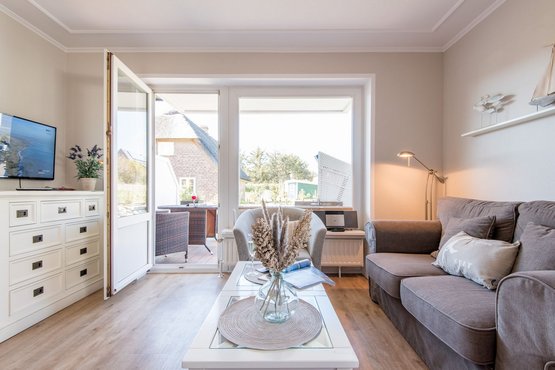 Direkt hinter den Dünen in Westerland auf Sylt, inklusive Meeresrauschen. Nichtraucherwohnung. Hunde willkommen (Hunde dürfen auf dem gesamten Grundstück nur noch an der Leine geführt werden, auch auf den Terrassen). Wohnzimmer mit Sofa, Korbsessel, TV und direktem Zugang zur Terrasse nach Westen mit Saison-Strandkorb (ca. April-September). Essecke mit Tisch und zwei Stühlen. Offene Einbauküche mit Cerankochfeld, Mikrowelle, Geschirrspüler, Filterkaffeemaschine und dem üblichen Komfort.