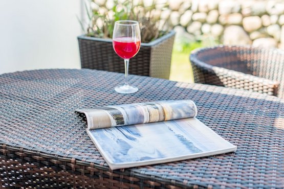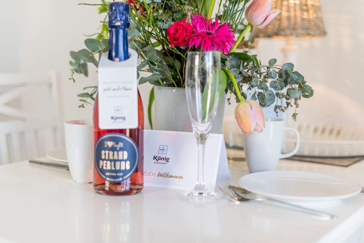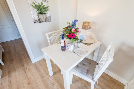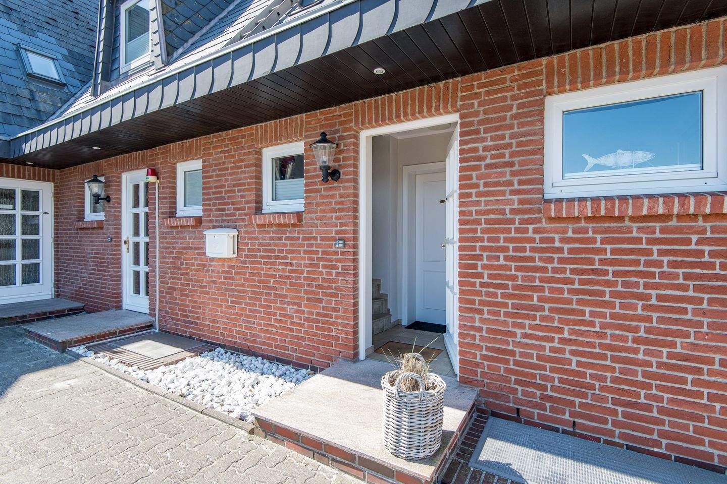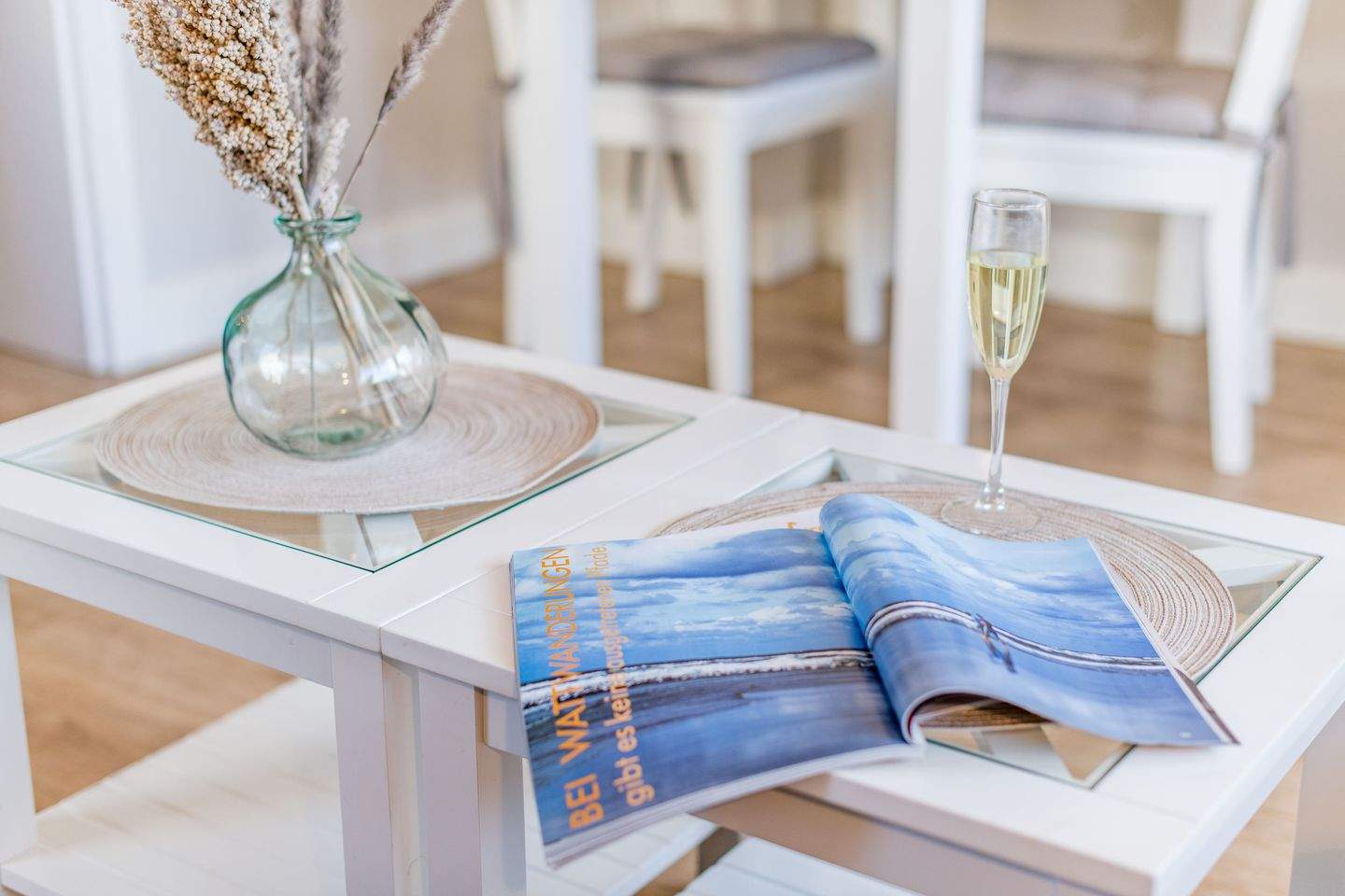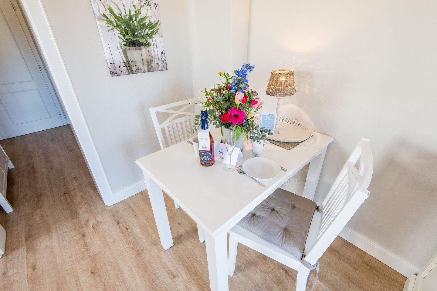 Direkt hinter den Dünen in Westerland auf Sylt, inklusive Meeresrauschen. Nichtraucherwohnung. Hunde willkommen (Hunde dürfen auf dem gesamten Grundstück nur noch an der Leine geführt werden, auch auf den Terrassen). Wohnzimmer mit Sofa, Korbsessel, TV und direktem Zugang zur Terrasse nach Westen mit Saison-Strandkorb (ca. April-September). Essecke mit Tisch und zwei Stühlen. Offene Einbauküche mit Cerankochfeld, Mikrowelle, Geschirrspüler, Filterkaffeemaschine und dem üblichen Komfort.