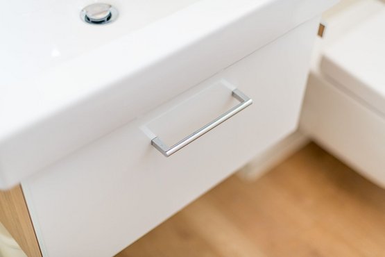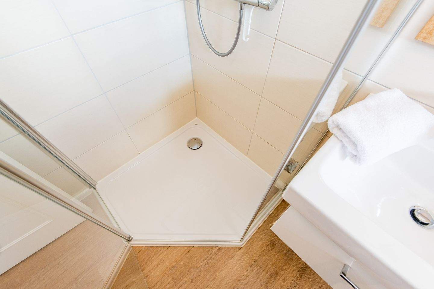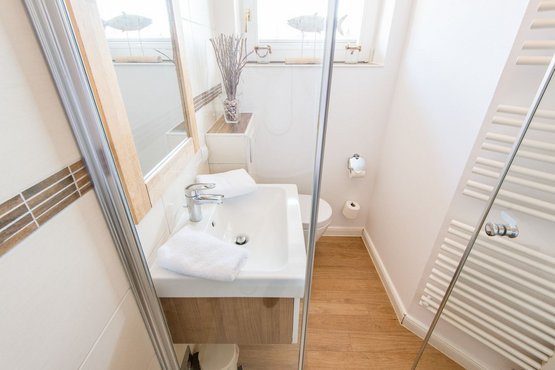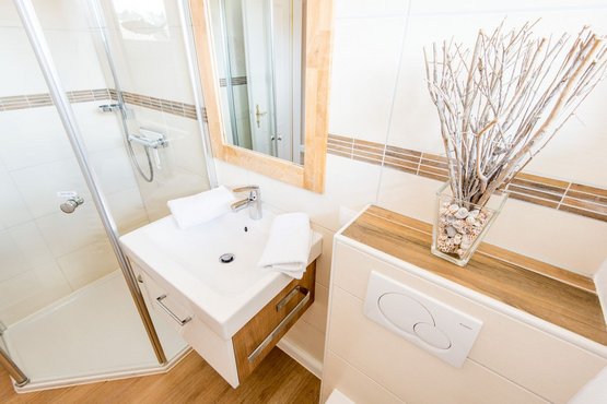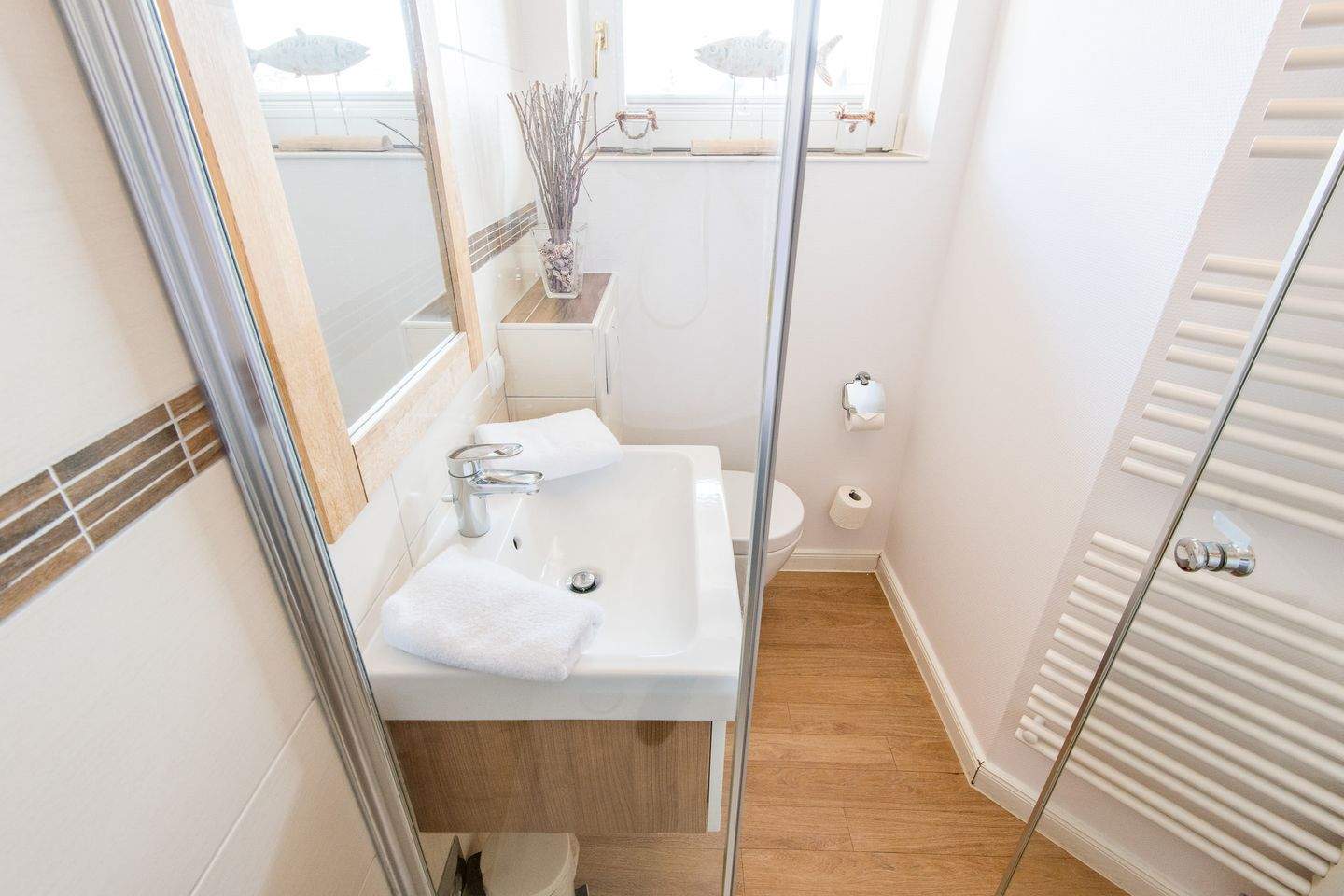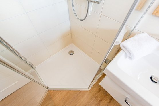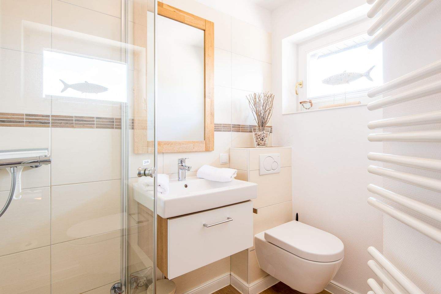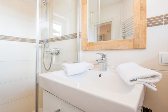 Badezimmer (Duschbad) mit Dusche, WC, Föhn, Handtuchwärmer und Tageslicht.