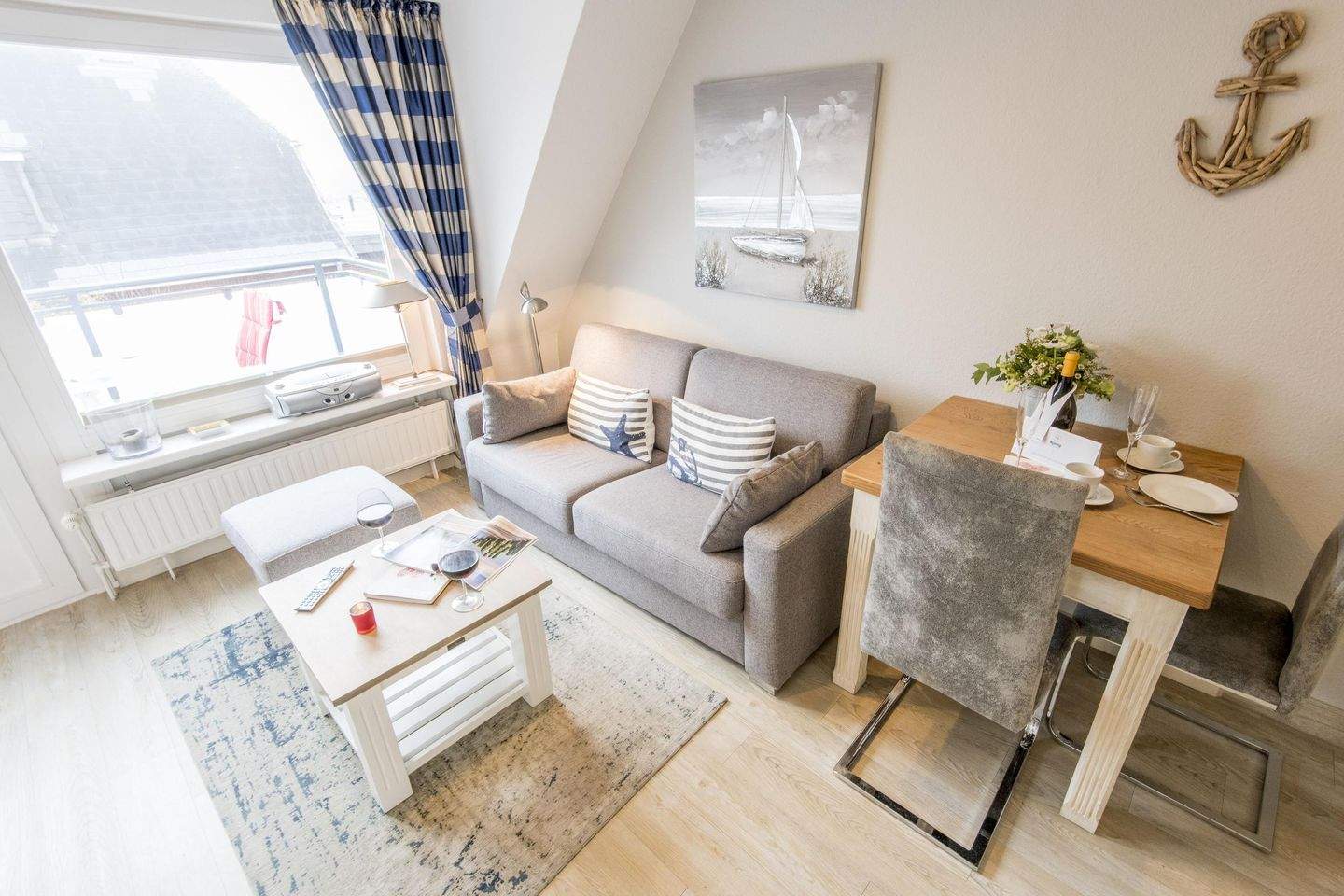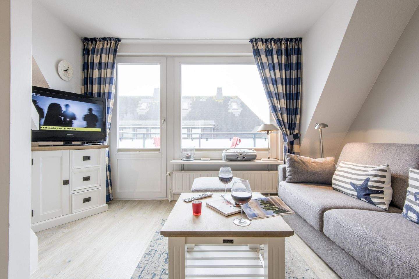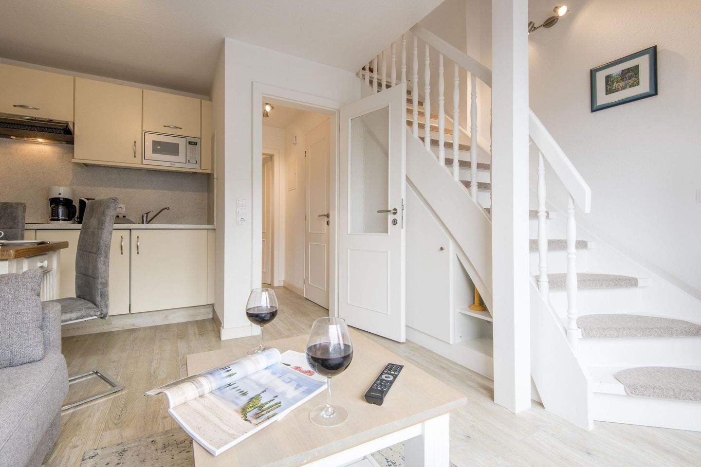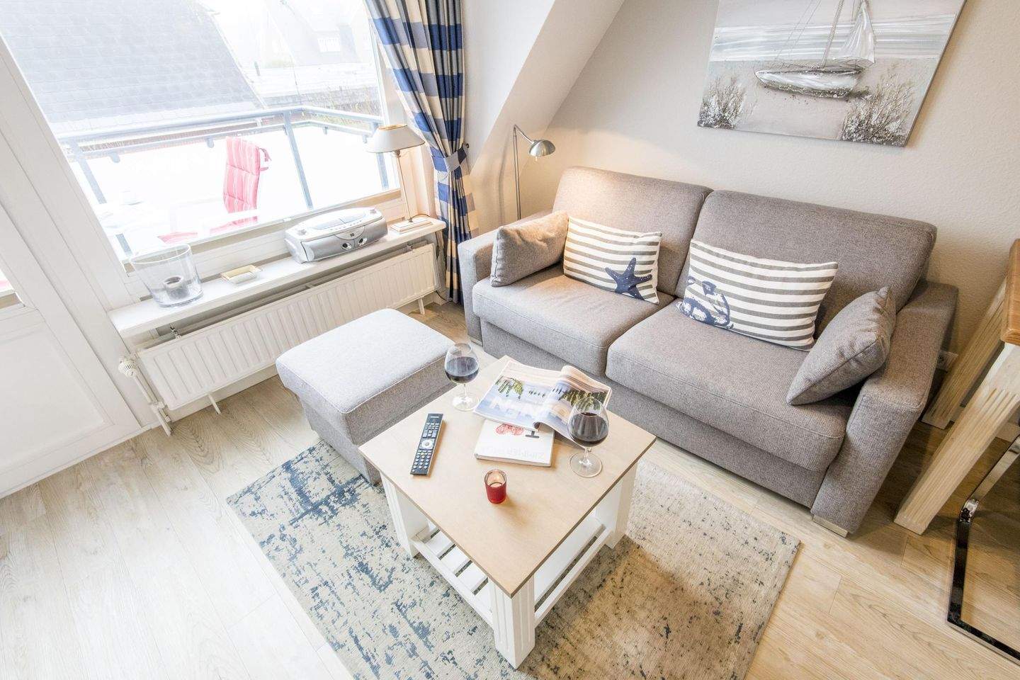 Stilvolle 2-Zimmer-Ferienwohnung mit ca. 40 m² über 2 Ebenen (OG, DG) für bis zu 4 Personen. Balkon nach Westen mit Dünenblick. Das Domizil liegt direkt hinter den Dünen in Westerland auf Sylt, inklusive Meeresrauschen. Ein perfekter Ort zum entschleunigen. Nichtraucherwohnung. Hunde willkommen (Hunde dürfen auf dem gesamten Grundstück nur noch an der Leine geführt werden, auch auf den Terrassen). Wohnzimmer mit ausziehbarem (Schlaf-) Sofa, Esstisch mit 2 Stühlen und TV. Direkter Zugang zum möblierten Balkon nach Westen mit kleinem Dünenblick. Kleine offene Küche mit 2-flammigem Herd, Geschirrspüler und viel Komfort.