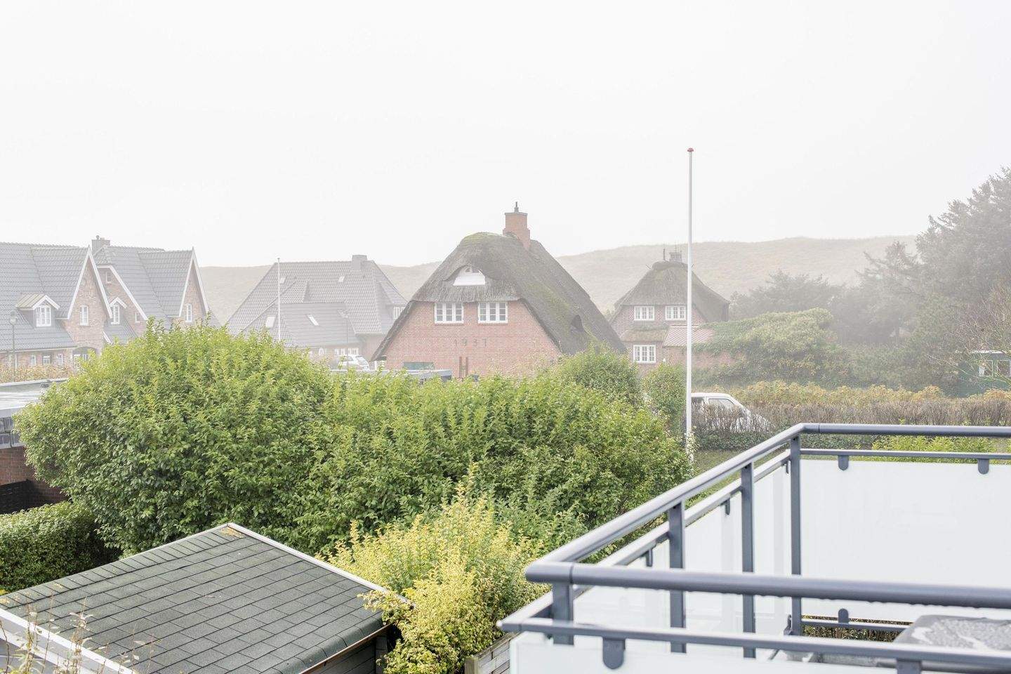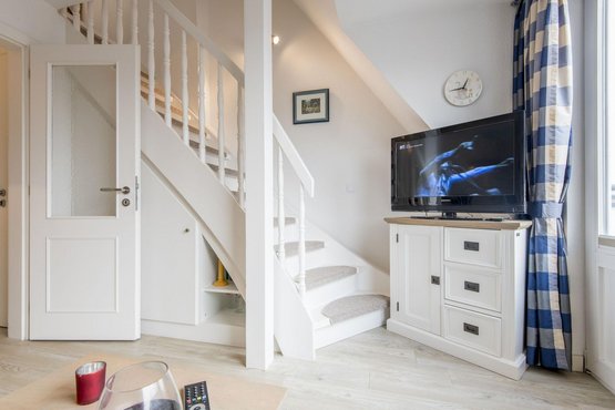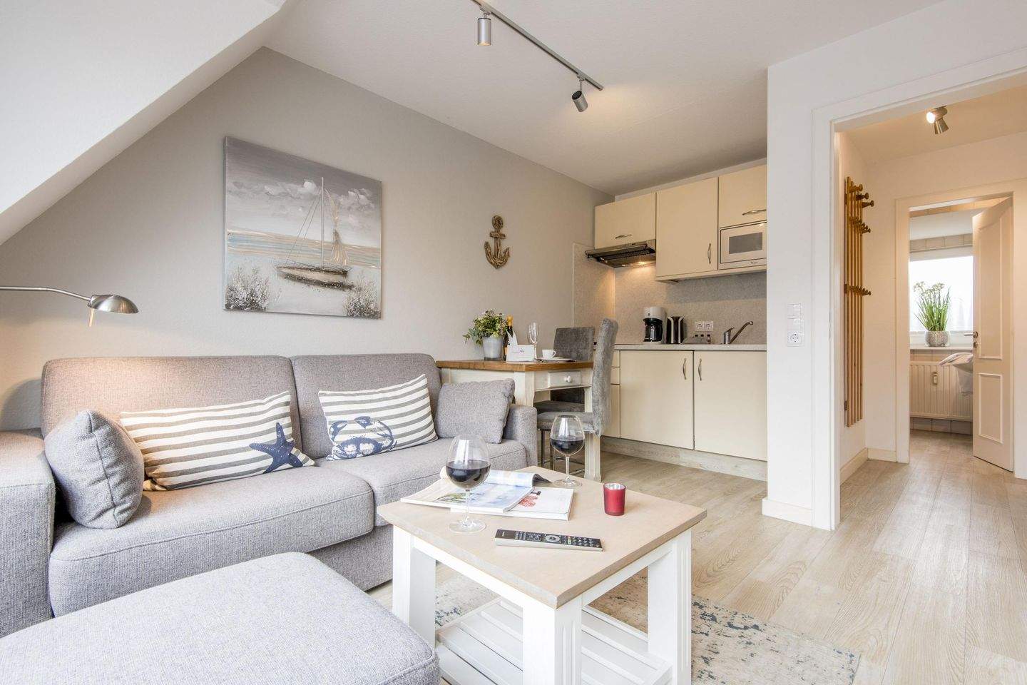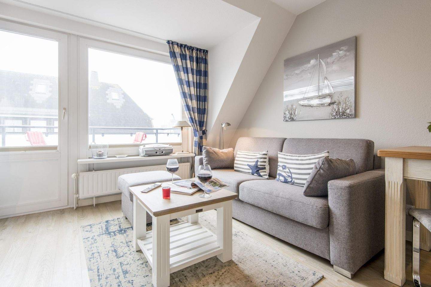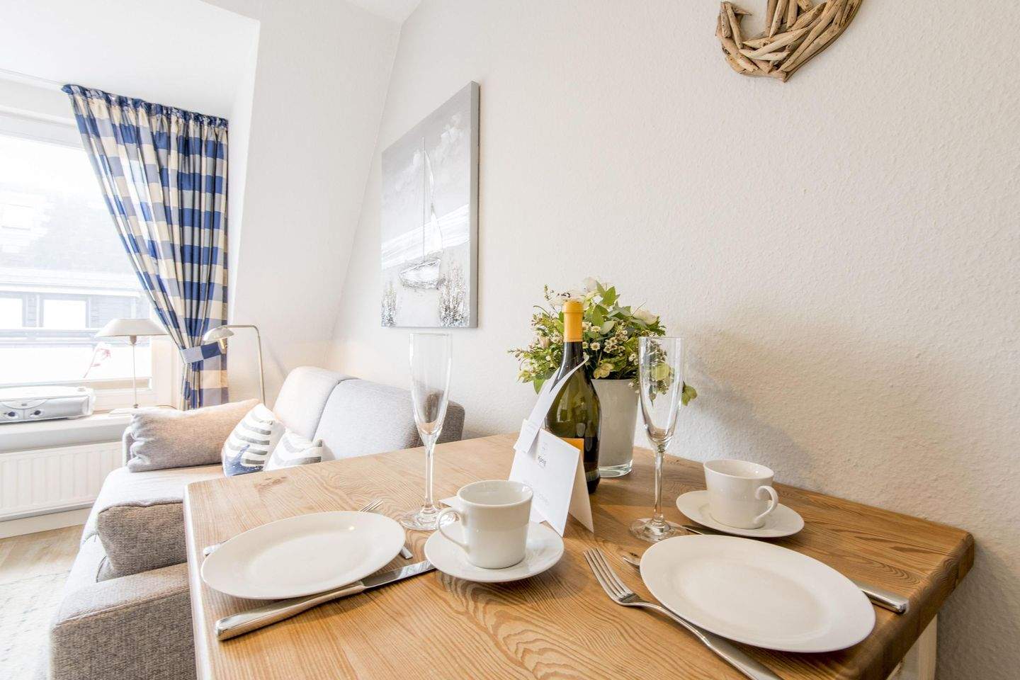 Stilvolle 2-Zimmer-Ferienwohnung mit ca. 40 m² über 2 Ebenen (OG, DG) für bis zu 4 Personen. Balkon nach Westen mit Dünenblick. Das Domizil liegt direkt hinter den Dünen in Westerland auf Sylt, inklusive Meeresrauschen. Ein perfekter Ort zum entschleunigen. Nichtraucherwohnung. Hunde willkommen (Hunde dürfen auf dem gesamten Grundstück nur noch an der Leine geführt werden, auch auf den Terrassen). Wohnzimmer mit ausziehbarem (Schlaf-) Sofa, Esstisch mit 2 Stühlen und TV. Direkter Zugang zum möblierten Balkon nach Westen mit kleinem Dünenblick. Kleine offene Küche mit 2-flammigem Herd, Geschirrspüler und viel Komfort.