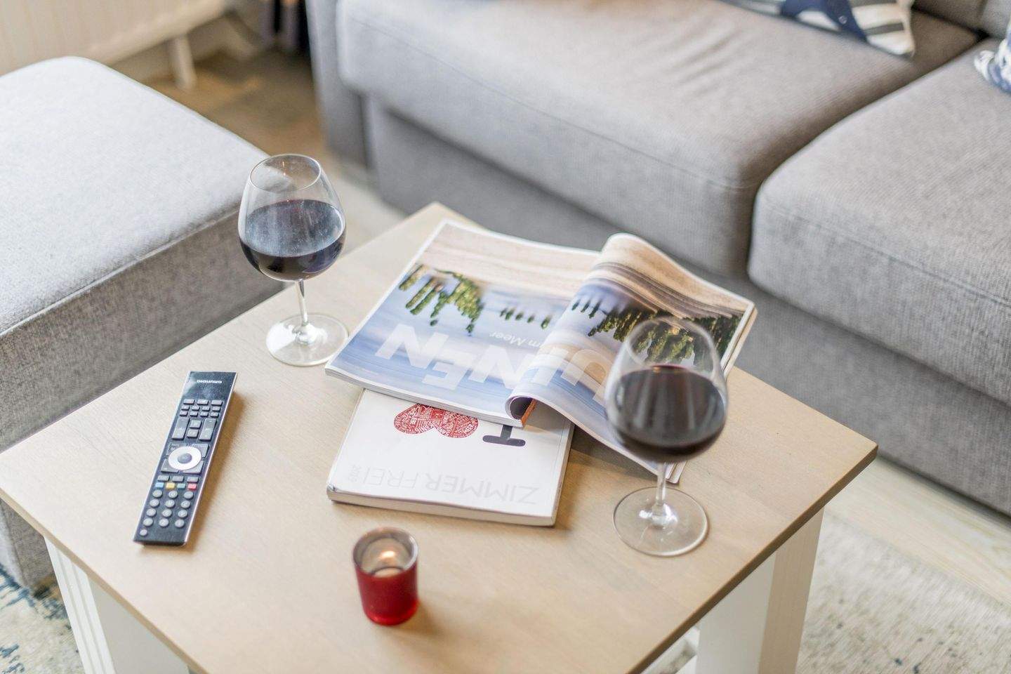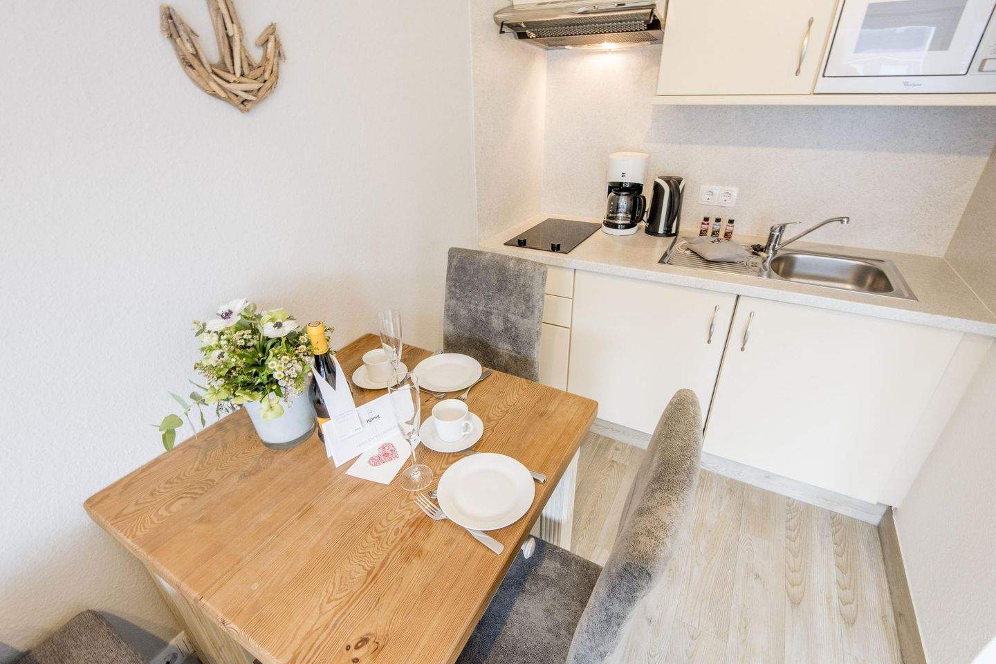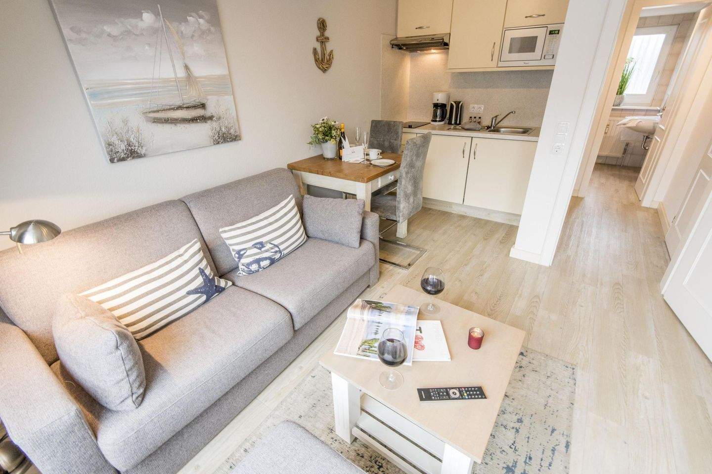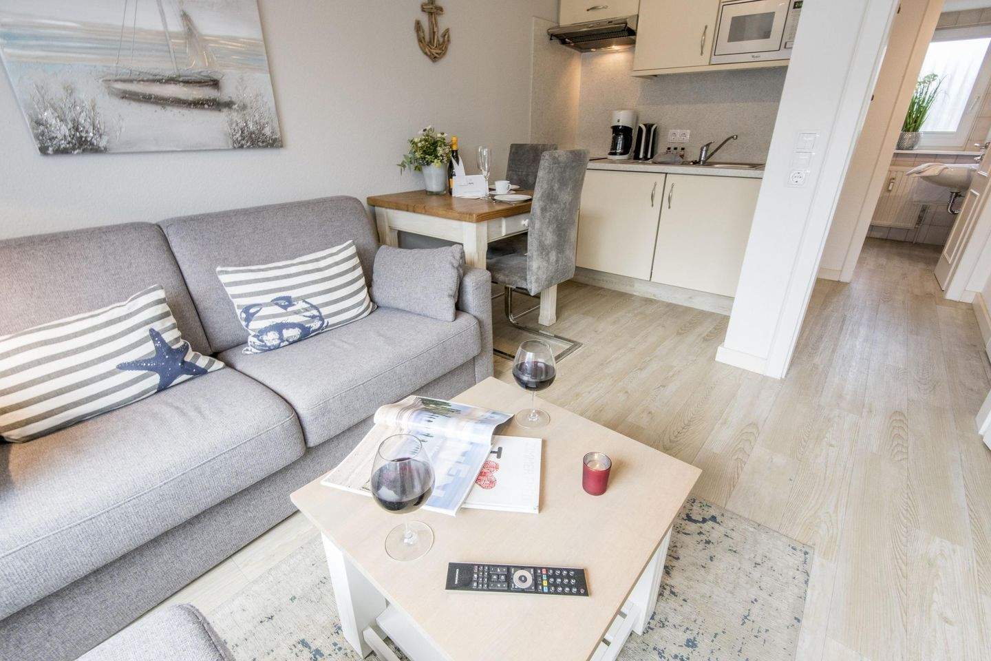 Stilvolle 2-Zimmer-Ferienwohnung mit ca. 40 m² über 2 Ebenen (OG, DG) für bis zu 4 Personen. Balkon nach Westen mit Dünenblick. Das Domizil liegt direkt hinter den Dünen in Westerland auf Sylt, inklusive Meeresrauschen. Ein perfekter Ort zum entschleunigen. Nichtraucherwohnung. Hunde willkommen (Hunde dürfen auf dem gesamten Grundstück nur noch an der Leine geführt werden, auch auf den Terrassen). Wohnzimmer mit ausziehbarem (Schlaf-) Sofa, Esstisch mit 2 Stühlen und TV. Direkter Zugang zum möblierten Balkon nach Westen mit kleinem Dünenblick. Kleine offene Küche mit 2-flammigem Herd, Geschirrspüler und viel Komfort.