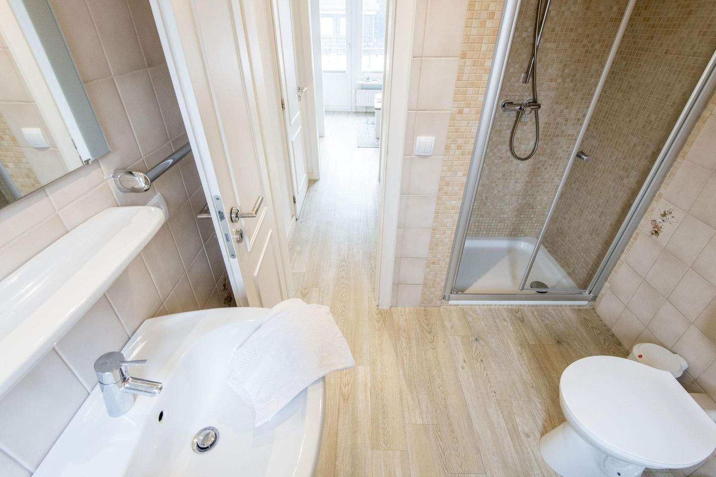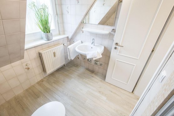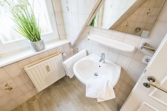 Badezimmer (Duschbad) mit Dusche, WC, Föhn und Tageslicht.
