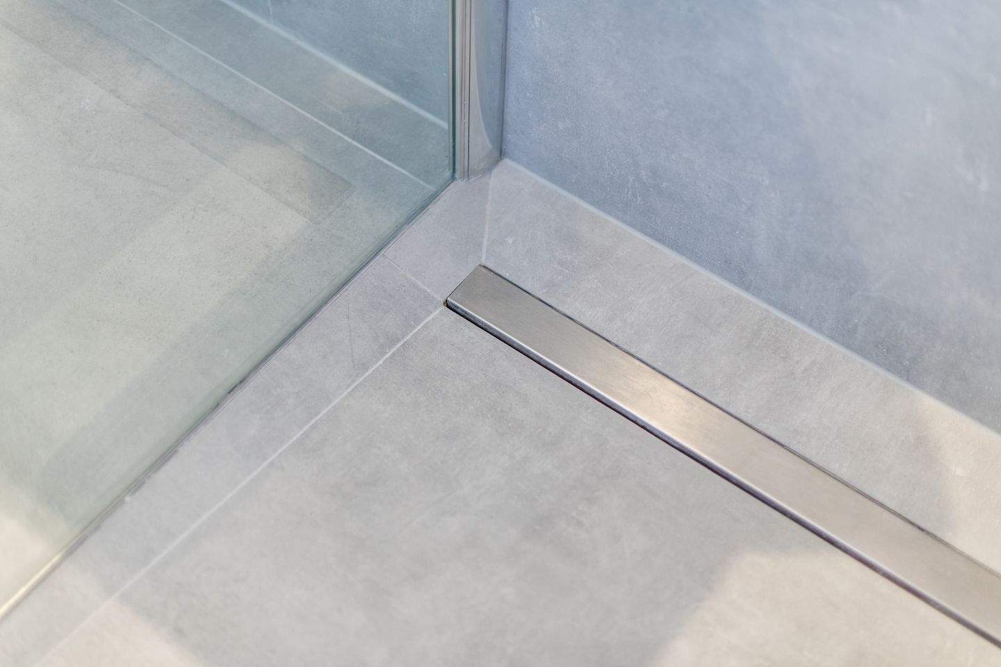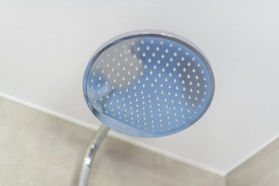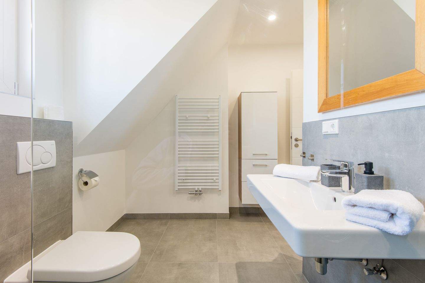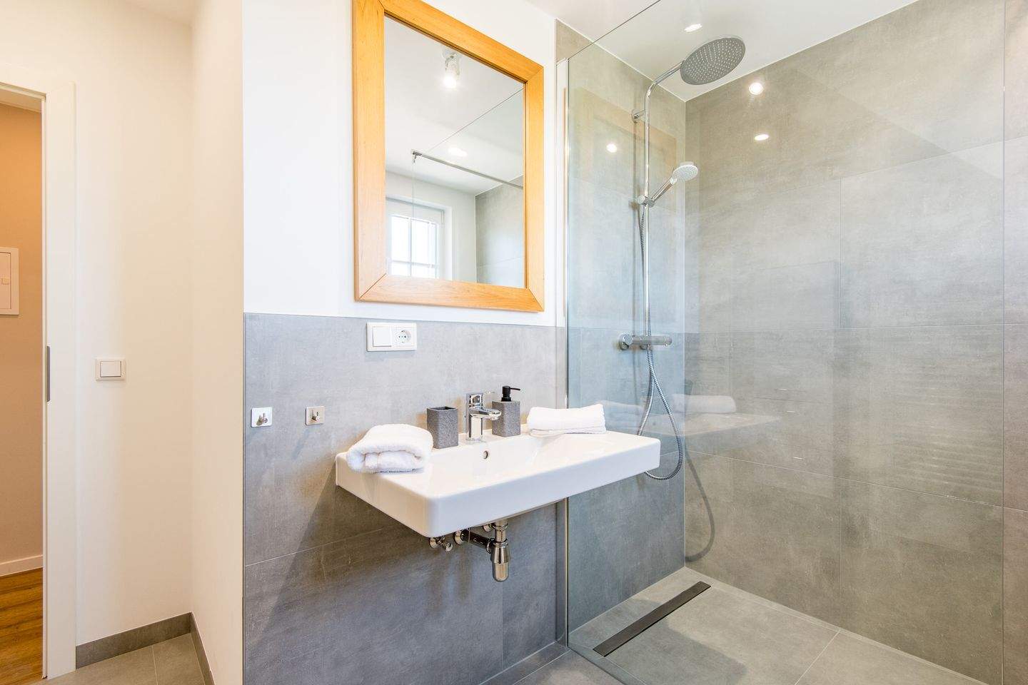 Badezimmer (Duschbad) mit bodengleicher Dusche, WC und Tageslicht.
