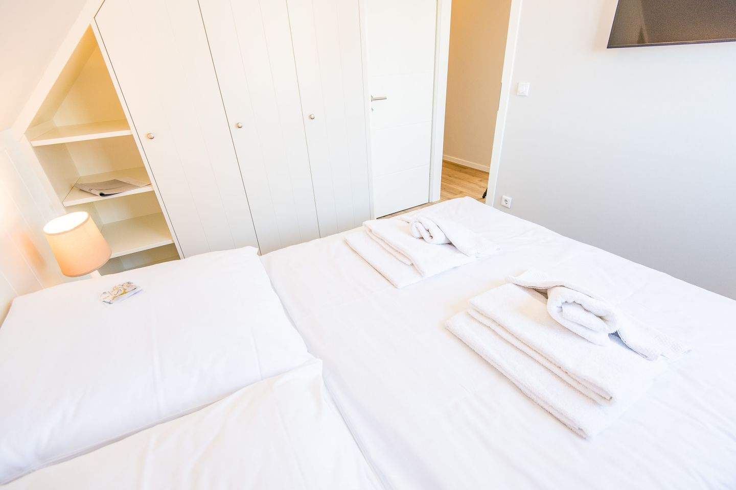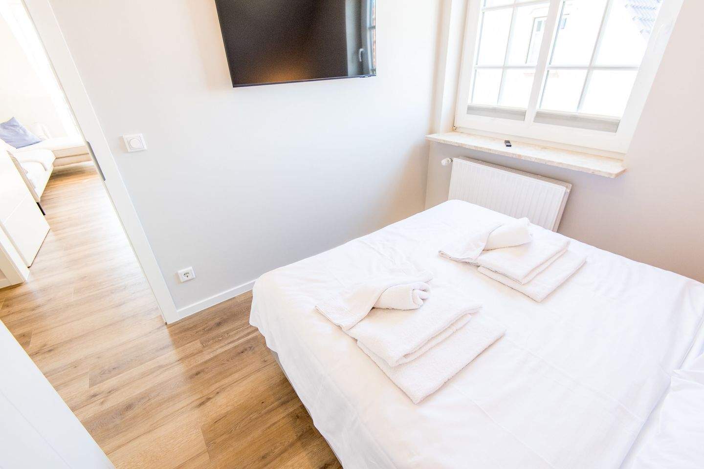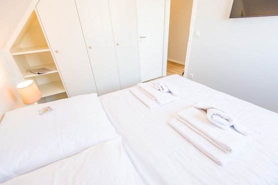 1. Schlafzimmer mit Doppelbett (140x200cm) und Kleiderschrank und TV.