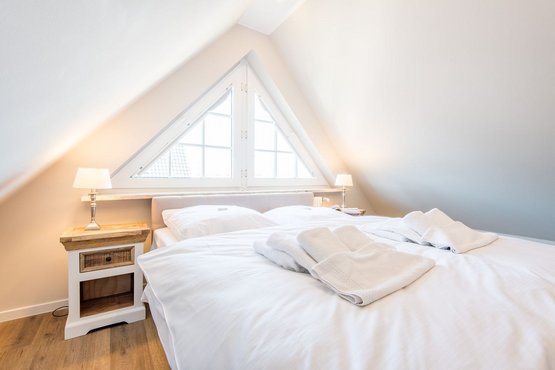 2. Schlafzimmer (halboffen) im DG mit Doppelbett (180x200cm) und Kleiderschrank.