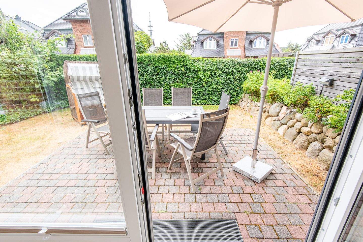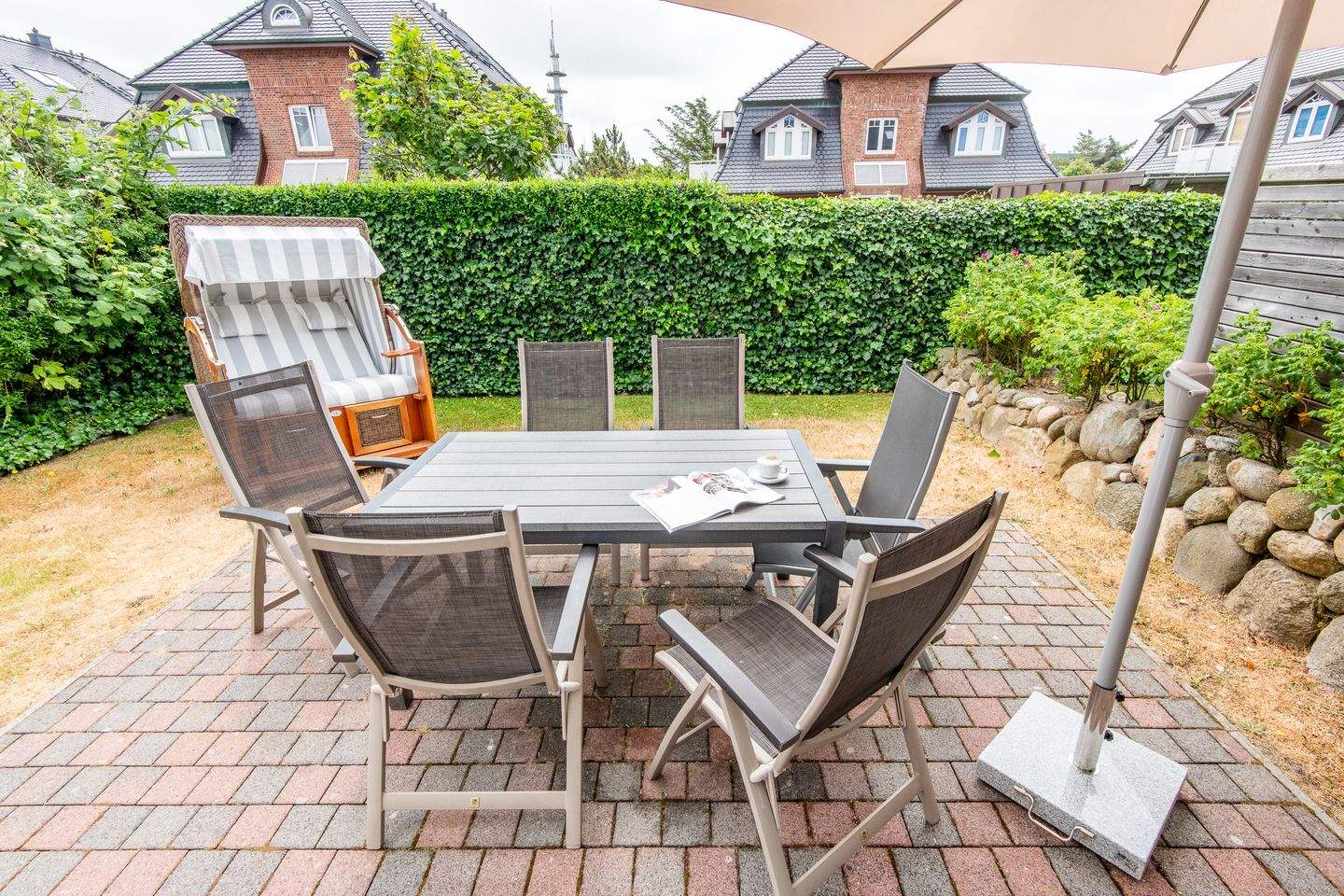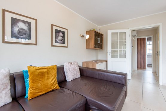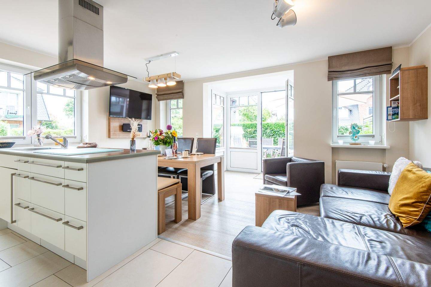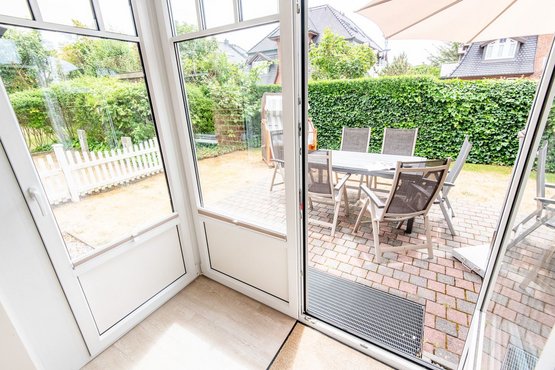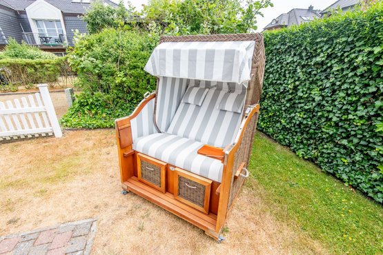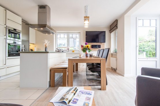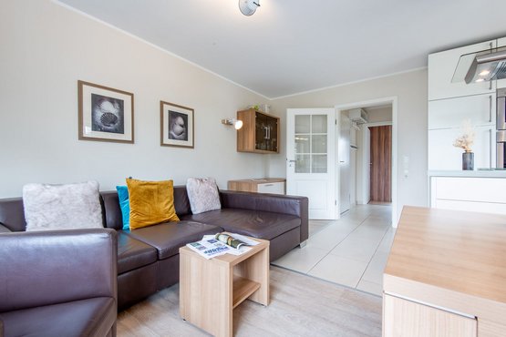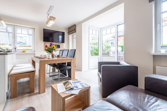 Mit Terrasse nach Süden. Strandnahe Lage in Westerland auf Sylt. Nichtraucherwohnung. Wohnzimmer mit Lederecksofa für 3 Personen, Ledersessel, TV und Esstisch mit 3 Stühlen und 1 Sitzbank für 3 Personen. Direkter Zugang zur möblierten Gartenterrasse nach Süden mit Strandkorb.