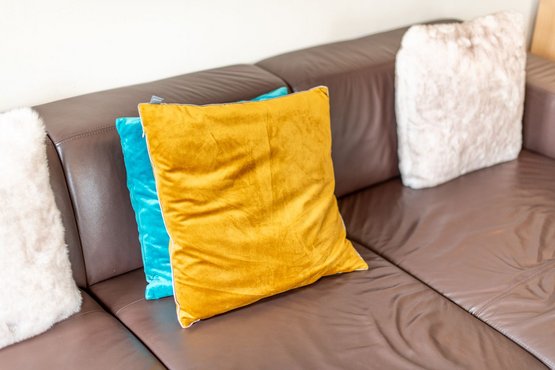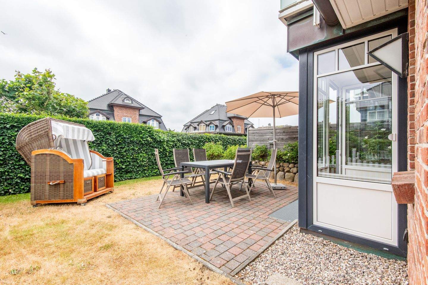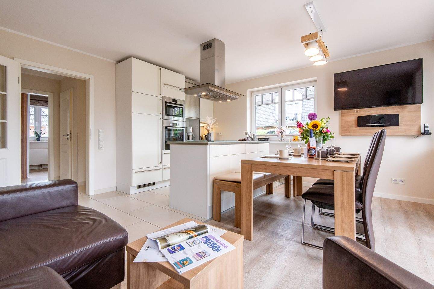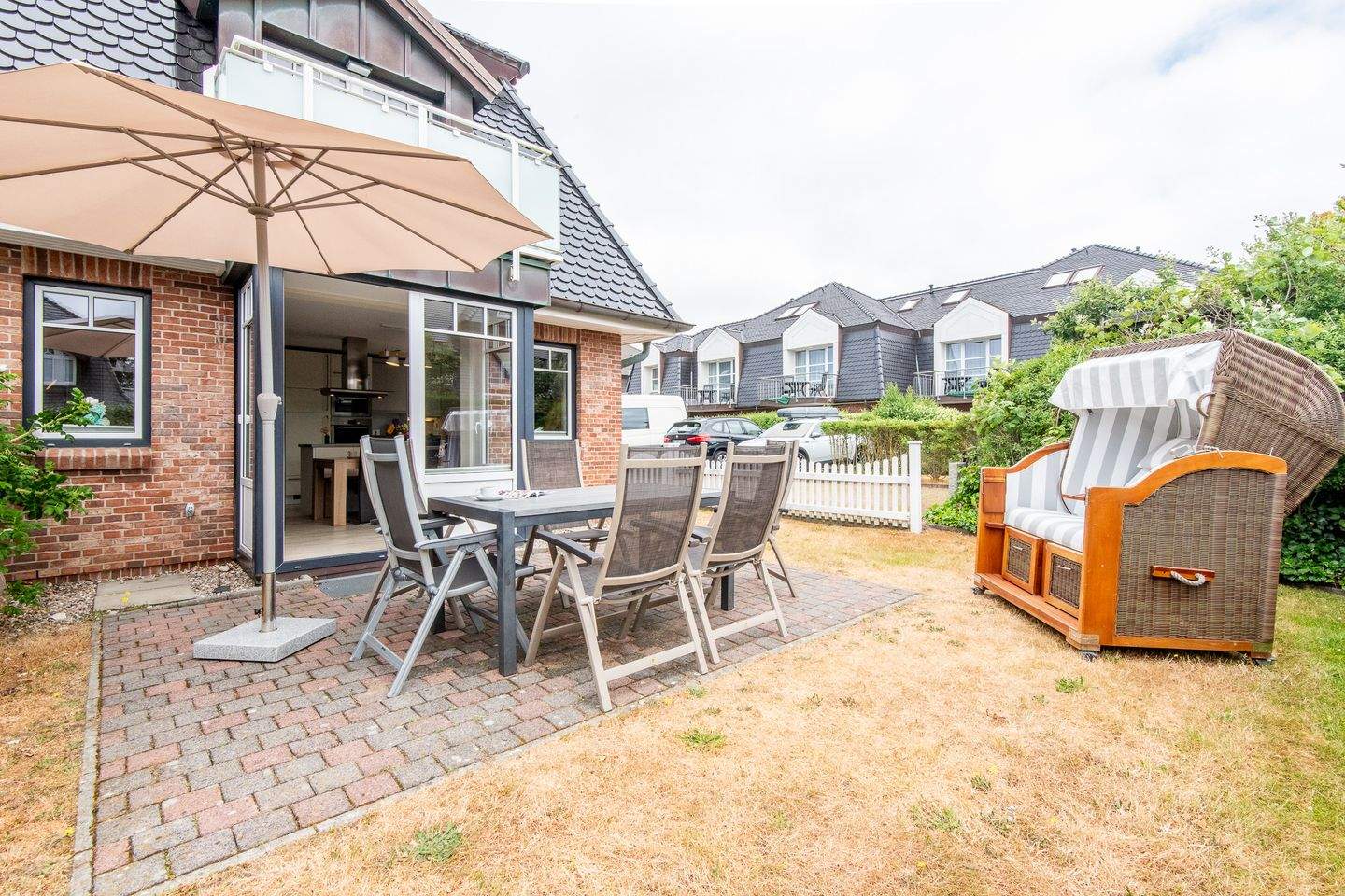 Mit Terrasse nach Süden. Strandnahe Lage in Westerland auf Sylt. Nichtraucherwohnung. Wohnzimmer mit Lederecksofa für 3 Personen, Ledersessel, TV und Esstisch mit 3 Stühlen und 1 Sitzbank für 3 Personen. Direkter Zugang zur möblierten Gartenterrasse nach Süden mit Strandkorb.