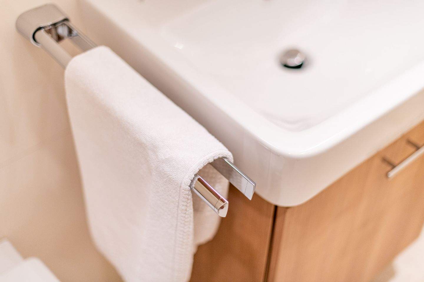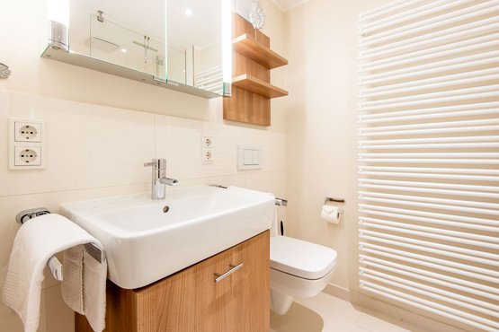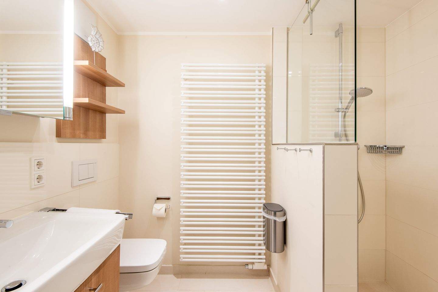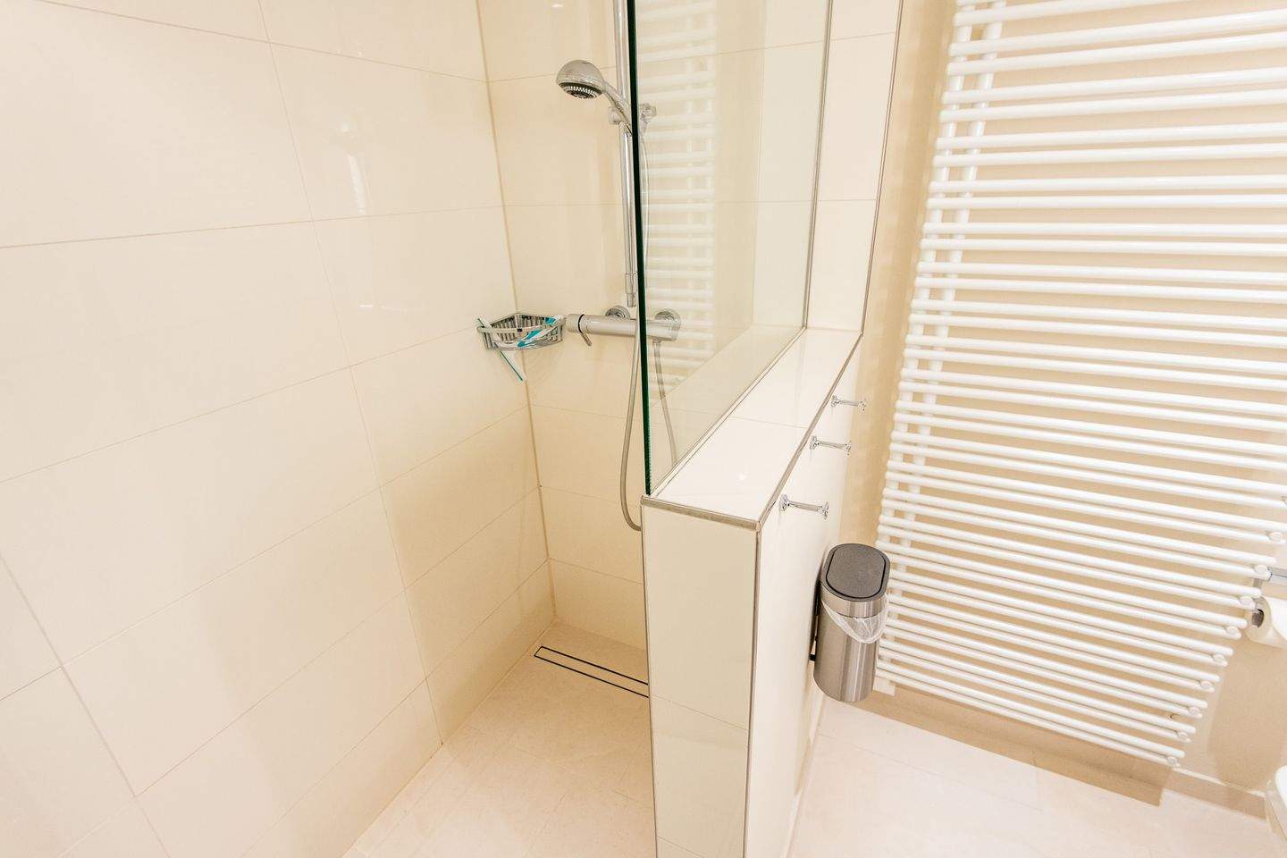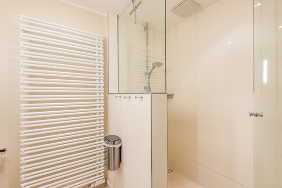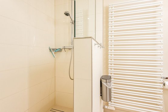 1. Badezimmer (Duschbad) mit ebenerdiger Regendusche, WC, Handtuchwärmer und Föhn.