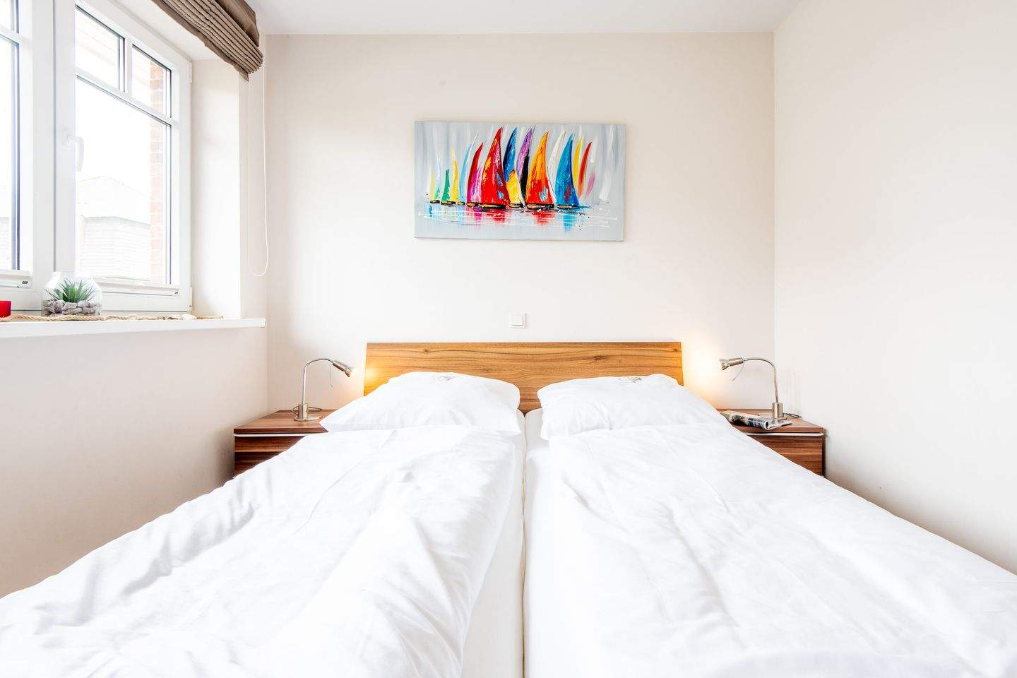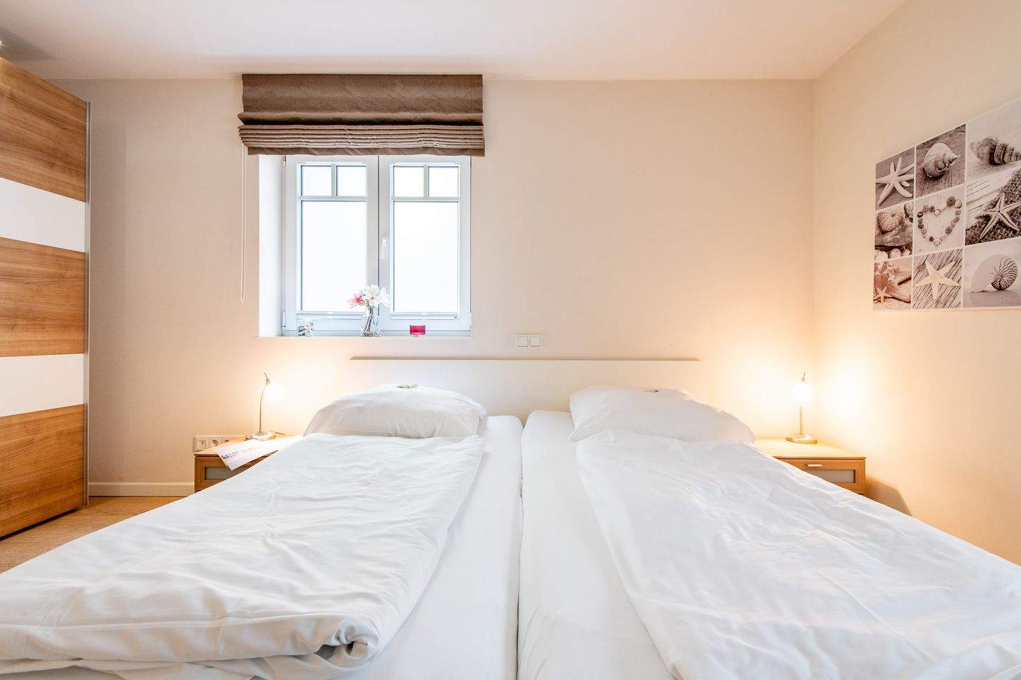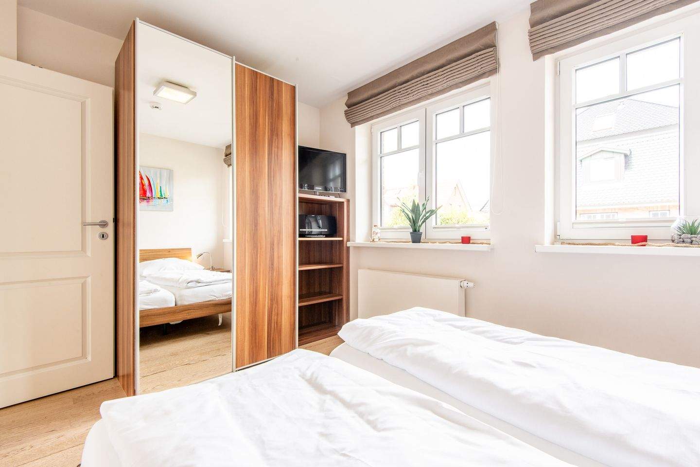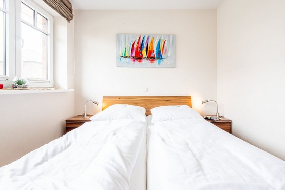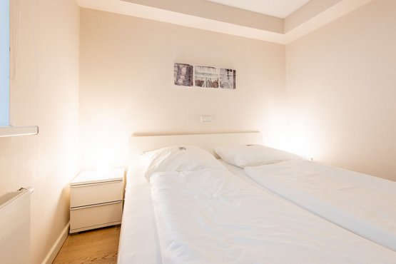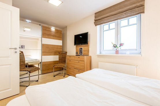 2. Schlafzimmer mit Doppelbett (2x 90x200cm), Kleiderschrank und TV.