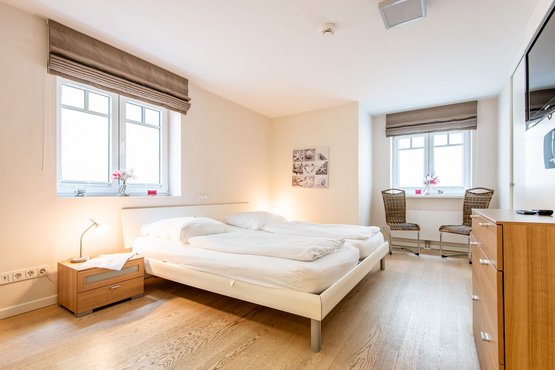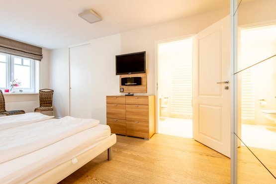 1. Schlafzimmer mit Doppelbett (2x 100x210cm), Kleiderschrank, Kommode, 2 Stühlen und TV. En Suite das 1. Badezimmer.