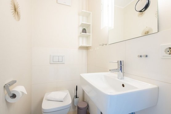 Flur mit Garderobe und Gäste-WC im Eingangsbereich. Abstellkammer mit Waschtrockner im Keller. Pkw-Stellplatz, Telefon und WLAN vorhanden.