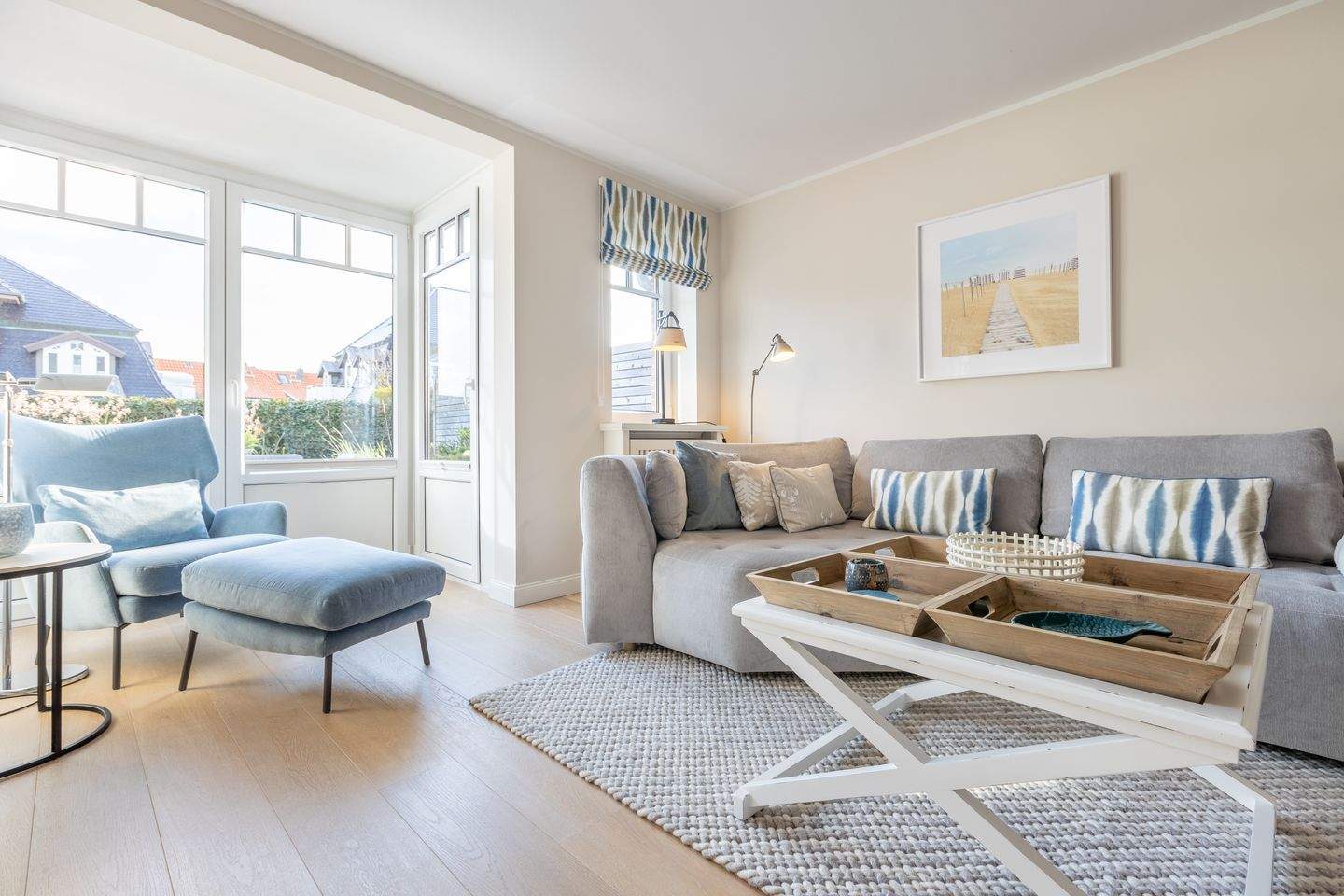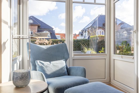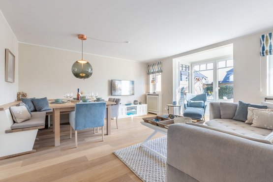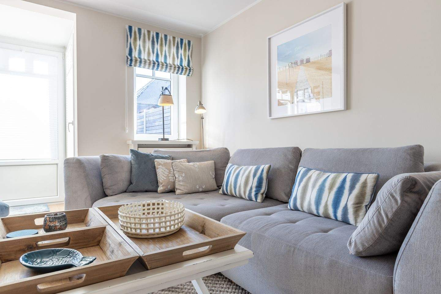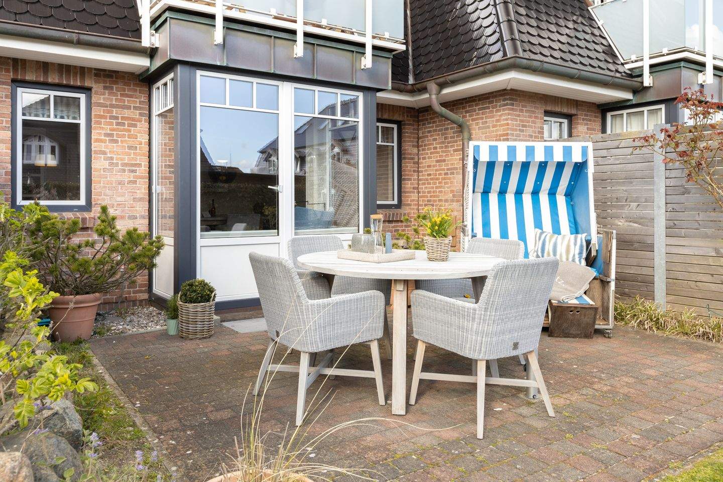 Zum Meer sind es nur wenige Meter, Sie haben die Auswahl zwischen zwei direkten Strandübergängen. Nichtraucherwohnung. Großes, lichtdurchflutetes Wohnzimmer mit gemütlichem Sofa, Erker in Süd Ausrichtung, TV. Direkter Zugang zur möblierten Terrasse nach Süden mit kleinem Garten. Ein Original Westerländer Strandkorb lädt zum windgeschützten Verweilen ein. (Dieser steht Ihnen vom Frühjahr bis zum Spätherbst zur Verfügung.)