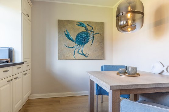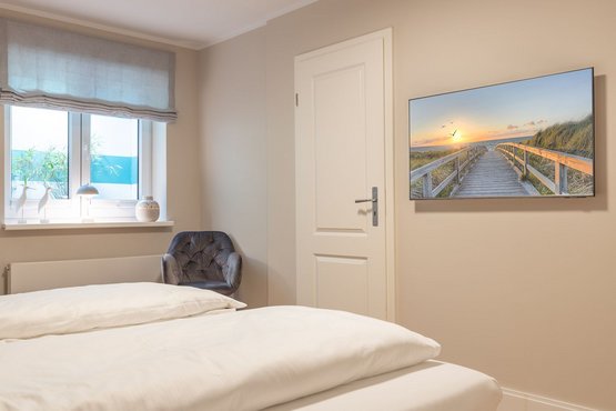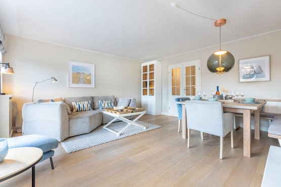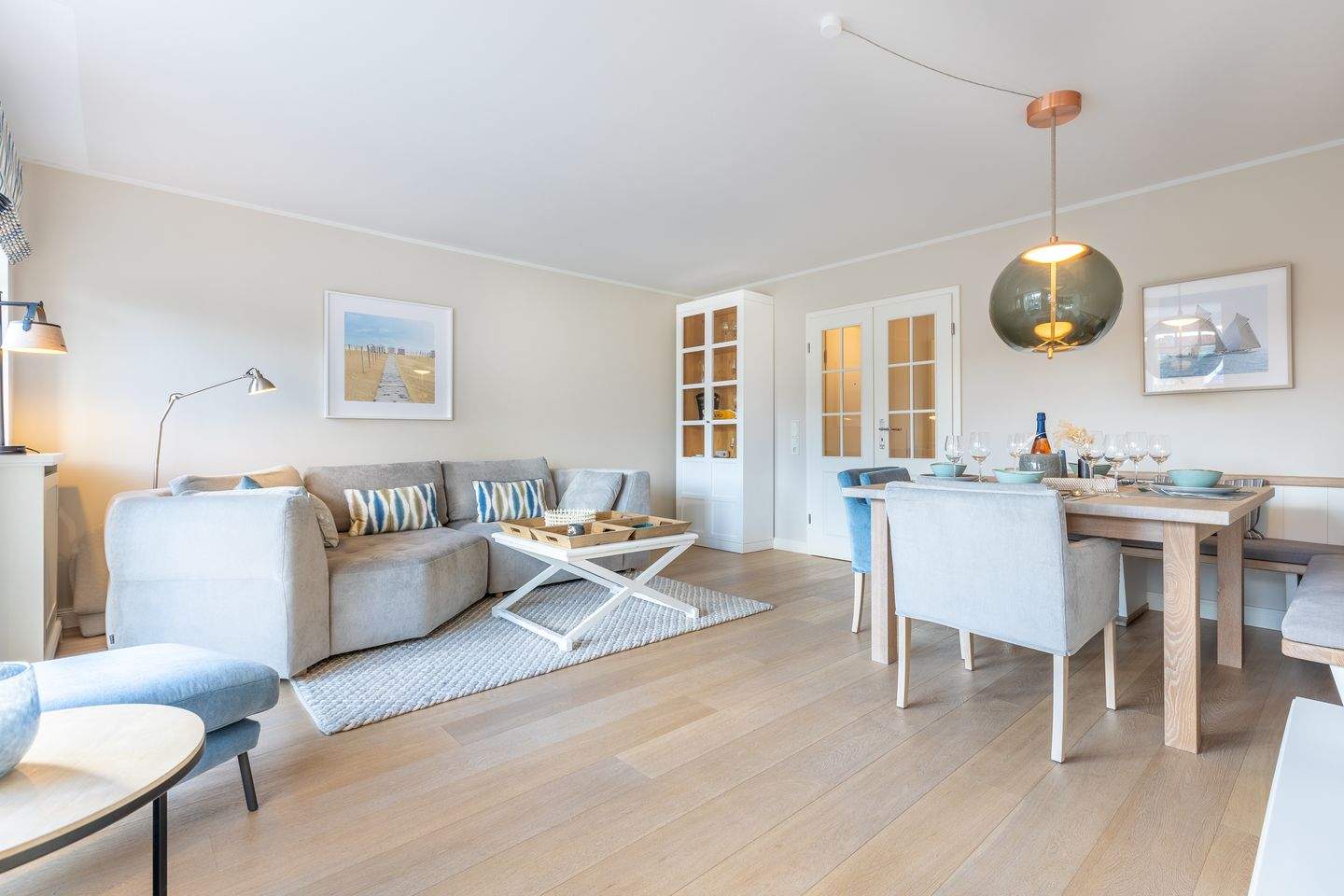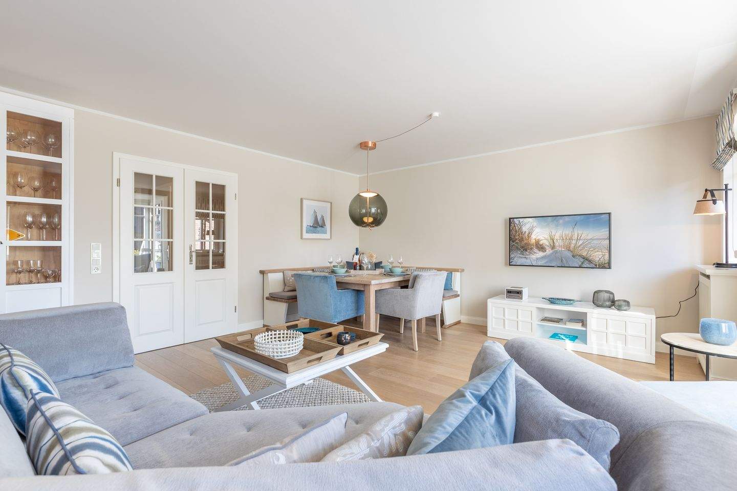 Zum Meer sind es nur wenige Meter, Sie haben die Auswahl zwischen zwei direkten Strandübergängen. Nichtraucherwohnung. Großes, lichtdurchflutetes Wohnzimmer mit gemütlichem Sofa, Erker in Süd Ausrichtung, TV. Direkter Zugang zur möblierten Terrasse nach Süden mit kleinem Garten. Ein Original Westerländer Strandkorb lädt zum windgeschützten Verweilen ein. (Dieser steht Ihnen vom Frühjahr bis zum Spätherbst zur Verfügung.)