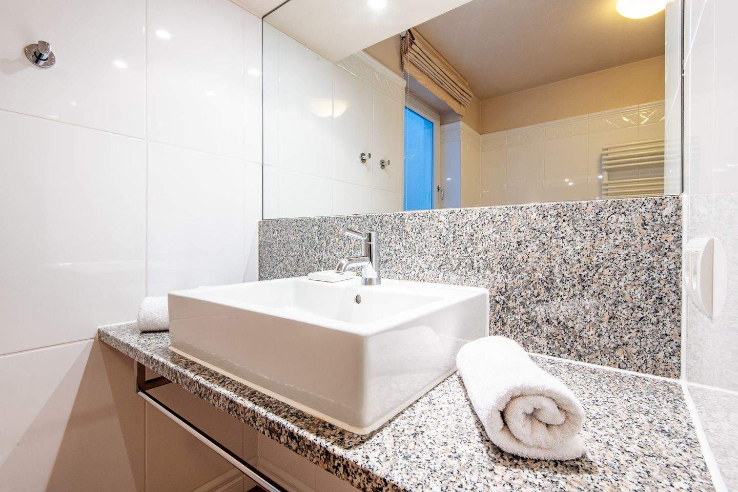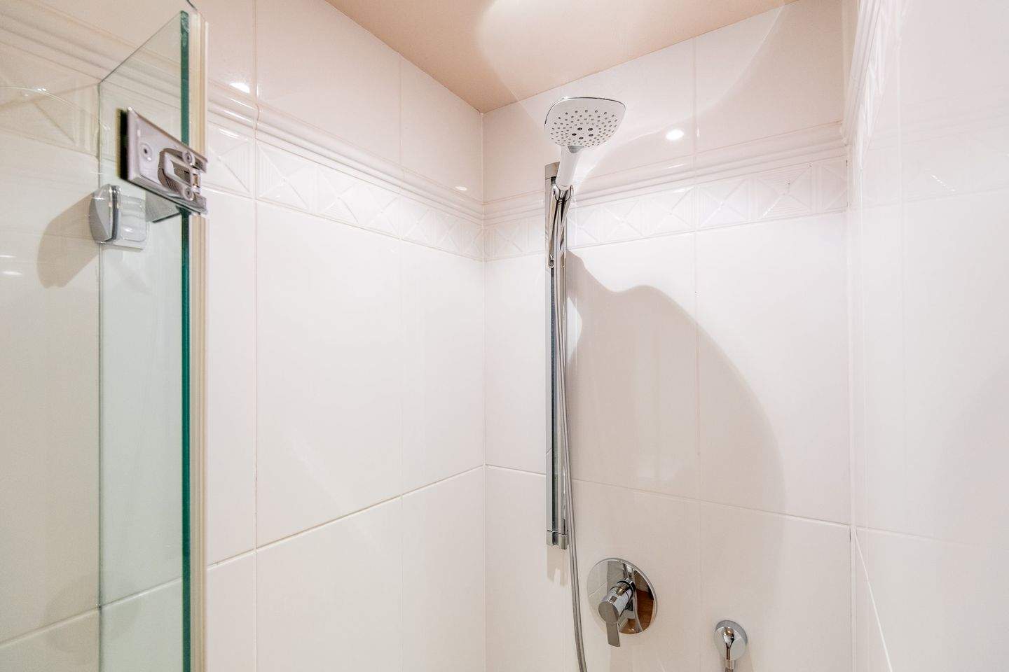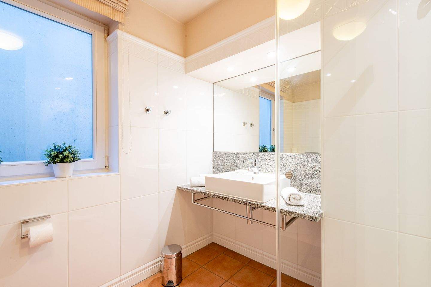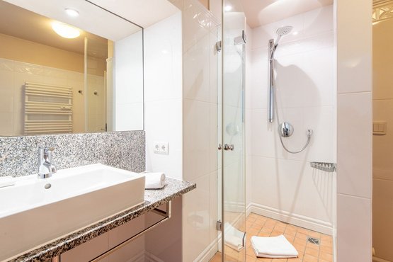1. Badezimmer mit Dusche zeichnet sich durch einen bodentiefen Einstieg aus und bietet eine moderne und komfortable Atmosphäre.