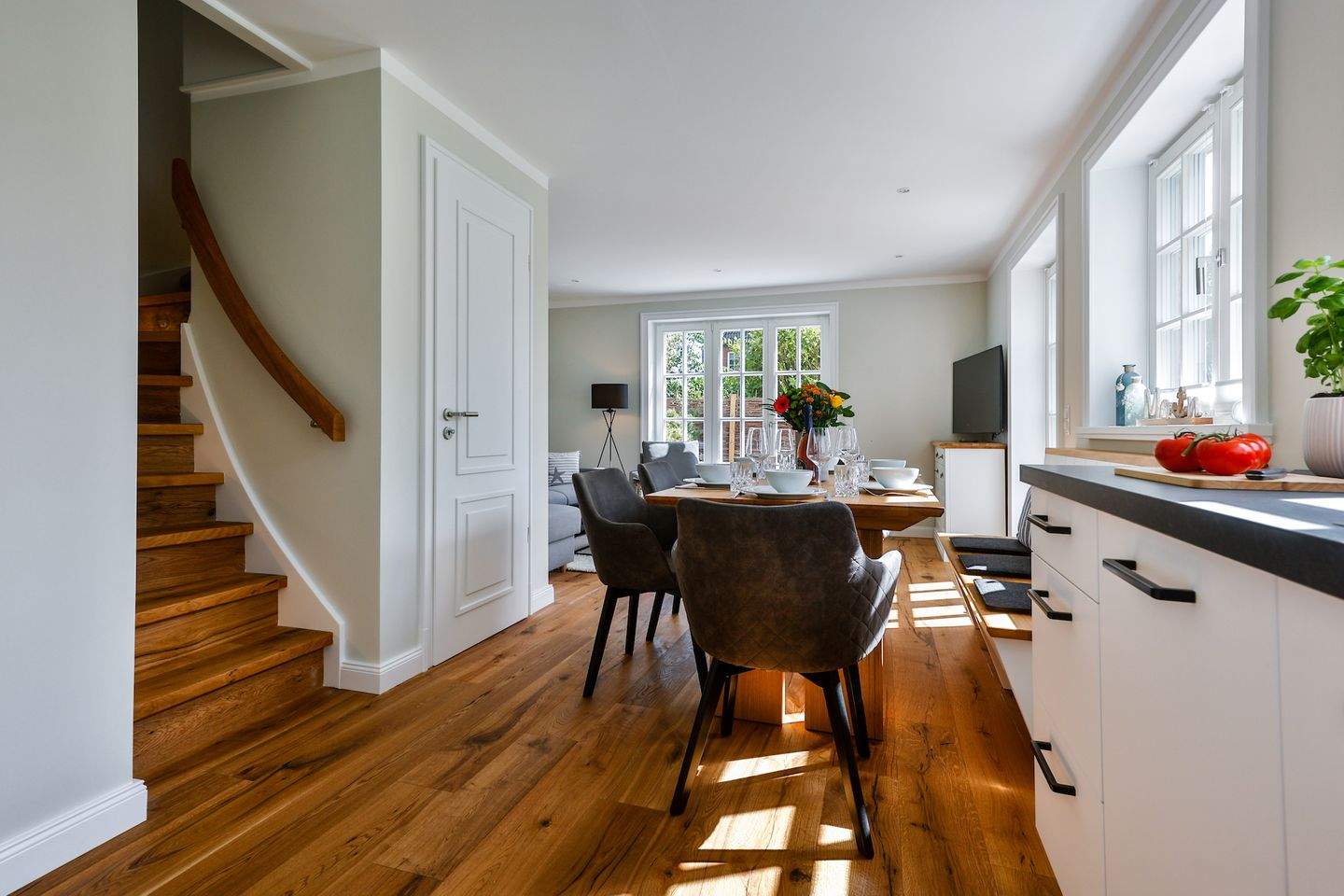 Stilvolles Wohnzimmer mit modernem, gemütlichem Sofa und TV. Der Essbereich bietet ausreichend Platz. Das Haus verfügt über einen schönen begrünten Garten und eine Terrasse nach Süd-Westen die zum Entspannen einlädt.