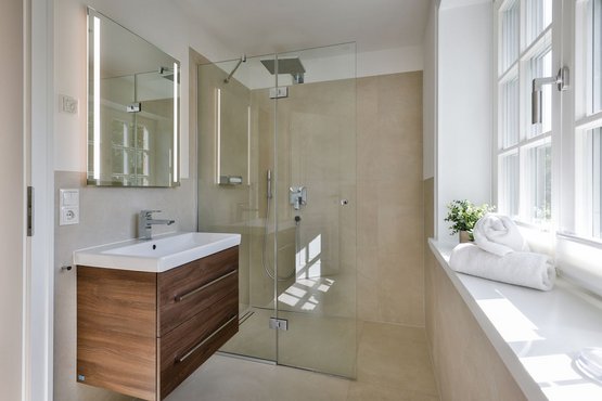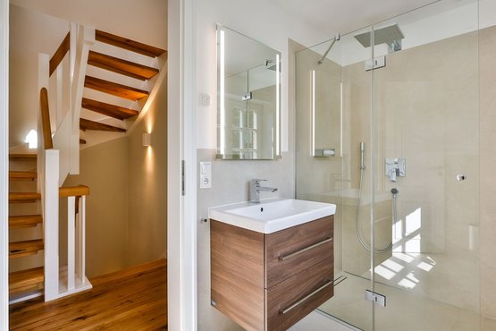 1. Badezimmer (Duschbad), WC, Föhn und Handtuchwärmer. Waschtrockner.