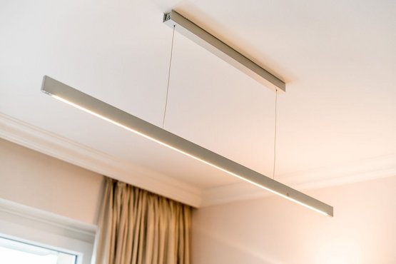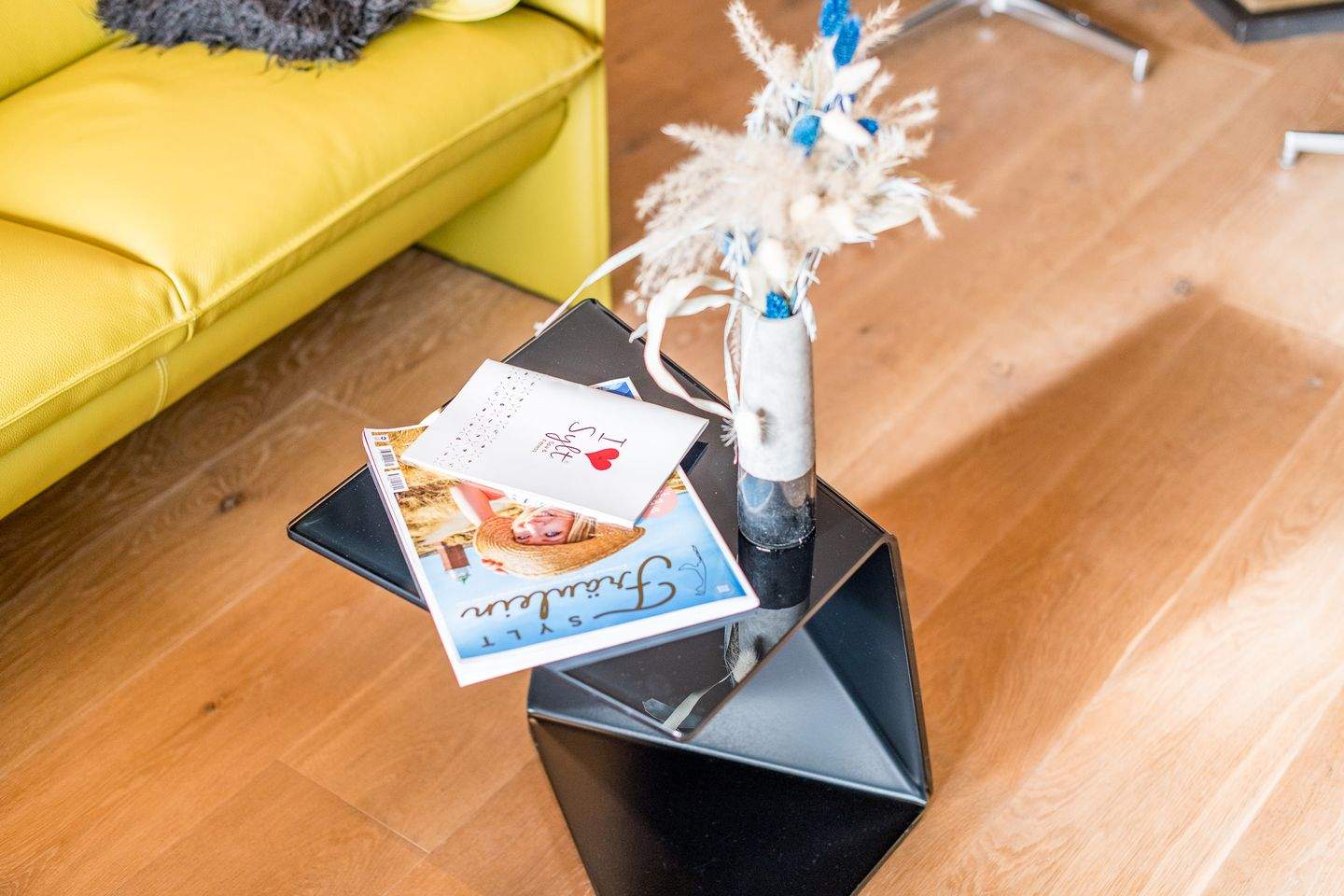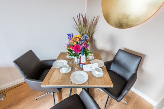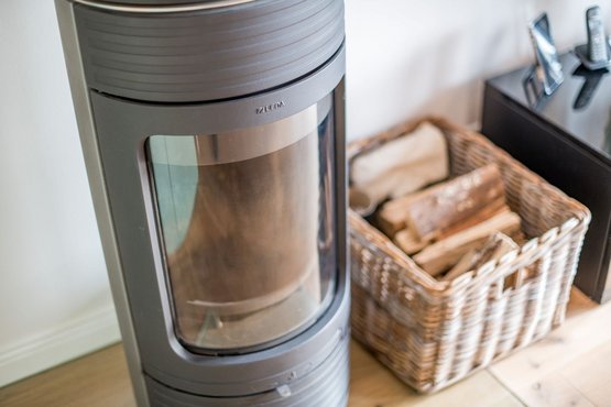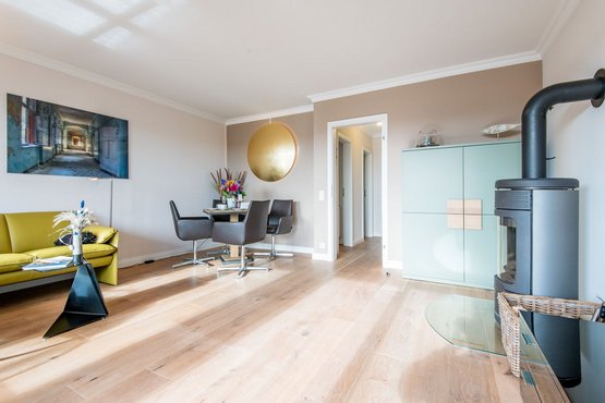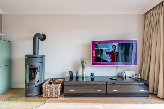 Der helle Wohnraum mit Echtholzfußboden und gemütlichem Kachelofen sorgt für eine Wohlfühlatmosphäre. Die liebevoll eingebaute Essecke rundet das Bild des Raumes optisch und funktional ab.