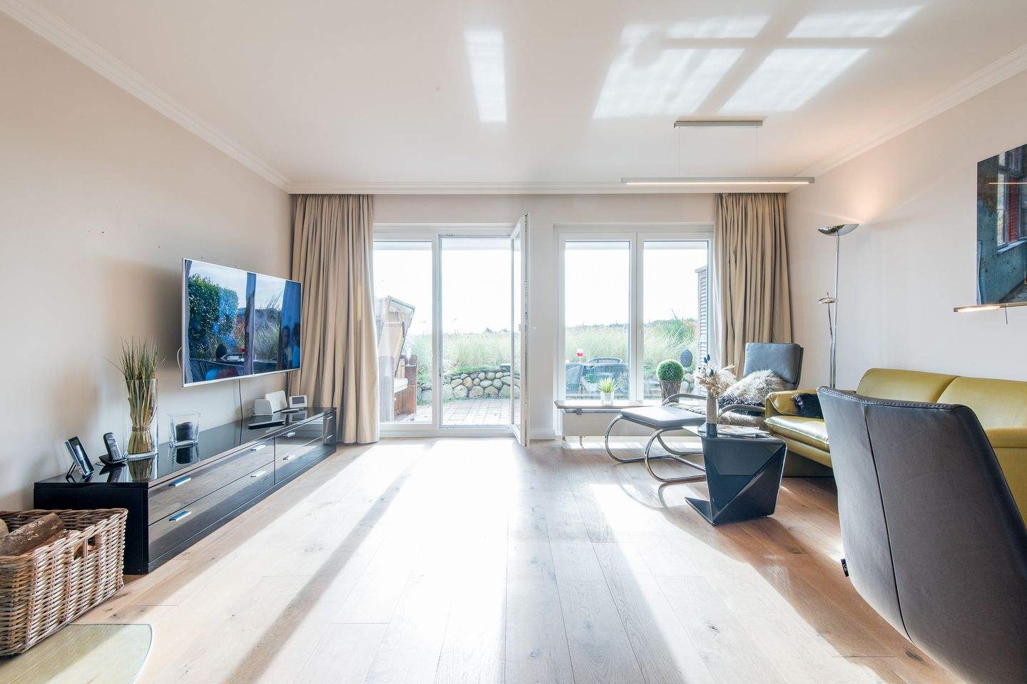 Erstklassige Ferienwohnung „Sönshörn Whg. 7“ mit ca. 86m² auf zwei Ebenen (EG, UG) für bis zu 4 Personen auf einem naturnahen Heidegrundstück in Munkmarsch. Hier können Sie den Blick über ruhige Heidelandschaften und das schöne Wattenmeer schweifen lassen. Fernab vom touristischen Trubel, gibt es viel Raum für Entspannung und Erholung. Genießen Sie den Blick auf das Wattenmeer und die Keitumer Bucht von Ihrer sonnigen Terrasse. Die Lage ist perfekt für einen Urlaub mit Hund.