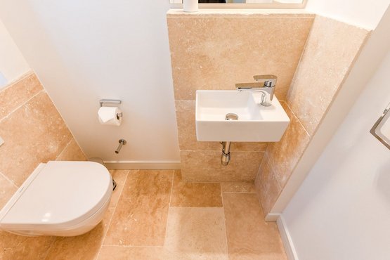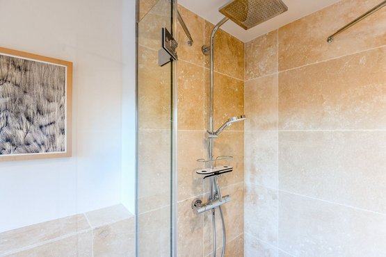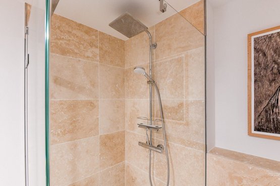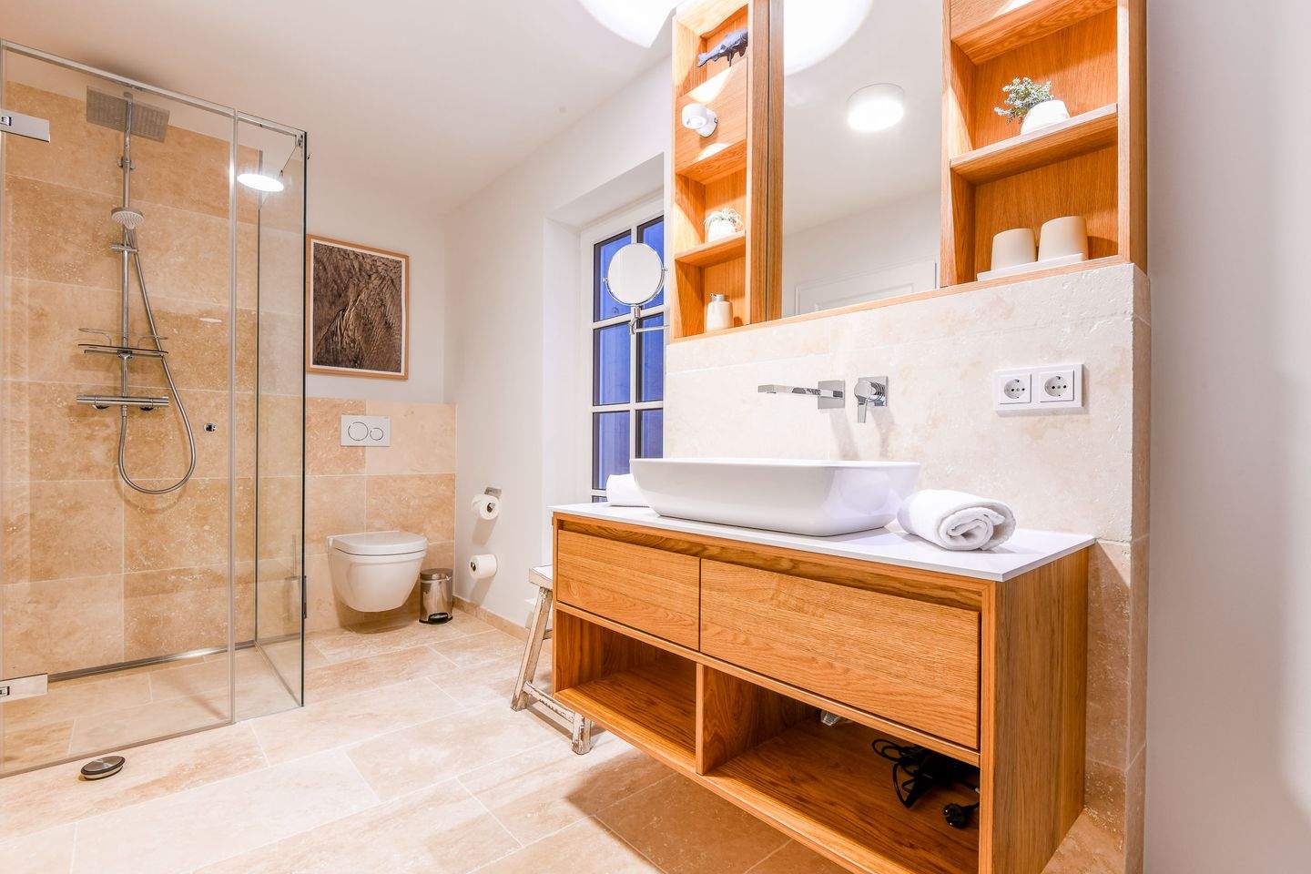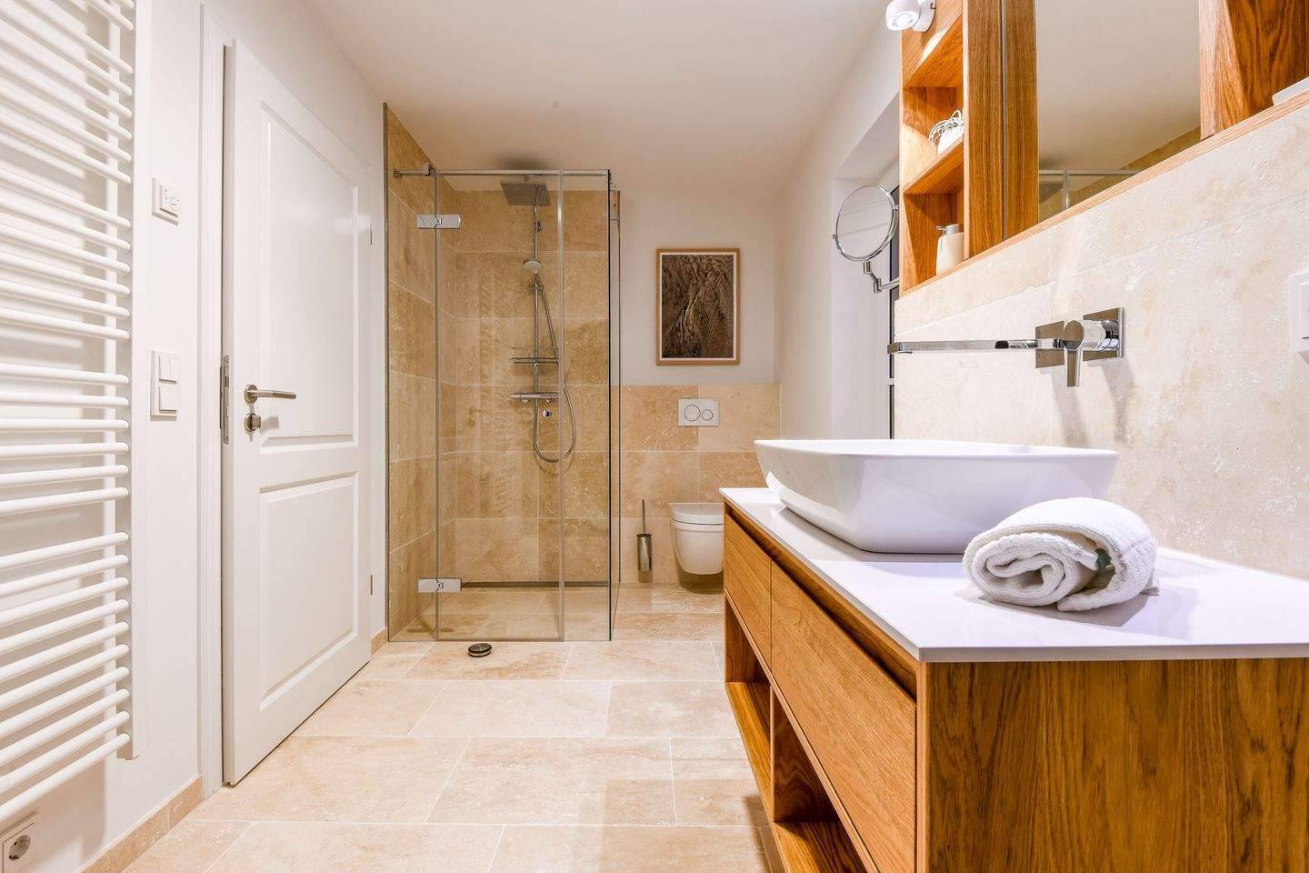 1. Duschbad mit ebenerdiger Dusche, Fußbodenheizung, Tageslicht und Fön.