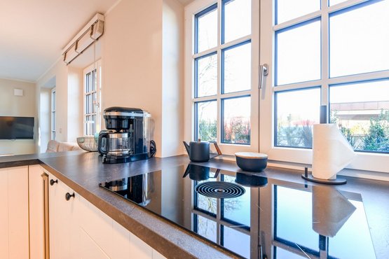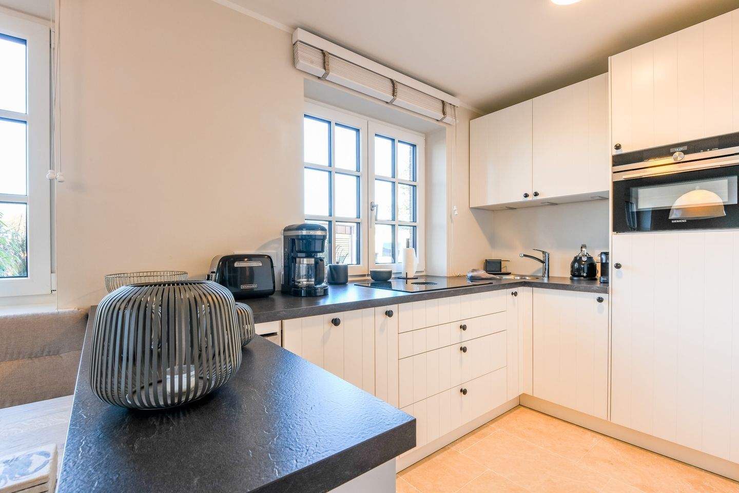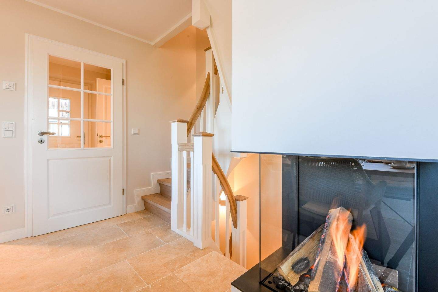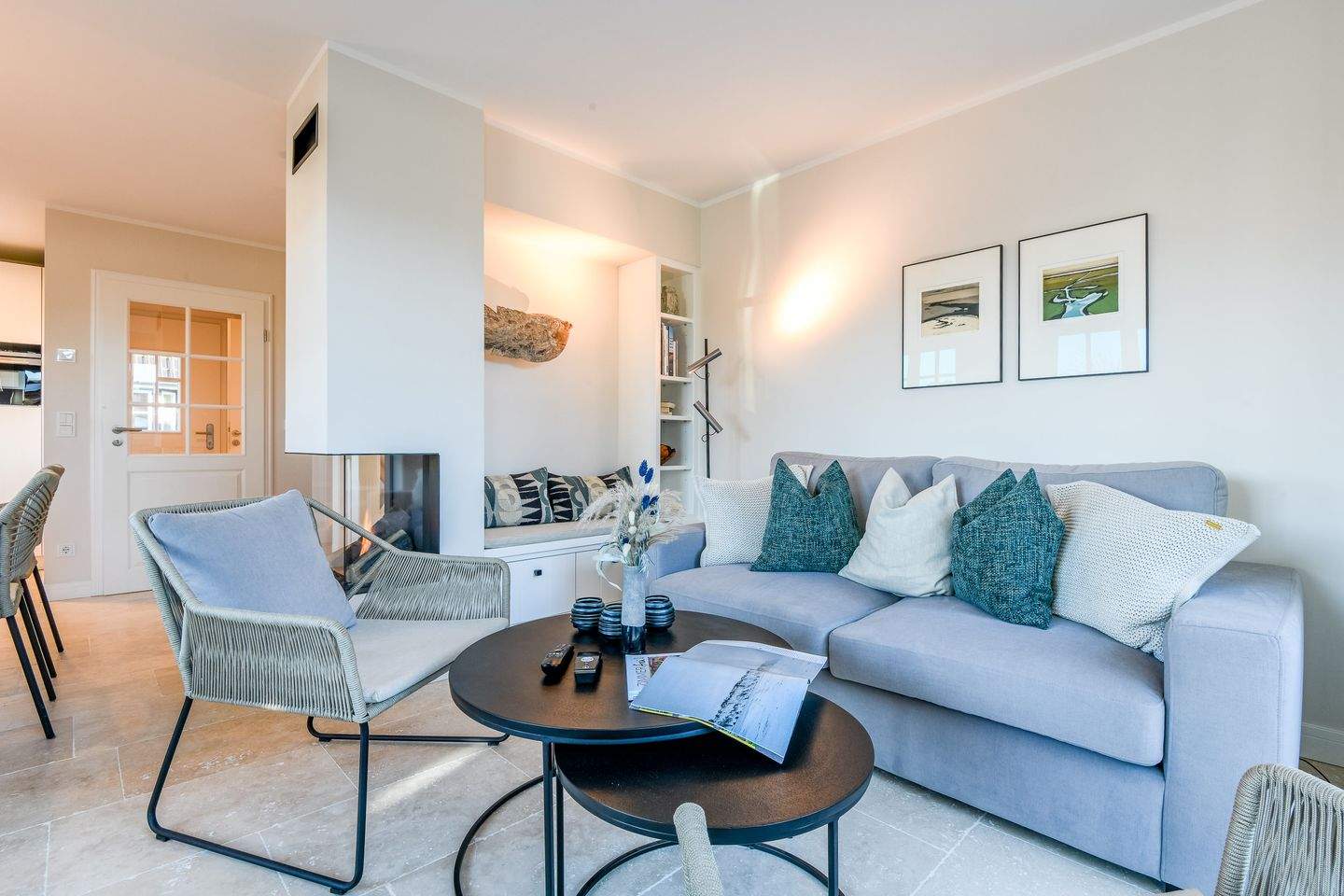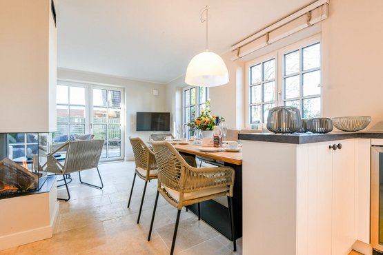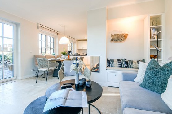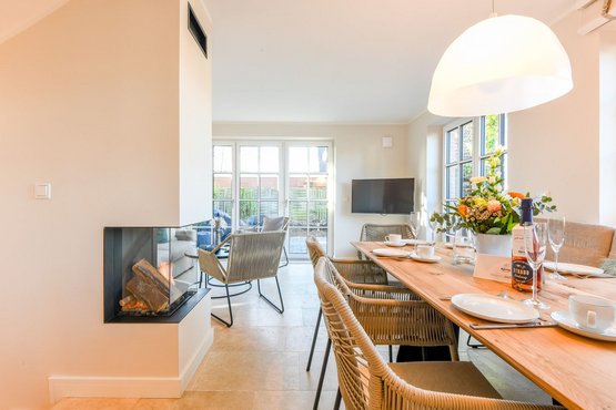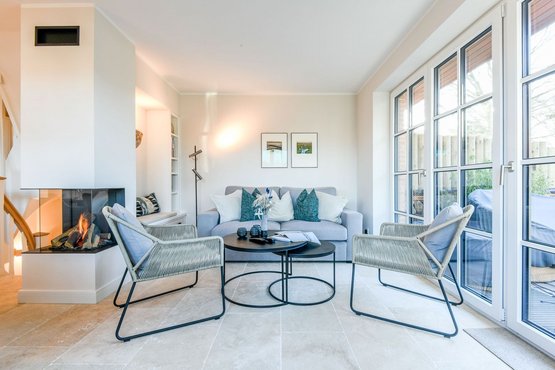 Das Wohnzimmer mit Sofaecke und Kamin lädt gleichermaßen zum Verweilen ein, wie der gemütliche Essbereich, der die gut ausgestattete Küche mit allem erdenklichen Komfort abrundet.
