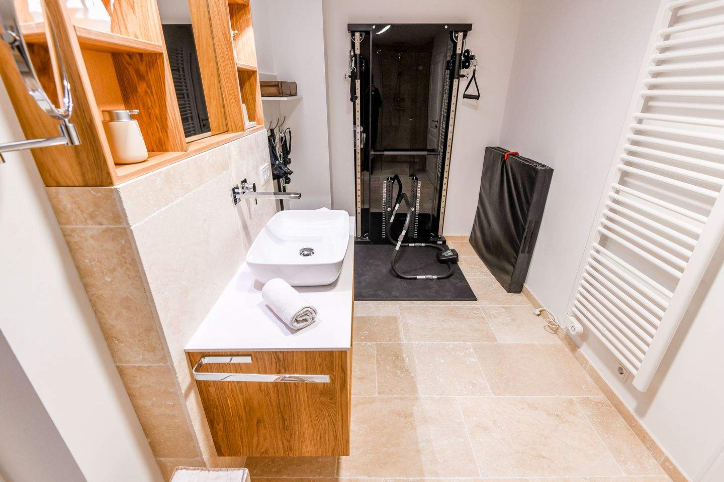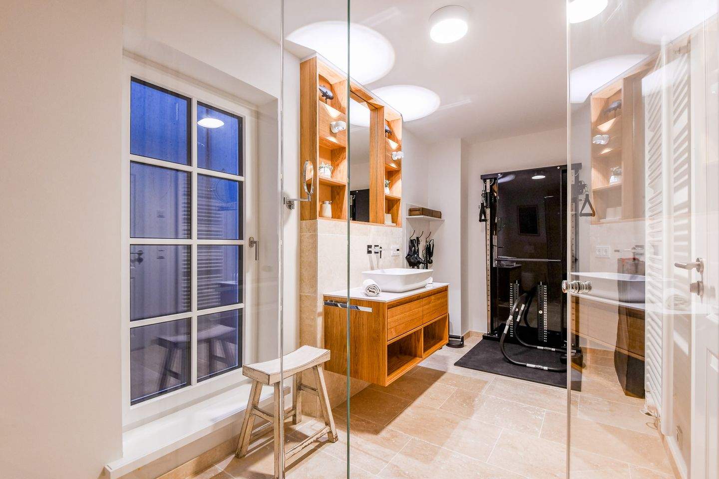 2. Wellnessbad mit ebenerdiger Regendusche, Fußbodenheizung und Fitnessbereich.