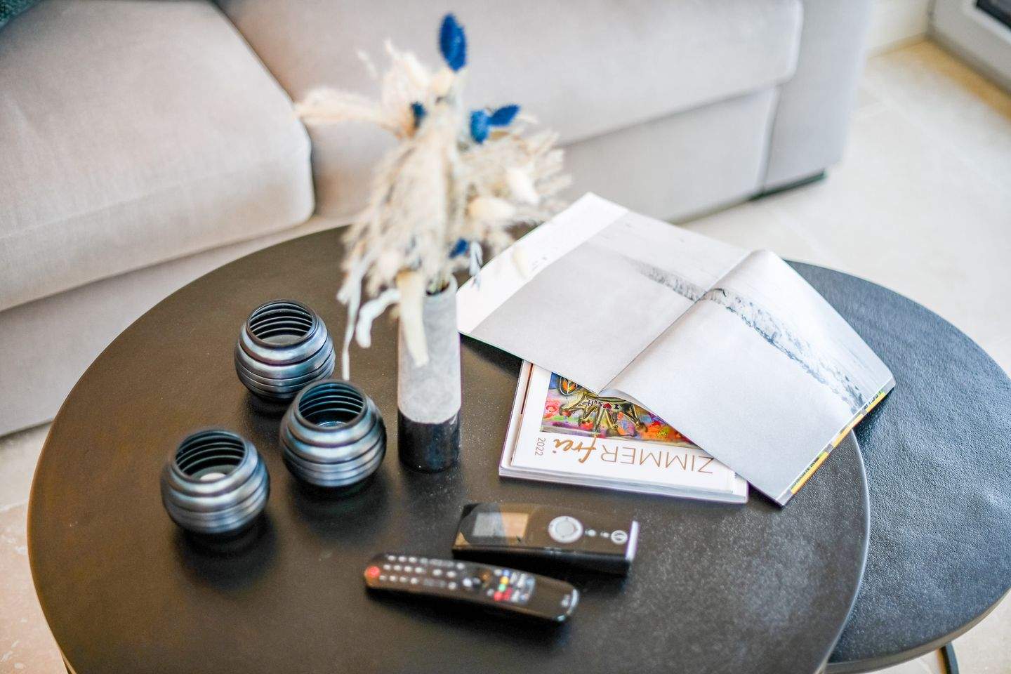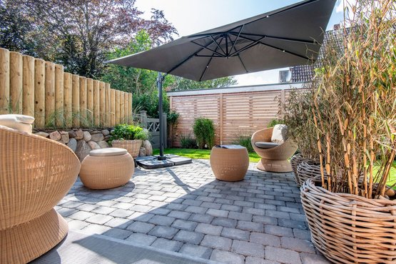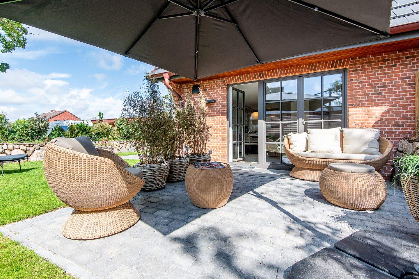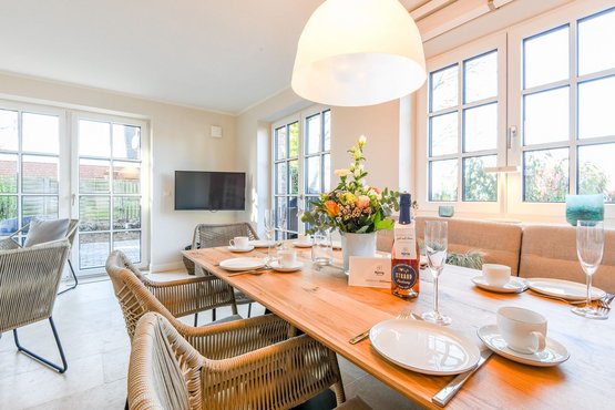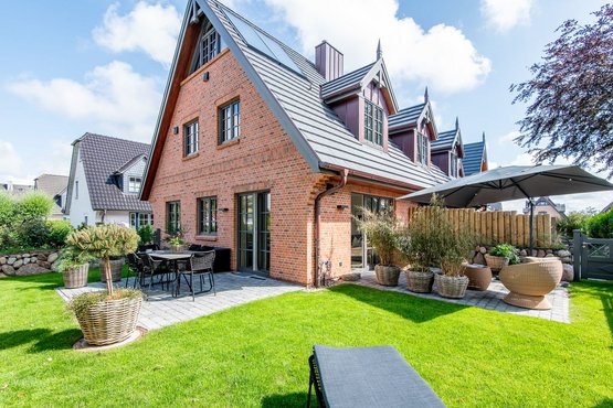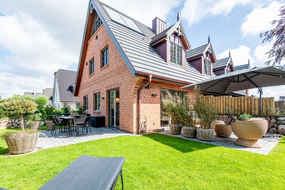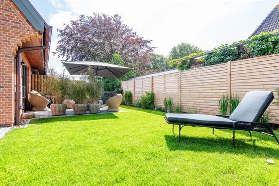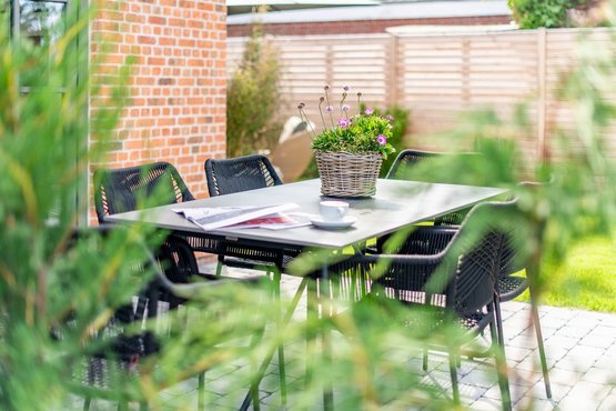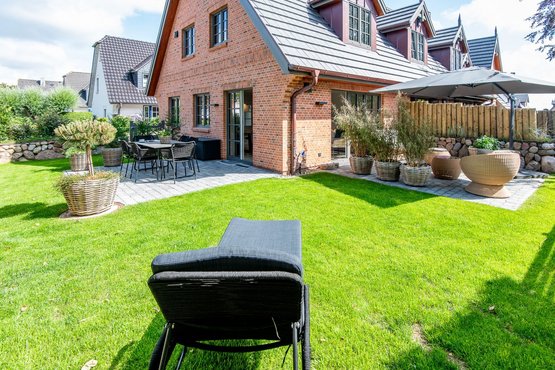 Vom Wohnzimmer gelangt man auf die sonnigen und schön bepflanzte Terrassen, auf denen man ganz wunderbar entspannen kann. Die nach Westen gerichtete Terrasse ist möbliert mit gemütlichen Loungemöbeln und auf der zweiten Terrasse finden 6 Personen an einem großen Tisch platz um dort die lauen Sommerabende verbringen zu können. Zudem gibt es eine Sonnenliege, deren Stellfläche variable zu gestalten ist.