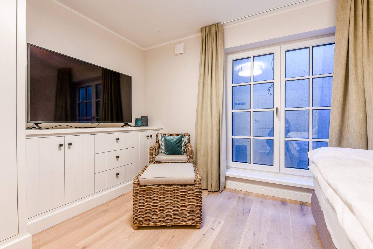 2. Schlafzimmer mit Boxspring-Doppelbett (180 x 200 cm), eingebautem Kleiderschrank, TV.