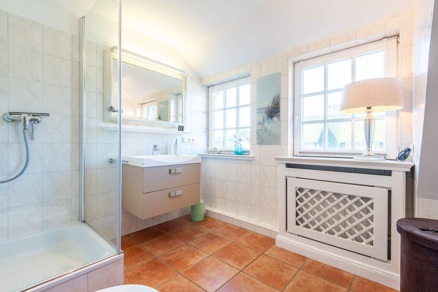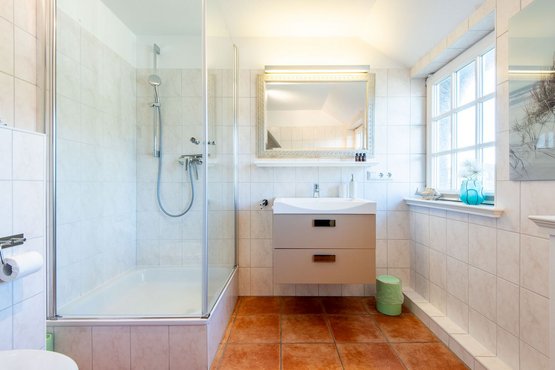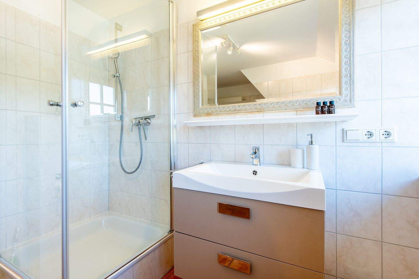 1. Badezimmer mit Dusche, Tageslicht und Fön.