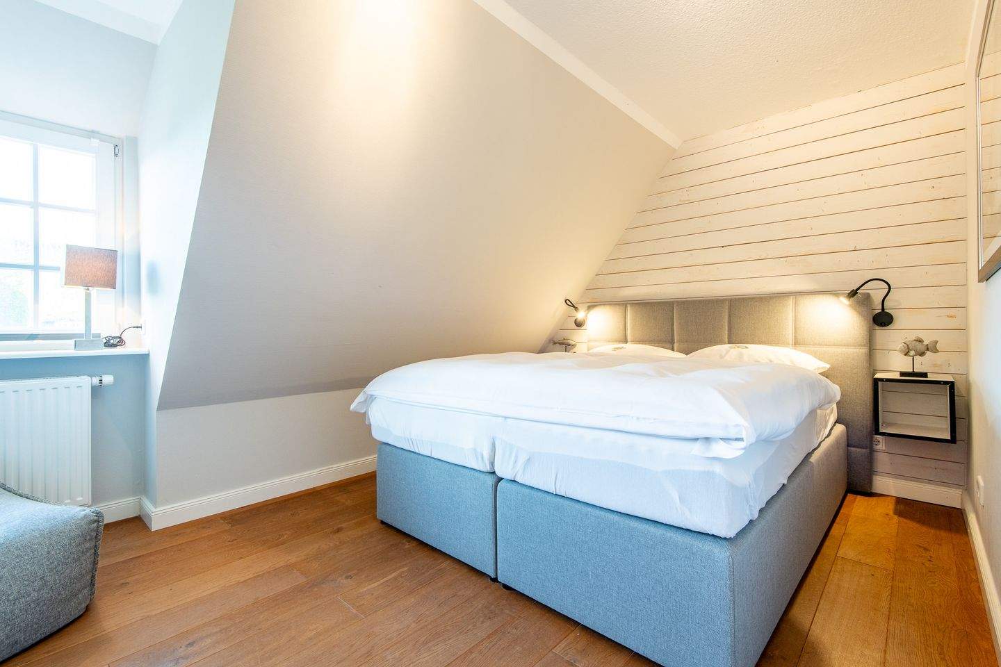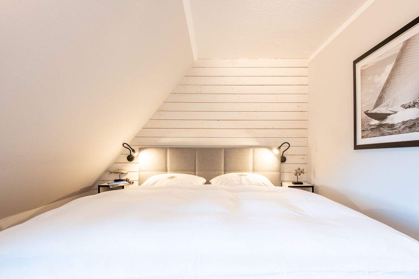 Die Wohnung verfügt über ein komfortables Schlafzimmer mit einem Doppelbett sowie ein Badezimmer mit Dusche, das durch natürliche Lichtquellen erhellt wird. Genießen Sie den Dünenblick und die Nähe zum Strand, während Sie in dieser stilvollen Ferienwohnung entspannen.