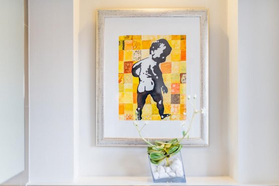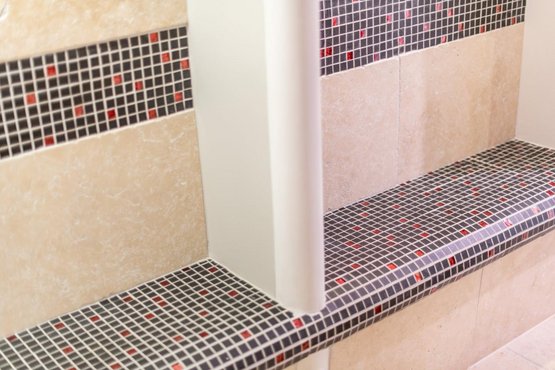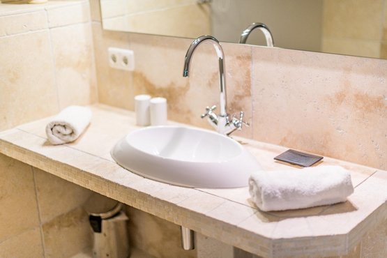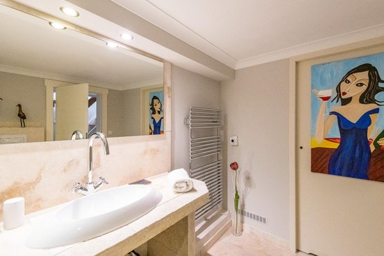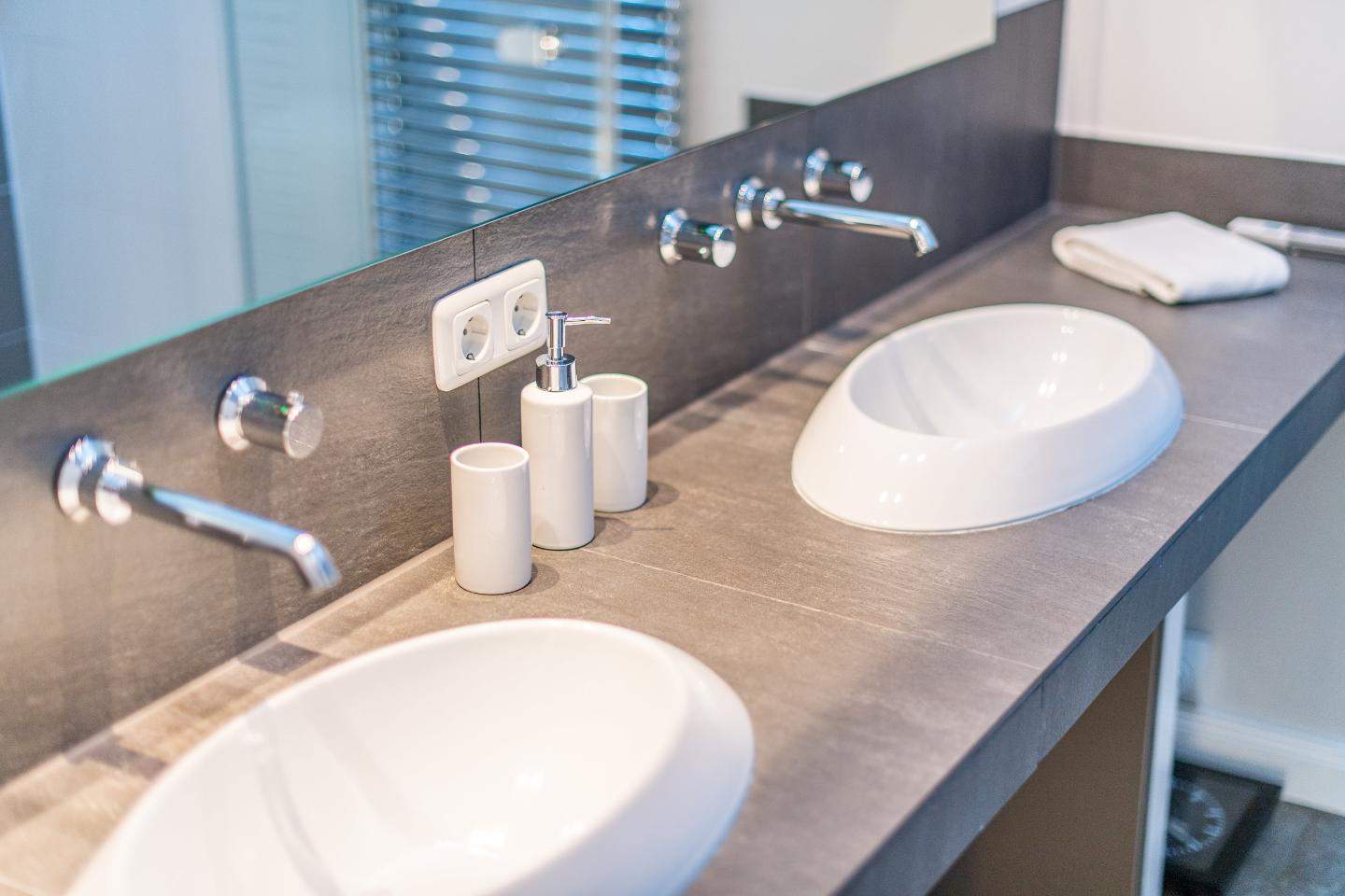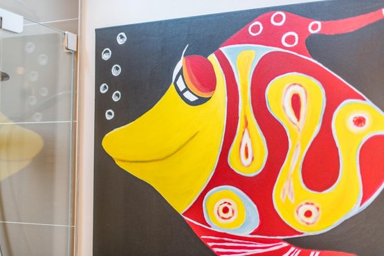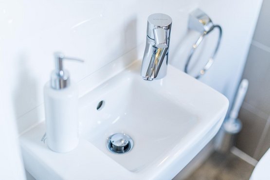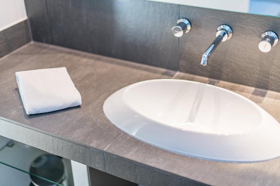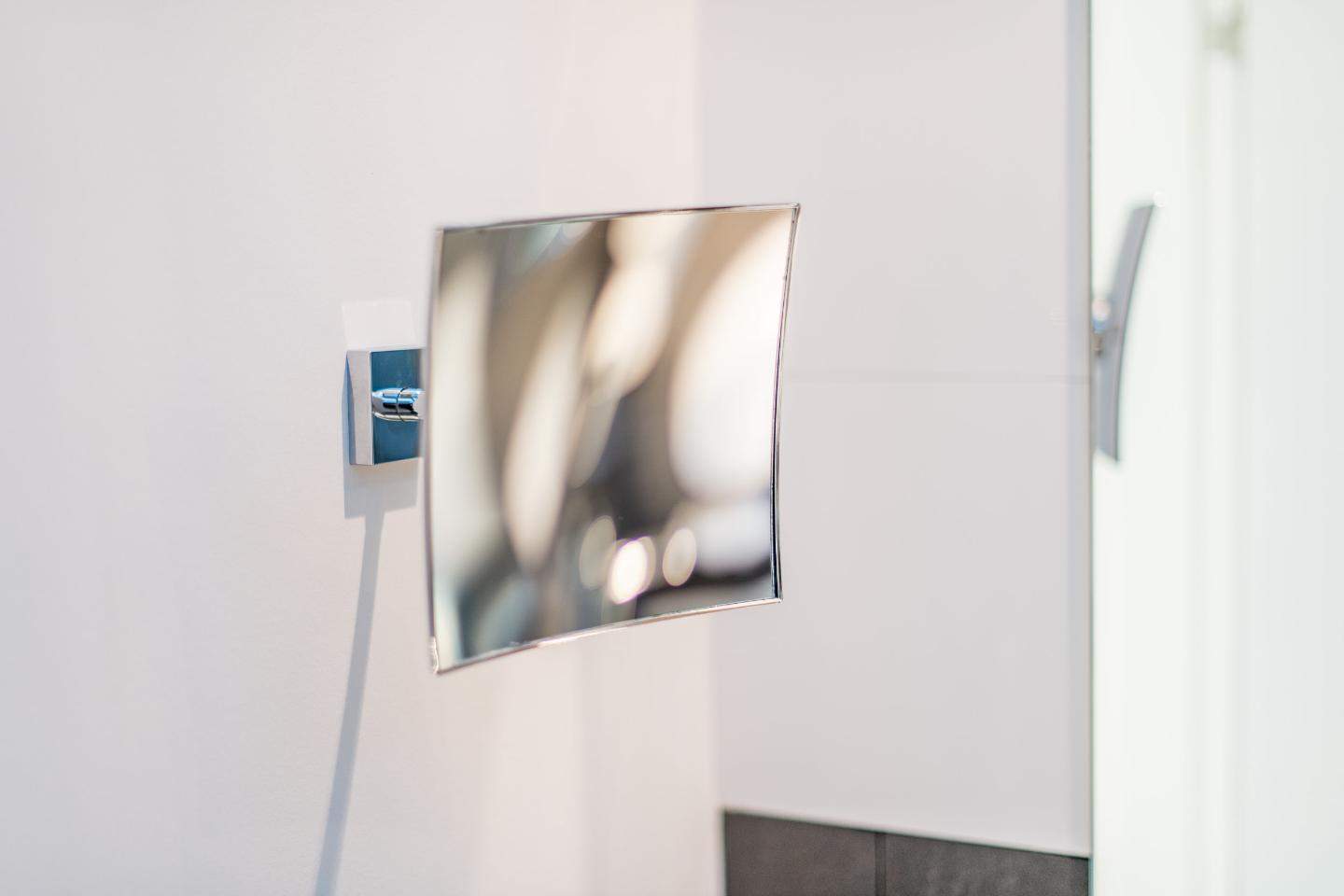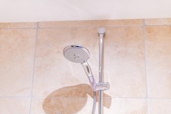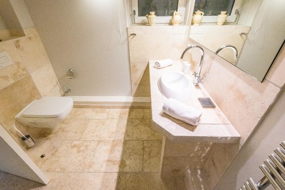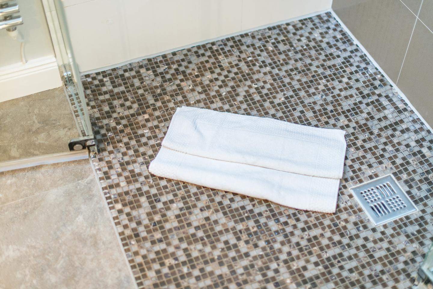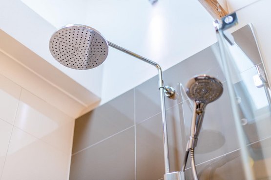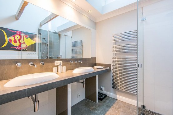 Badezimmer (Duschbad) mit ebenerdiger (Regen-) Dusche, WC, Föhn, Handtuchwärmer und Tageslicht.