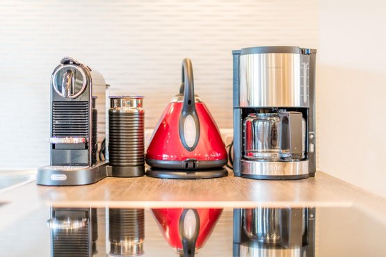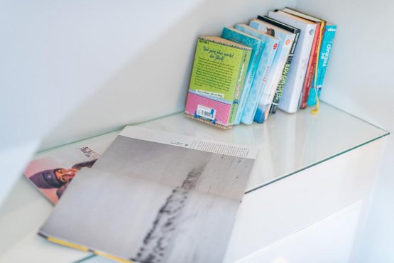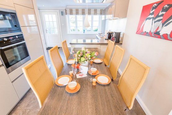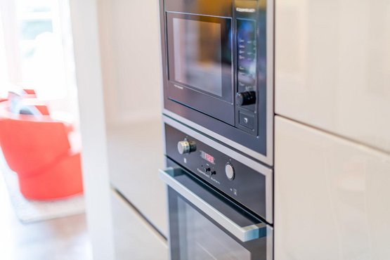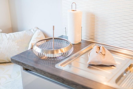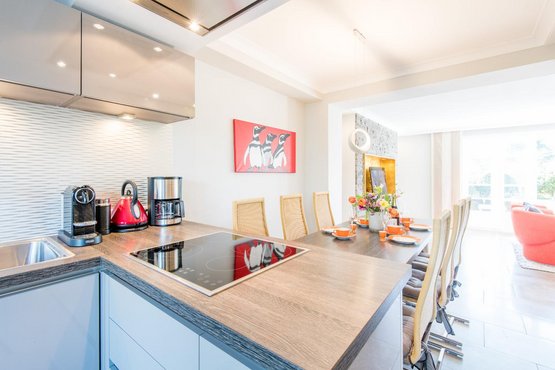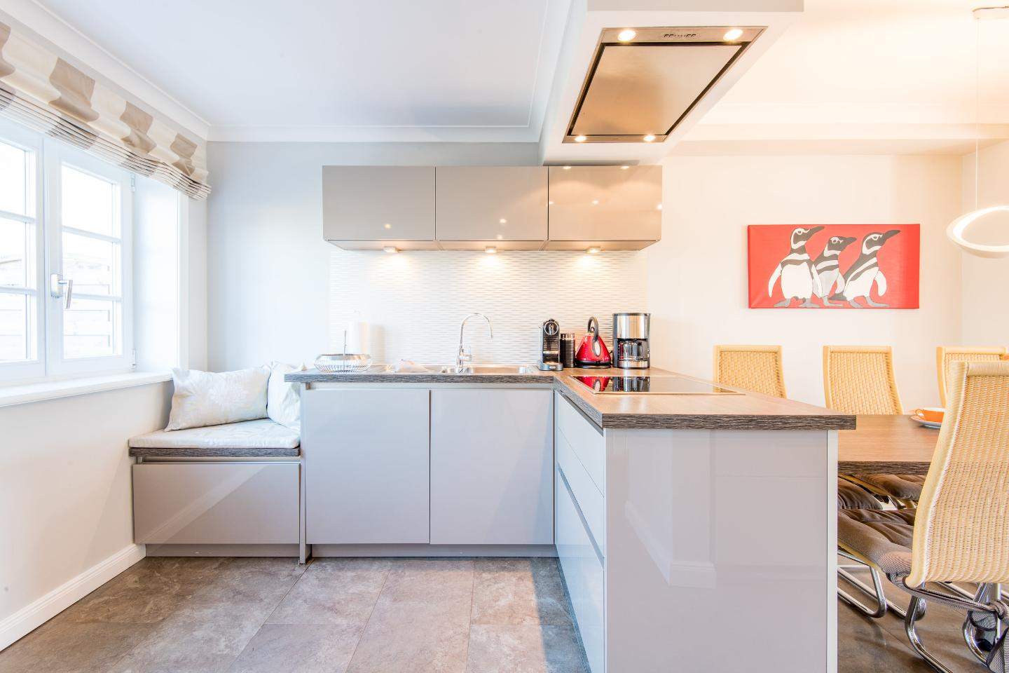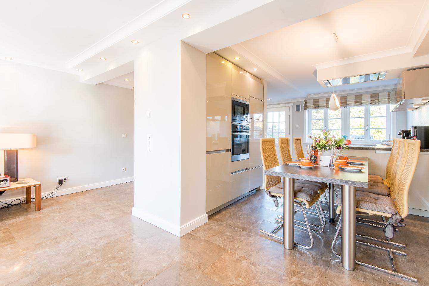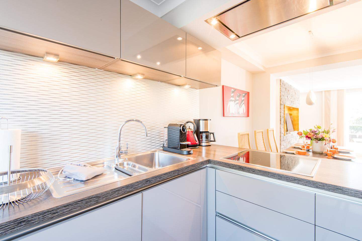 Offene Küche mit Geschirrspüler, Backofen und höchstem Komfort. Direkter Zugang zur sonnigen Terrasse nach Westen. Windgeschützte Garten-Terrasse nach Osten.