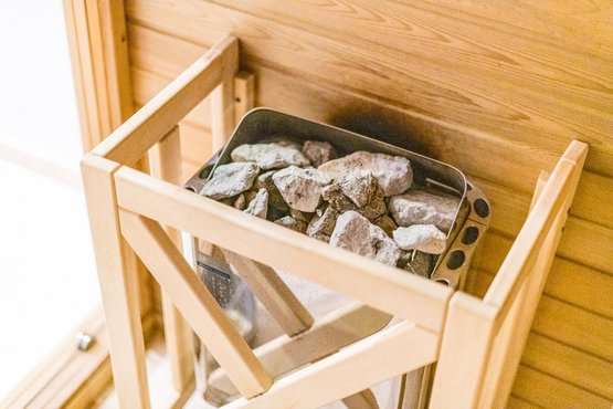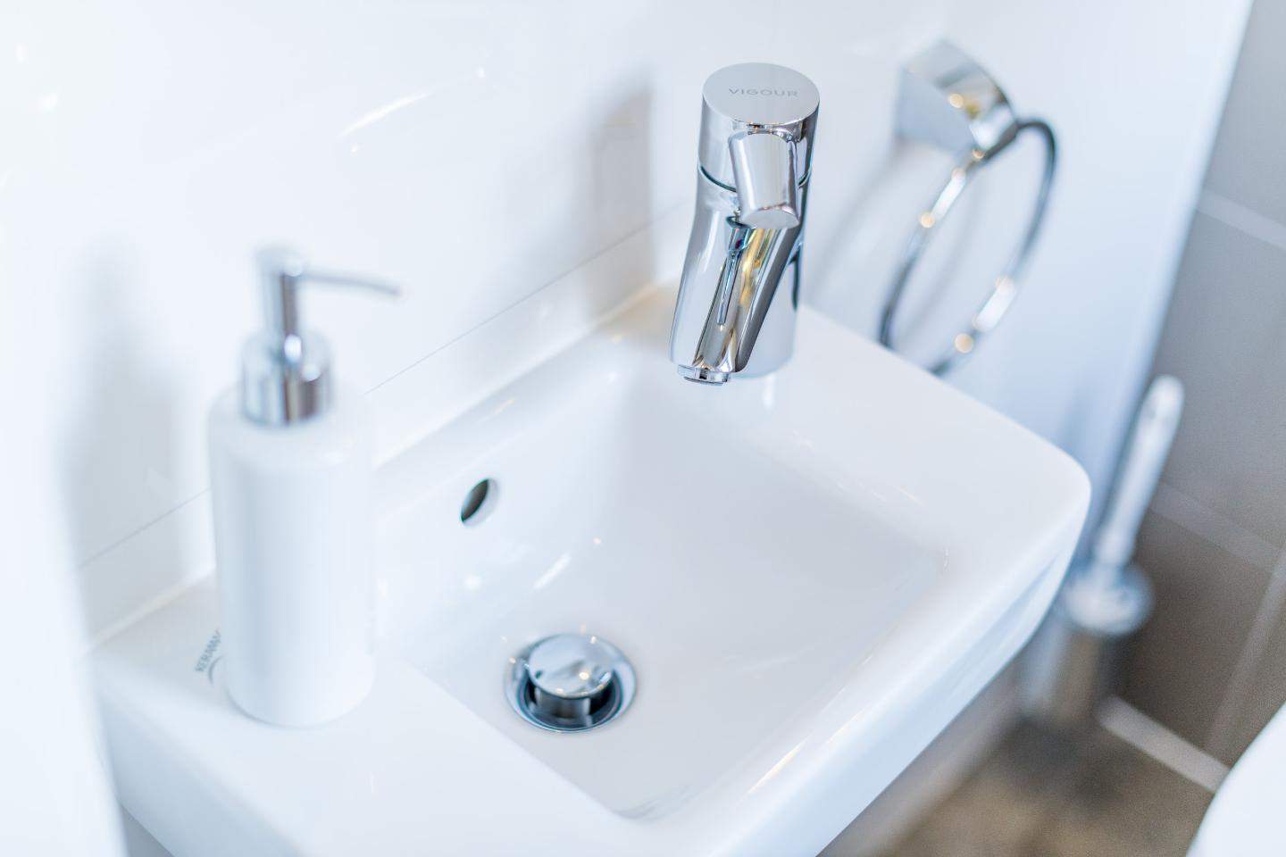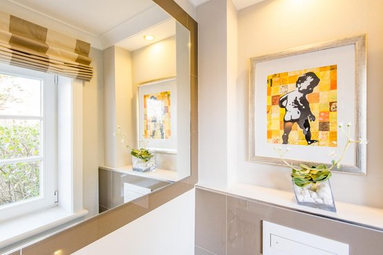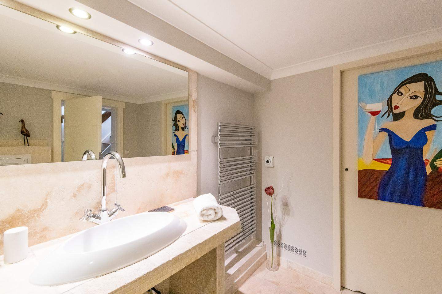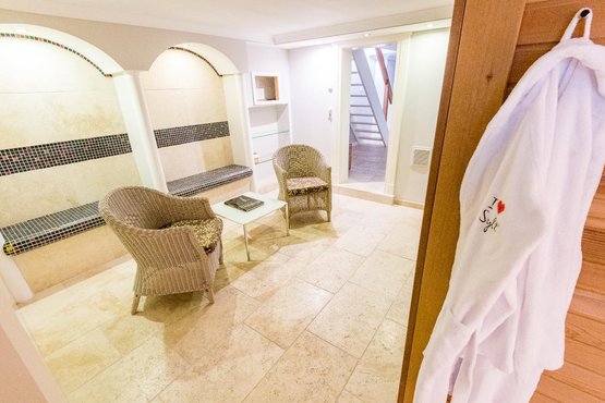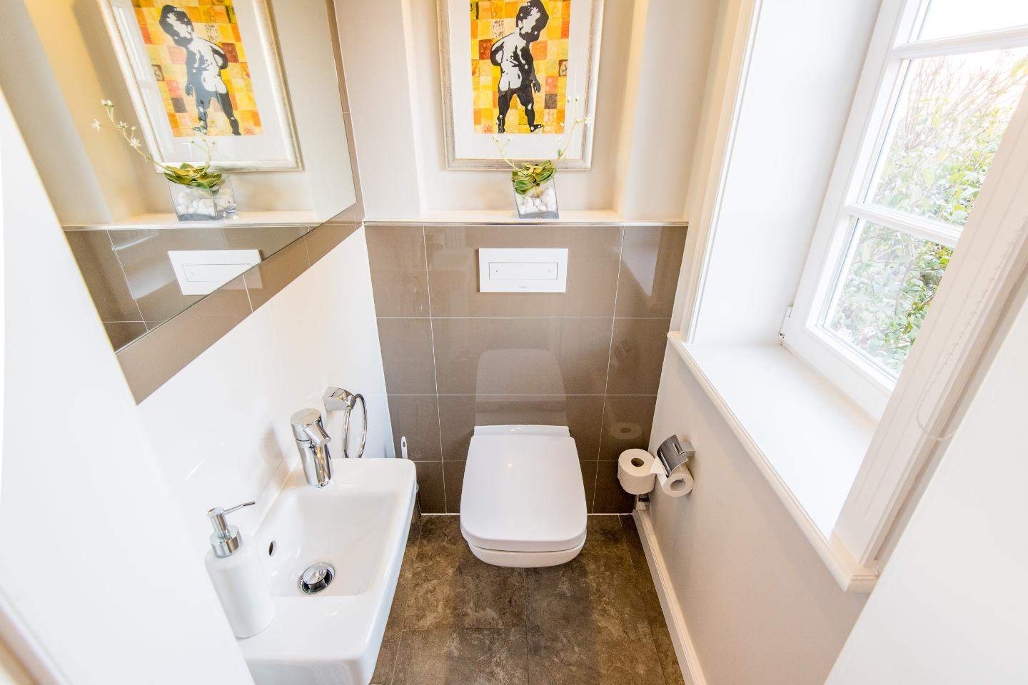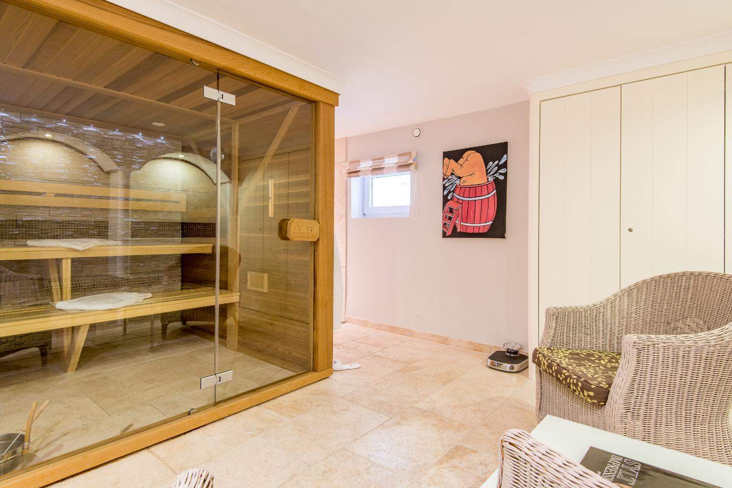 Großer Wellnessbereich mit Sauna, Dusche, TV und separatem WC. Gäste-WC im Eingangsbereich. Telefon, WLAN, Pkw-Stellplatz, Waschmaschine und Trockner vorhanden.