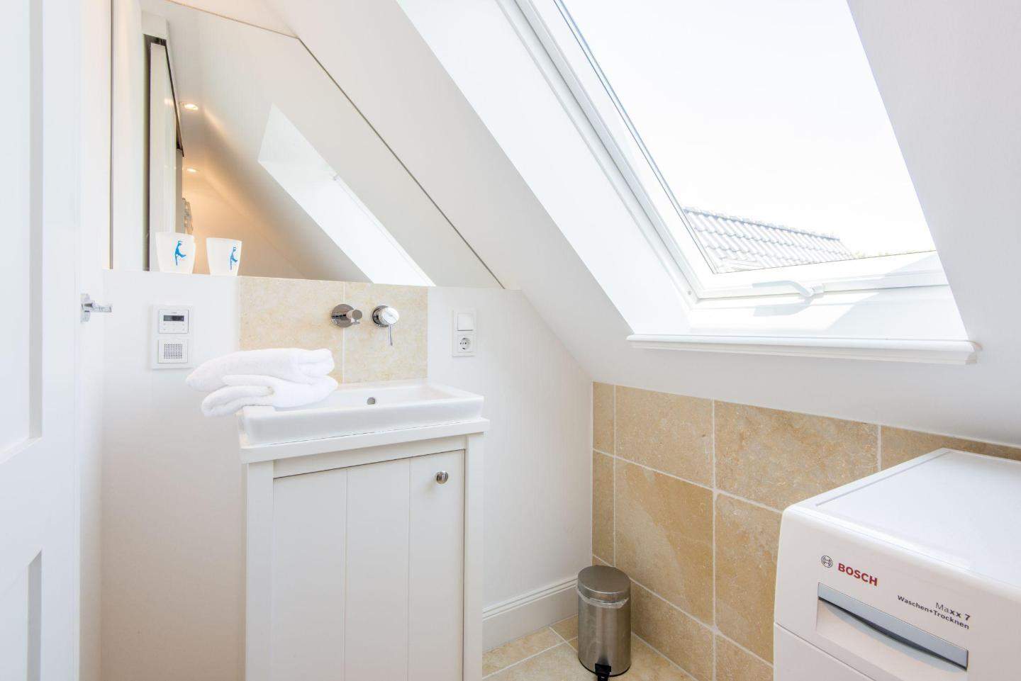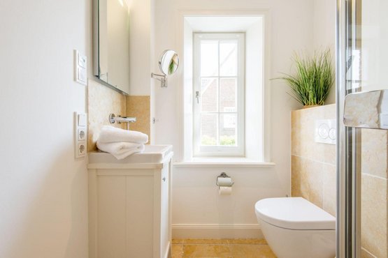 Separates WC mit Handtuchwärmer, Waschtrockner und Tageslicht.