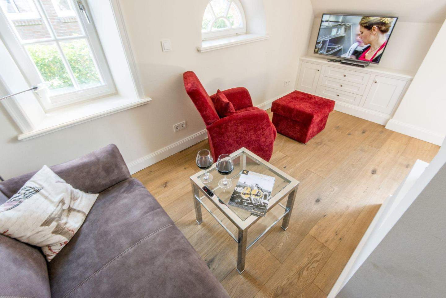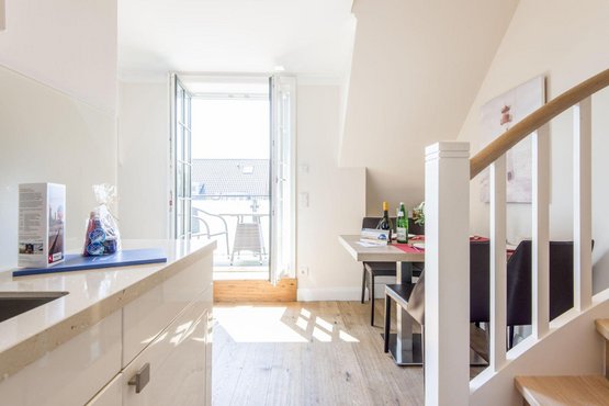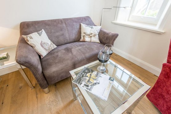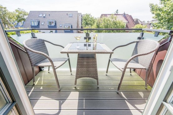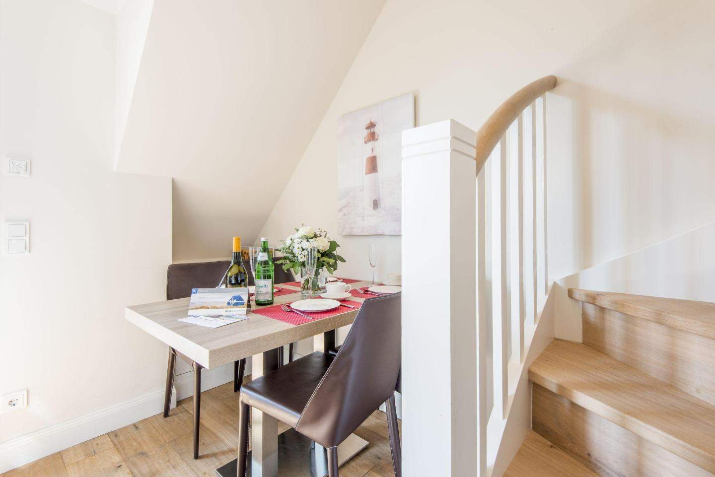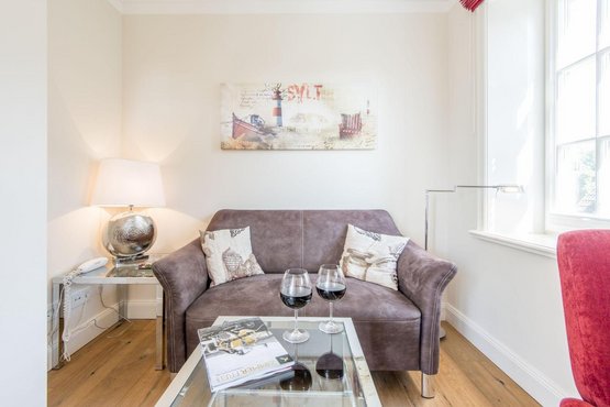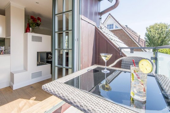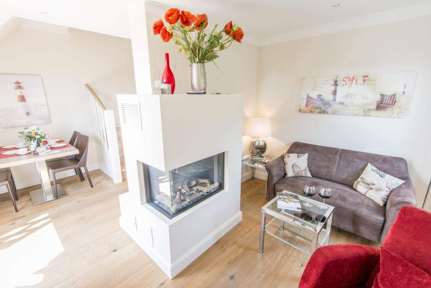 Exklusive 3-Zimmer-Ferienwohnung im 'Haus Victor' mit ca. 58 m² über 2 Ebenen (OG, DG) für bis zu 4 Personen. Sehr modern und komfortabel. Strandnahe Lage in Westerland auf Sylt. Kamin, Balkon. Wellnessbereich mit Sauna im Haus. Nichtraucherwohnung. Wohnzimmer mit Sofa, Sessel, TV und Kamin. Esstisch für 4 Personen. Direkter Zugang zum möblierten Balkon nach Süden.