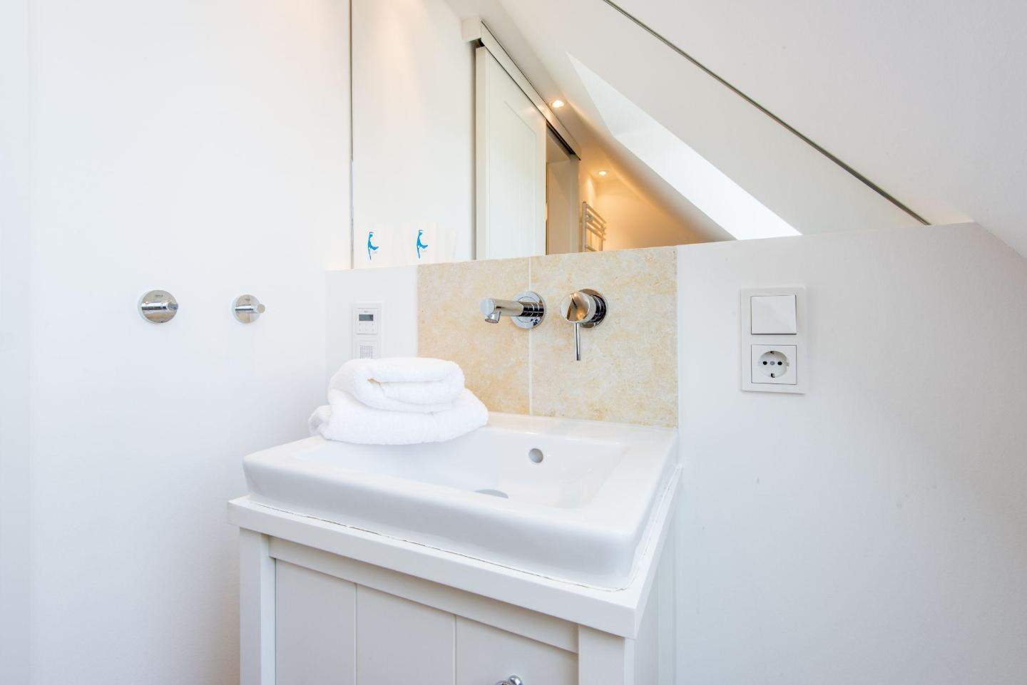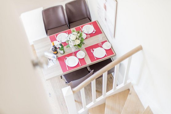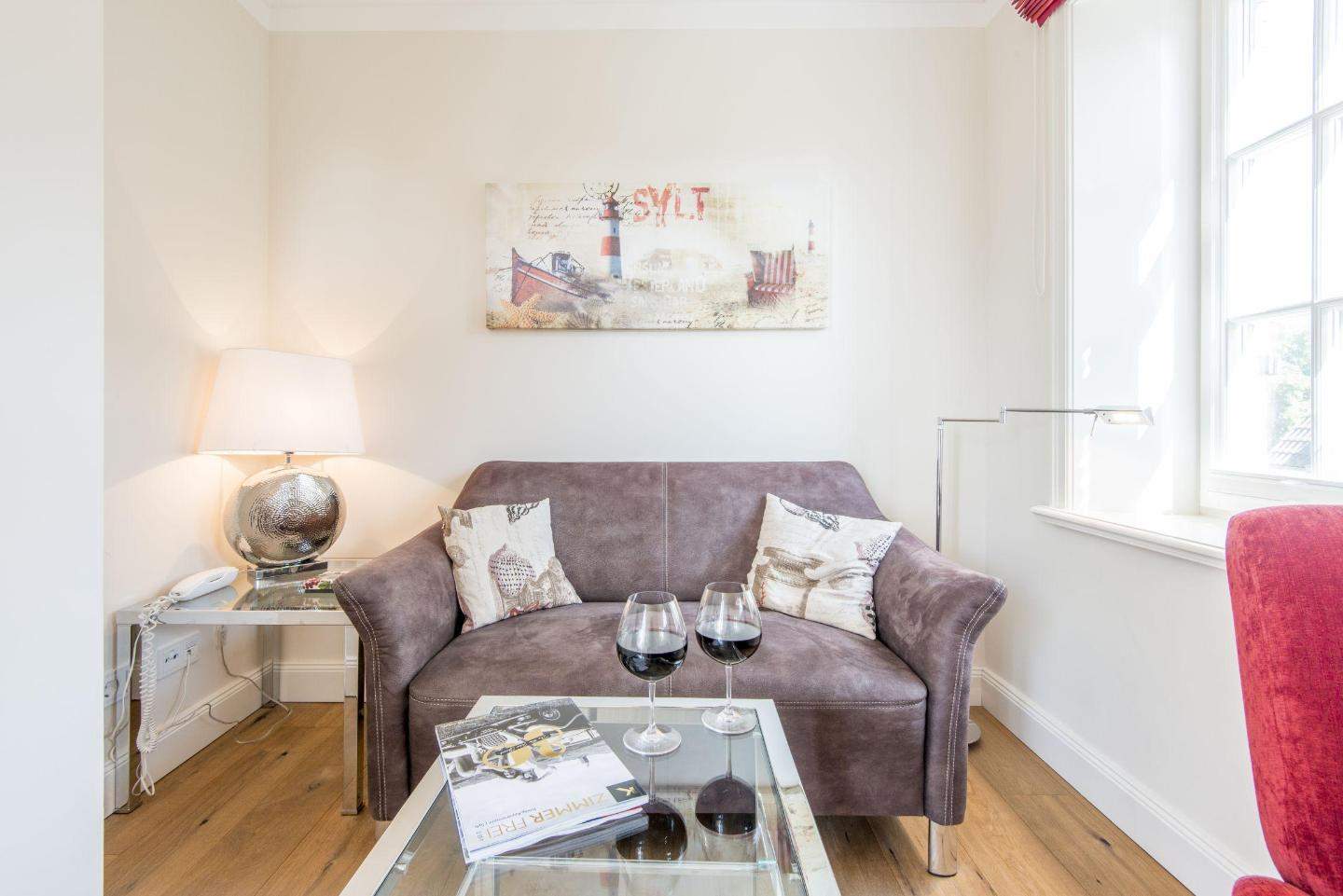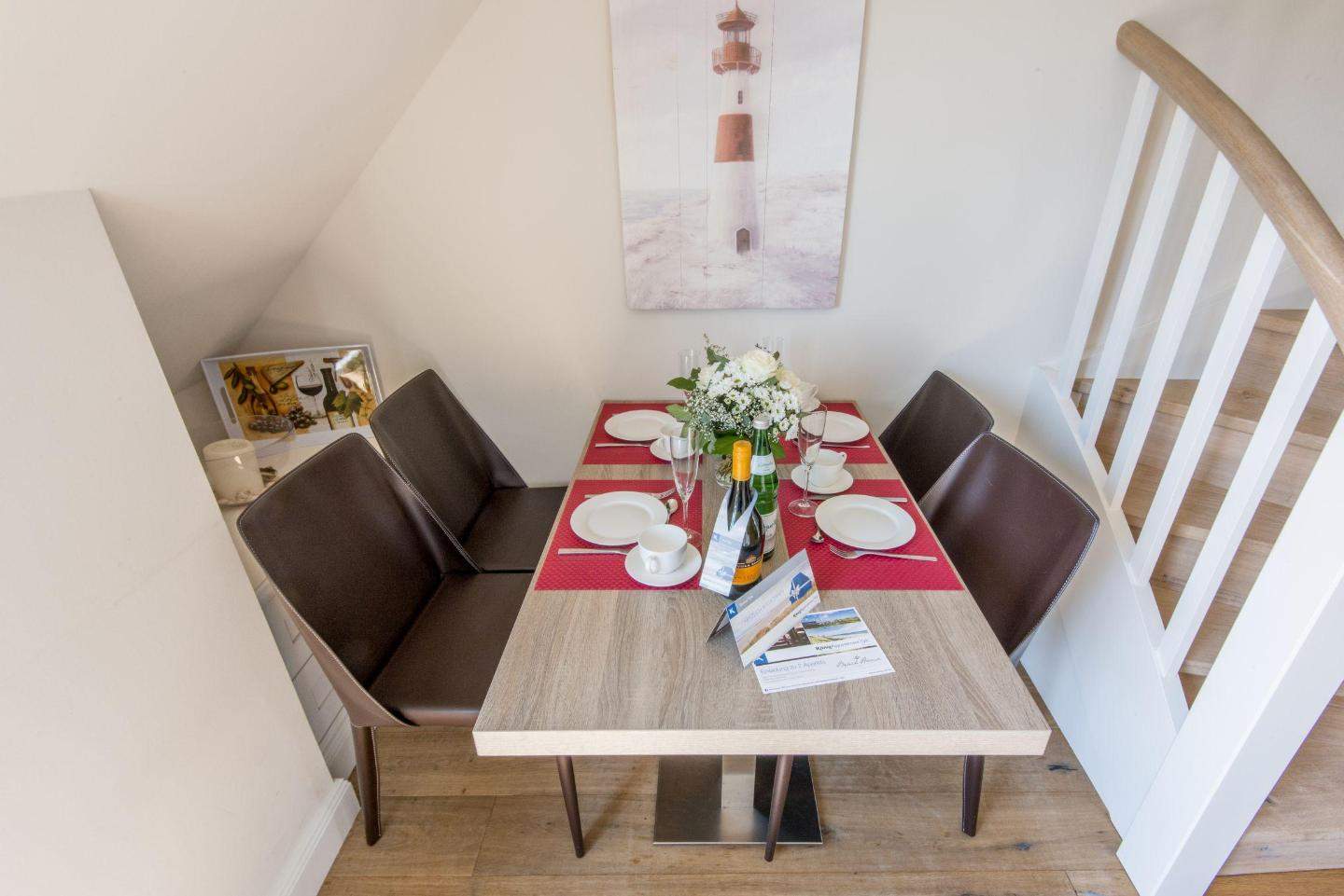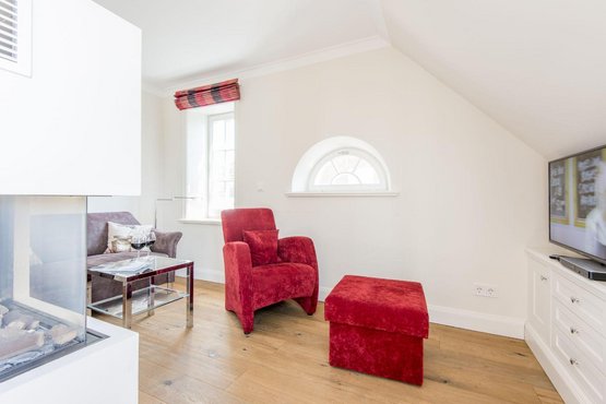 Exklusive 3-Zimmer-Ferienwohnung im 'Haus Victor' mit ca. 58 m² über 2 Ebenen (OG, DG) für bis zu 4 Personen. Sehr modern und komfortabel. Strandnahe Lage in Westerland auf Sylt. Kamin, Balkon. Wellnessbereich mit Sauna im Haus. Nichtraucherwohnung. Wohnzimmer mit Sofa, Sessel, TV und Kamin. Esstisch für 4 Personen. Direkter Zugang zum möblierten Balkon nach Süden.