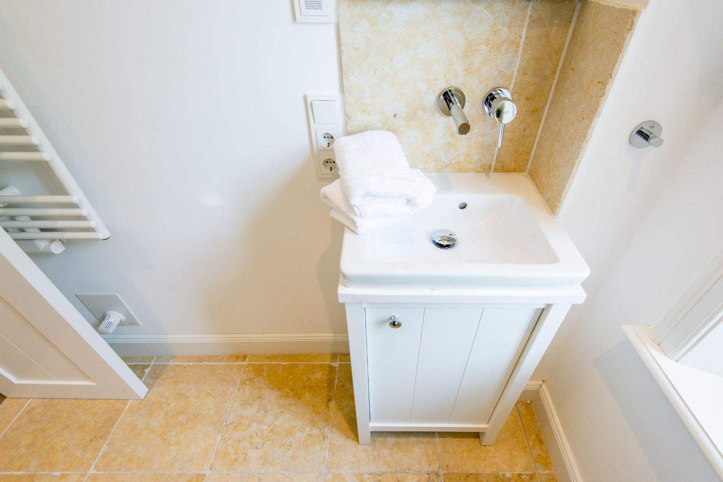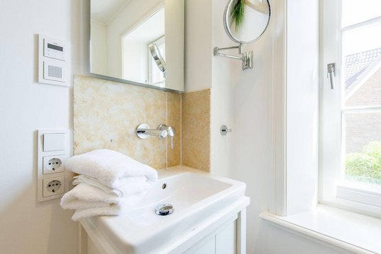 Badezimmer (Duschbad) mit ebenerdiger Regendusche, WC, Handtuchwärmer, Fön und Tageslicht.