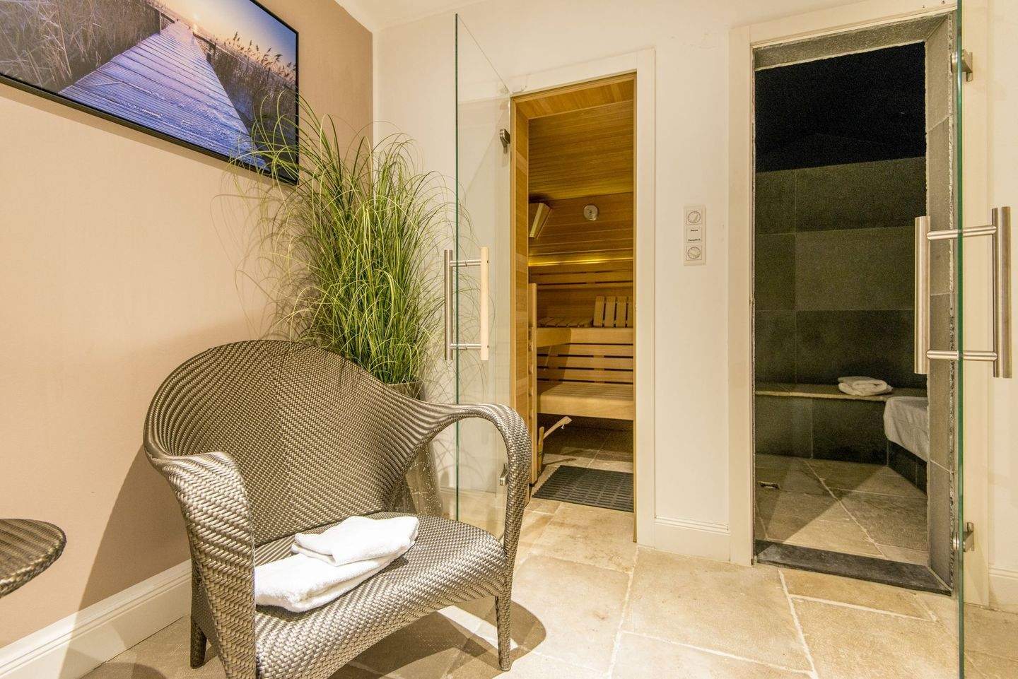 Flur mit Garderobe im Eingangsbereich. Wellnessbereich mit Sauna, Dampfbad, Schwalldusche und Ruheraum im Haus. Pkw-Stellplatz, WLAN (ohne Gewähr). Telefon vorhanden.