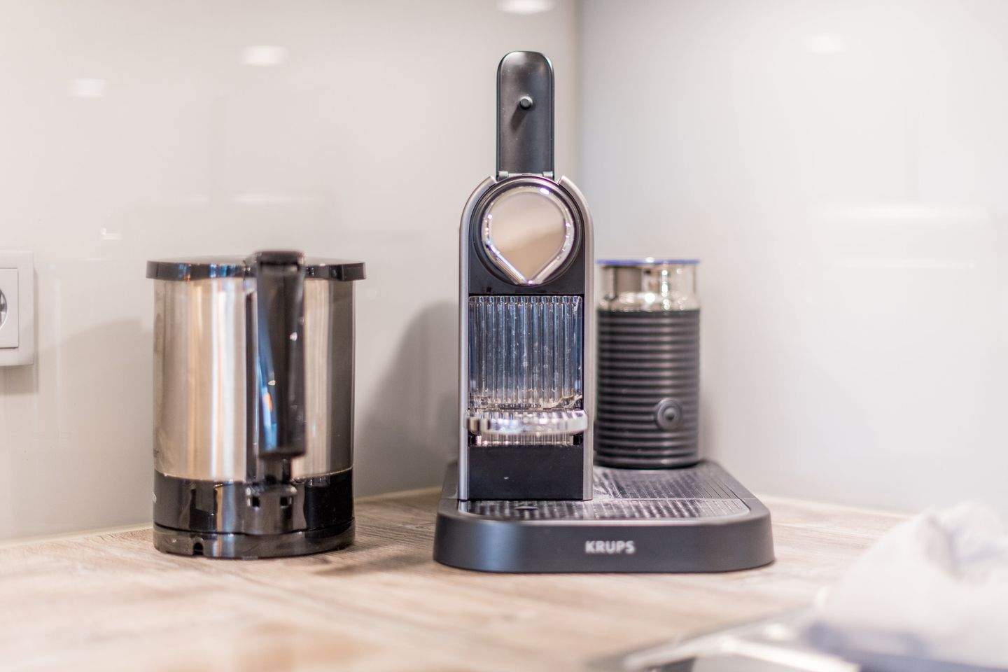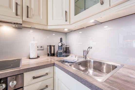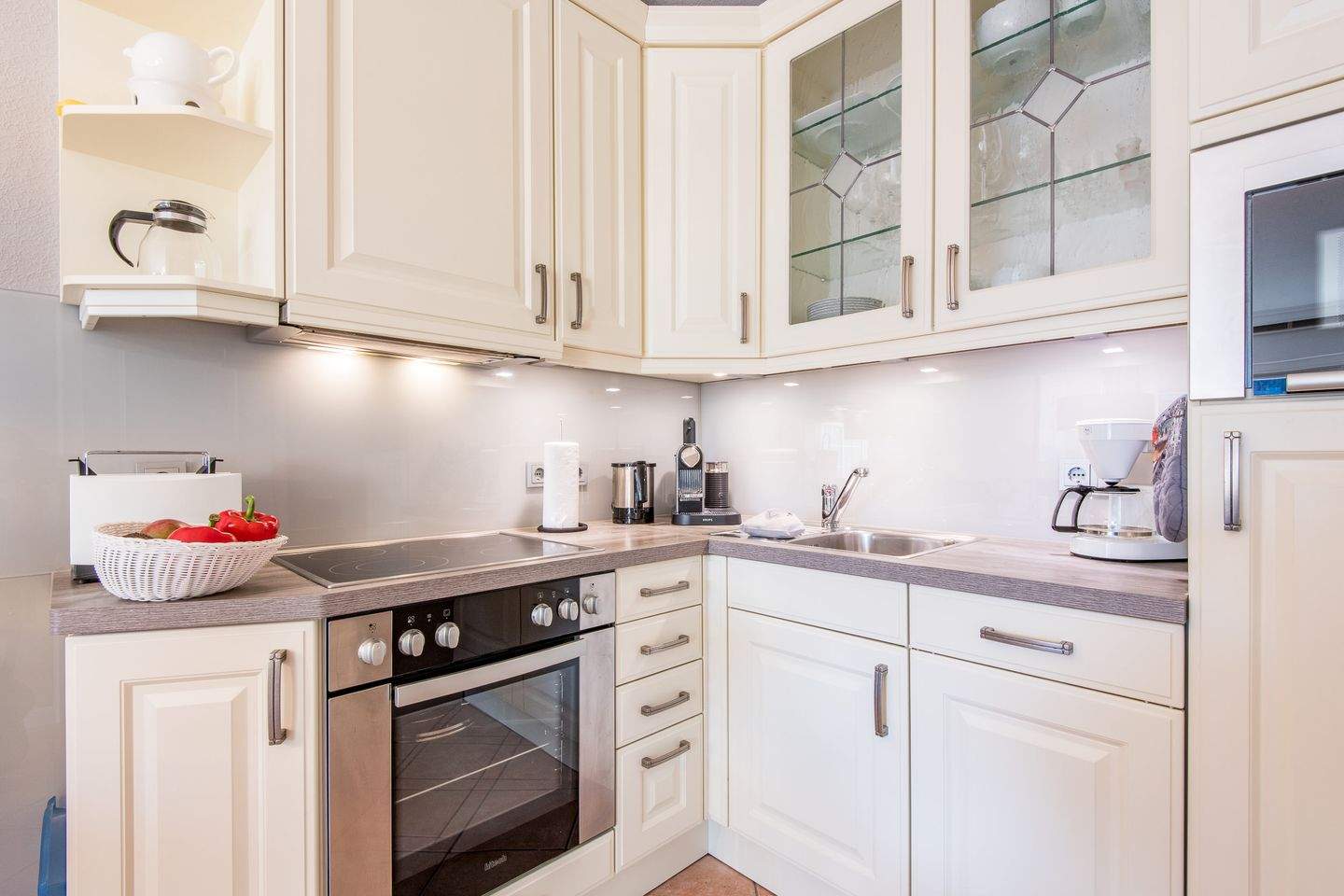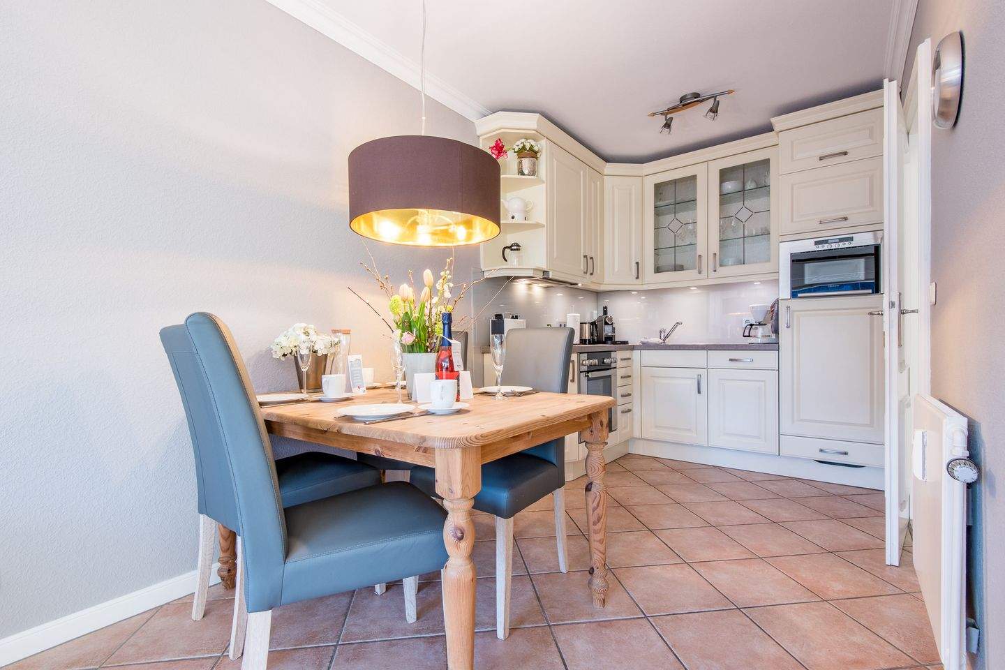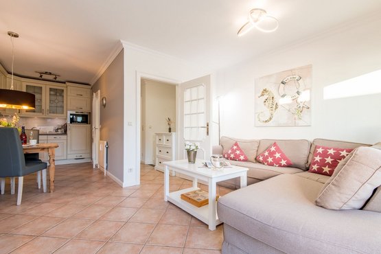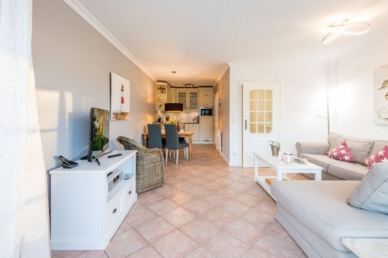 Helles Wohnzimmer mit gemütlicher Sitzgarnitur, TV, SONORO Stereoanlage mit CD-Player und Bluetooth. Esstisch für 4 Personen. Außerdem ist die Maisonette-Wohnung mit einer Küche inkl. Spülmaschine, Ceran-Kochfeld, Nespresso-Maschine, Mikrowelle und allem modernen Komfort ausgestattet.