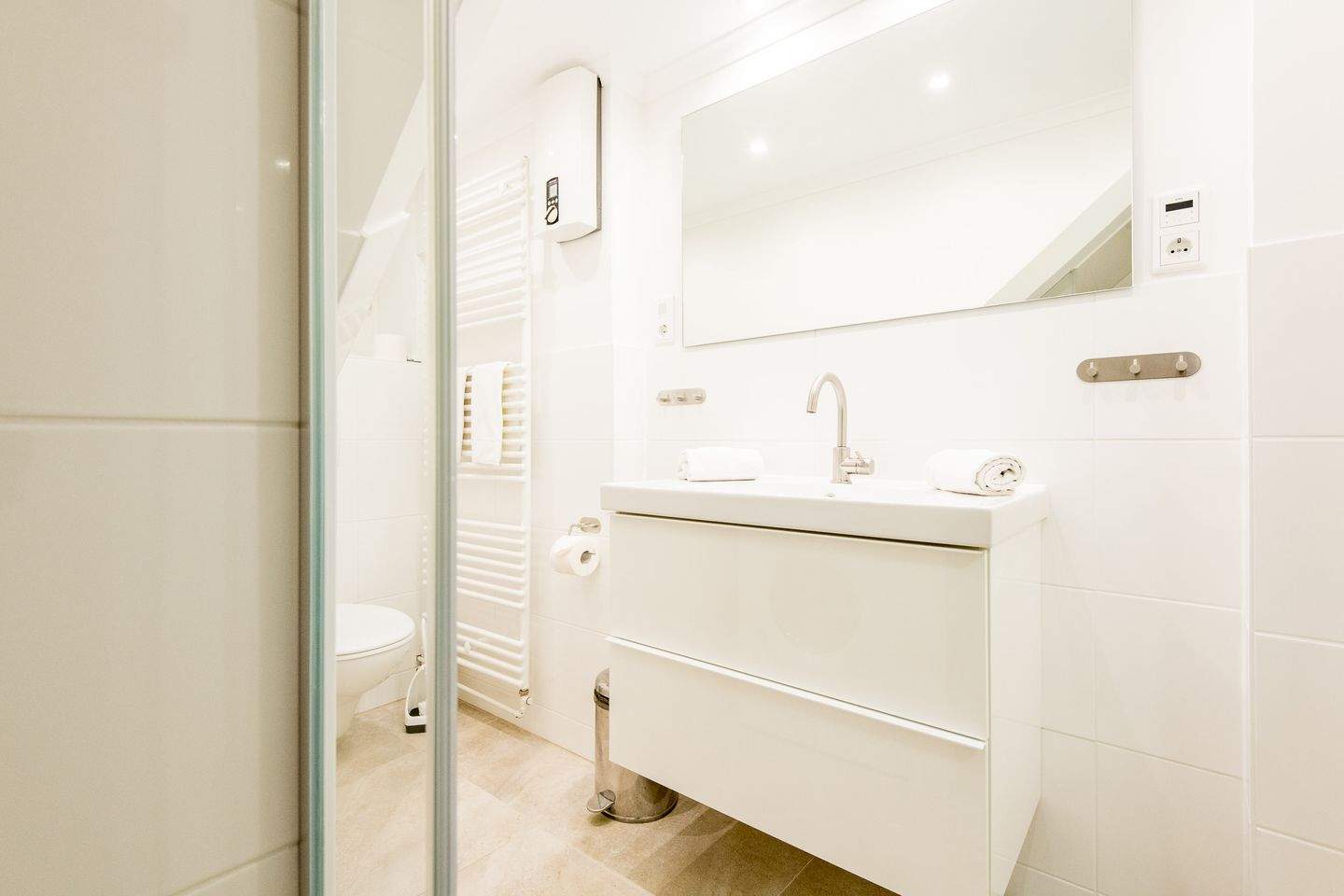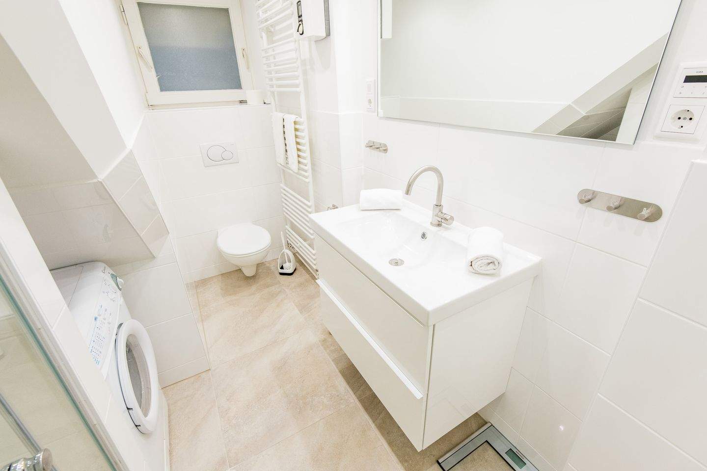Modernes Badezimmer (Vollbad) mit Dusche, WC, Waschtisch, Waschmaschine, Föhn und Handtuchwärmer.