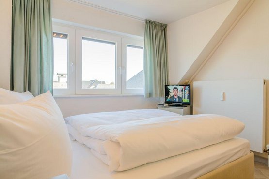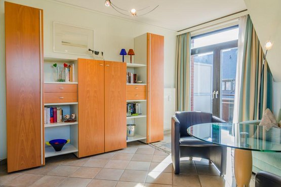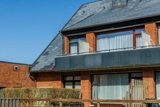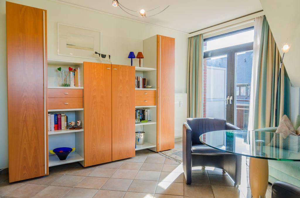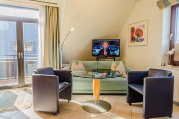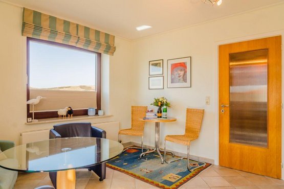Gemütliche 2-Zimmer-Ferienwohnung 'Hildebrand' im 'Inken-Michels-Hus' mit ca. 45 m² auf 1 Ebene (OG) für bis zu 2 Personen. Mit Balkon nach Süden. Sehr strandnahe Lage beim Südwäldchen in Westerland auf Sylt und nicht weit von der Innenstadt. Direkt gegenüber des Sylt Aquariums. Genießen Sie den herrlichen Blick auf die Dünen. Nichtraucherwohnung. Hunde willkommen. Wohnzimmer mit Sofa, Sesseln, TV und direktem Zugang zum möblierten Balkon nach Süden.
