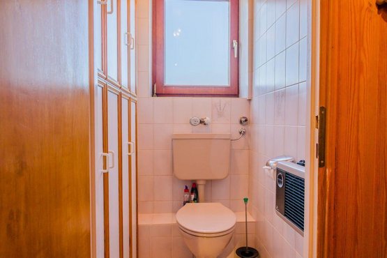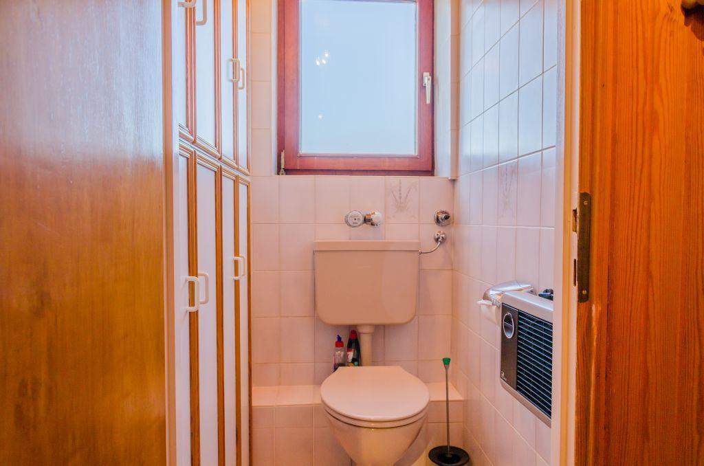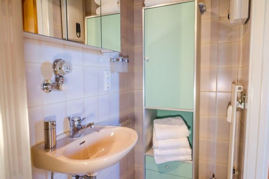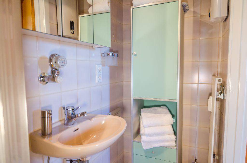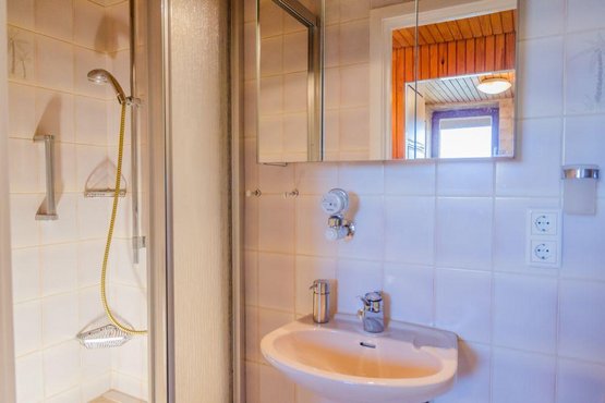 Badezimmer (Duschbad) mit Dusche und Föhn. Separates WC.