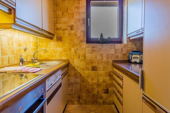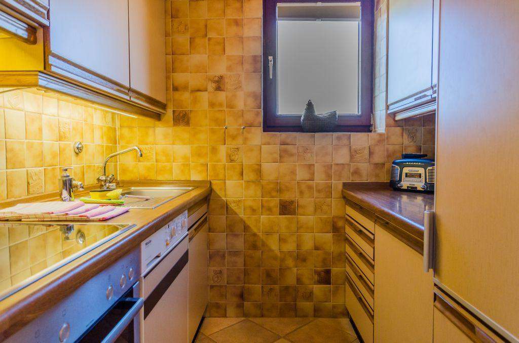 Küche mit 4-flammigem Herd, Waschtrockner und viel Komfort.