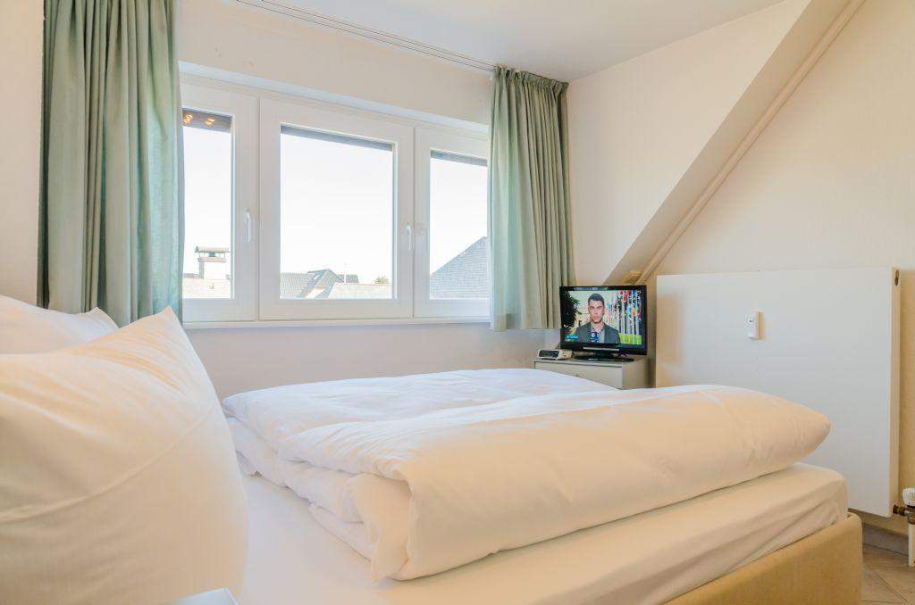 Schlafzimmer mit Doppelbett (140x200cm), Einbauschrank und TV.