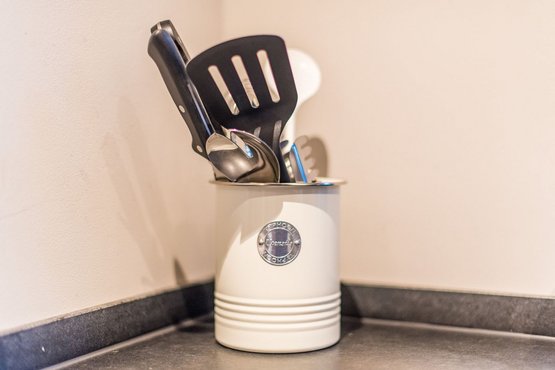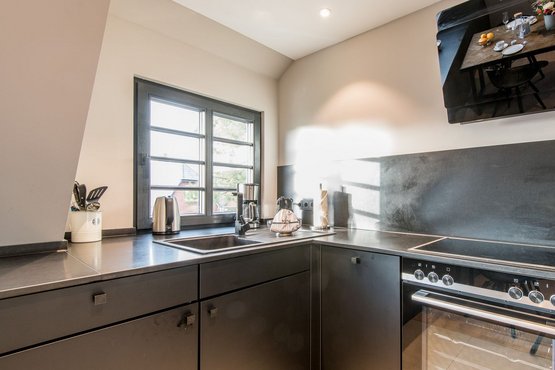 Offene Küche mit u.a. Geschirrspüler, Filterkaffee- und Nespressomaschine, Backofen und Essbereich.