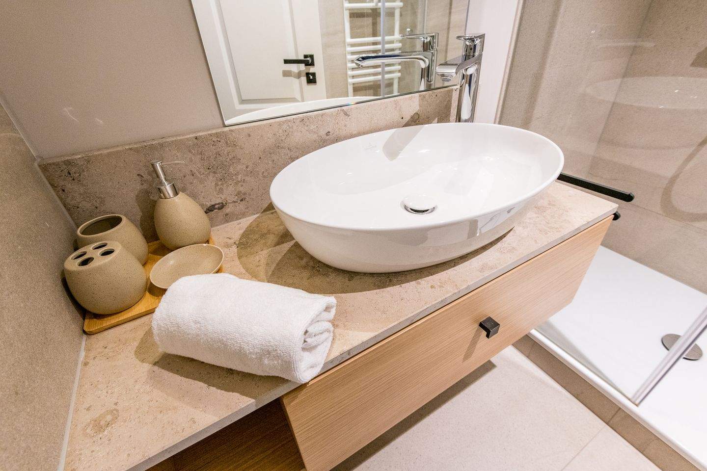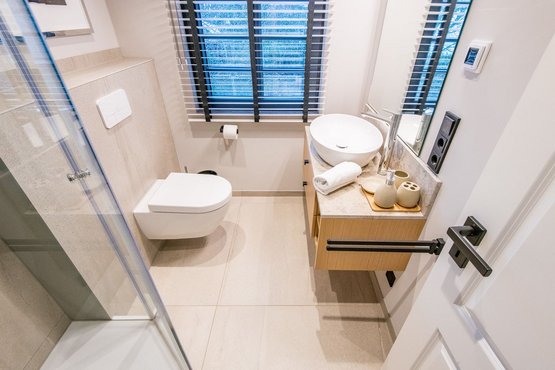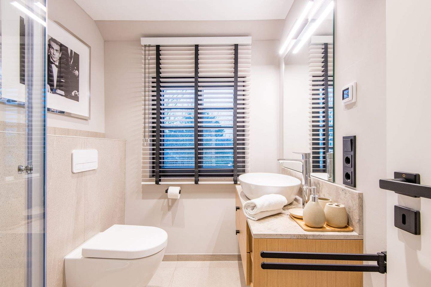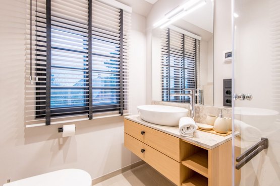 2. Badezimmer OG (Duschbad ebenerdig), WC, Föhn und Handtuchwärmer.