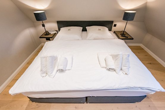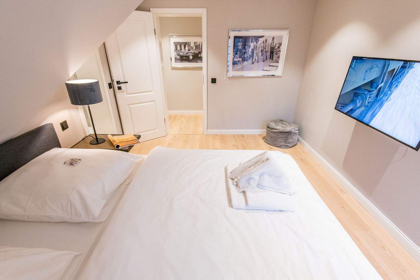 1. Schlafzimmer mit Boxspringbett (180x200cm) und TV.