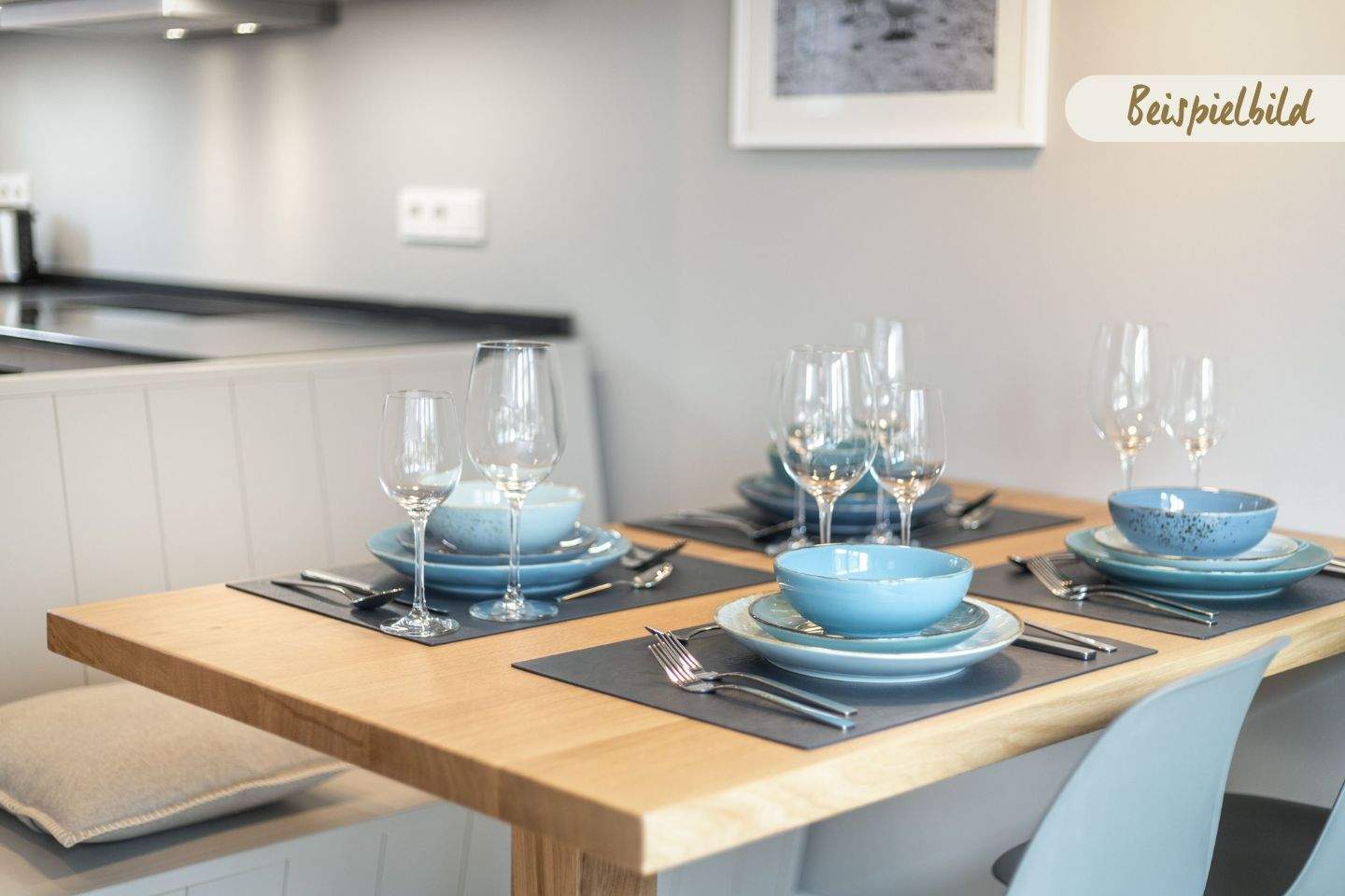Das großzügige, lichtdurchflutete Wohnzimmer lädt zum Verweilen ein und bietet neben einem gemütlichen Sofa auch einen Esstisch mit Platz für 6 Personen. Von hier aus gelangen Sie direkt zur Süd-, und Westterrasse, wo Sie die Sonne und frische Meeresluft genießen können.