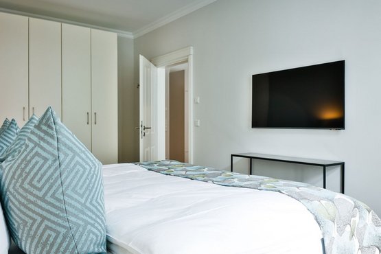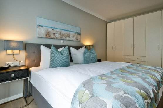 1. Schlafzimmer mit Boxspringbett (180x200cm) und TV.